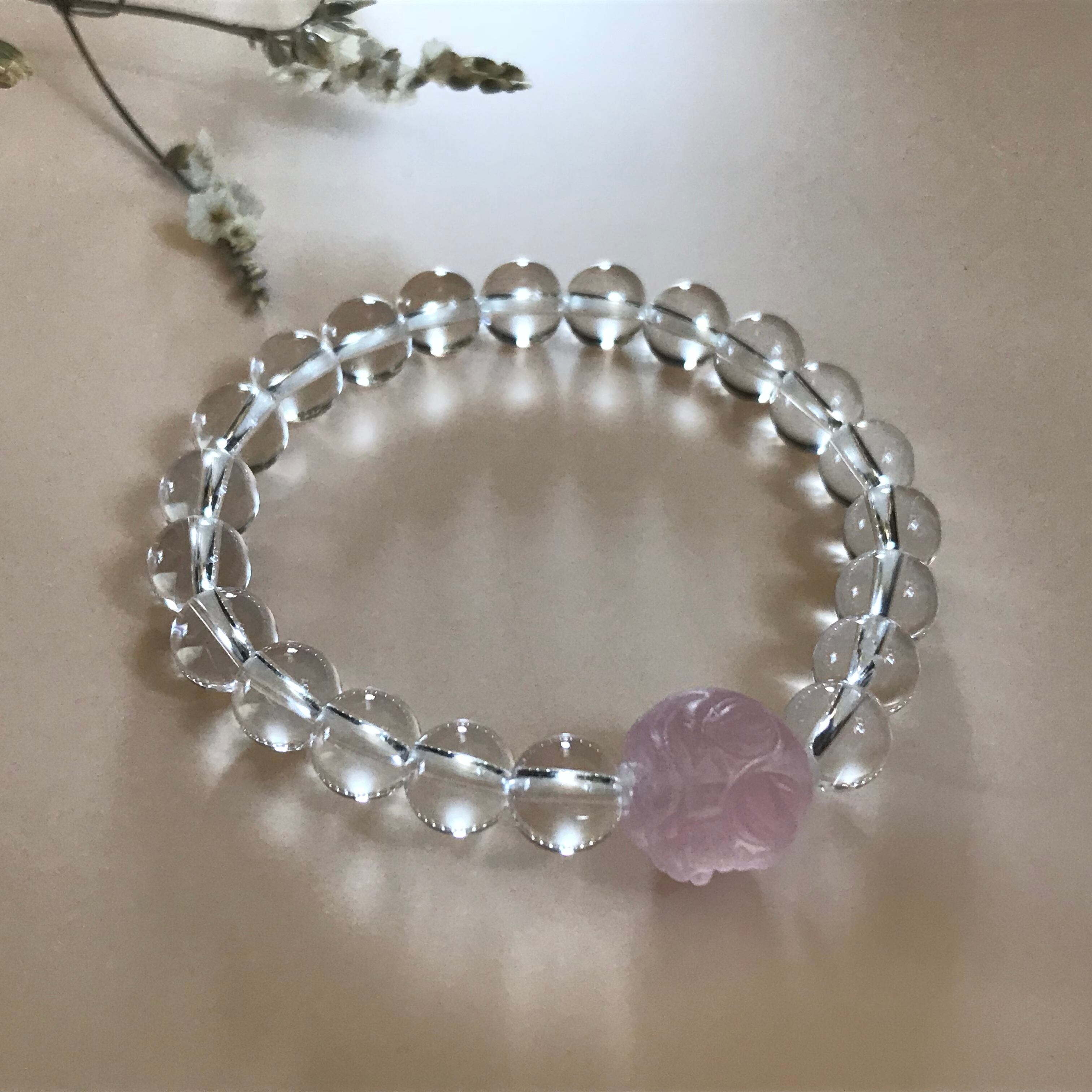 マダガスカル産のやわらかな色合いのローズクォーツと水晶を組み合わせたブレスレットです。