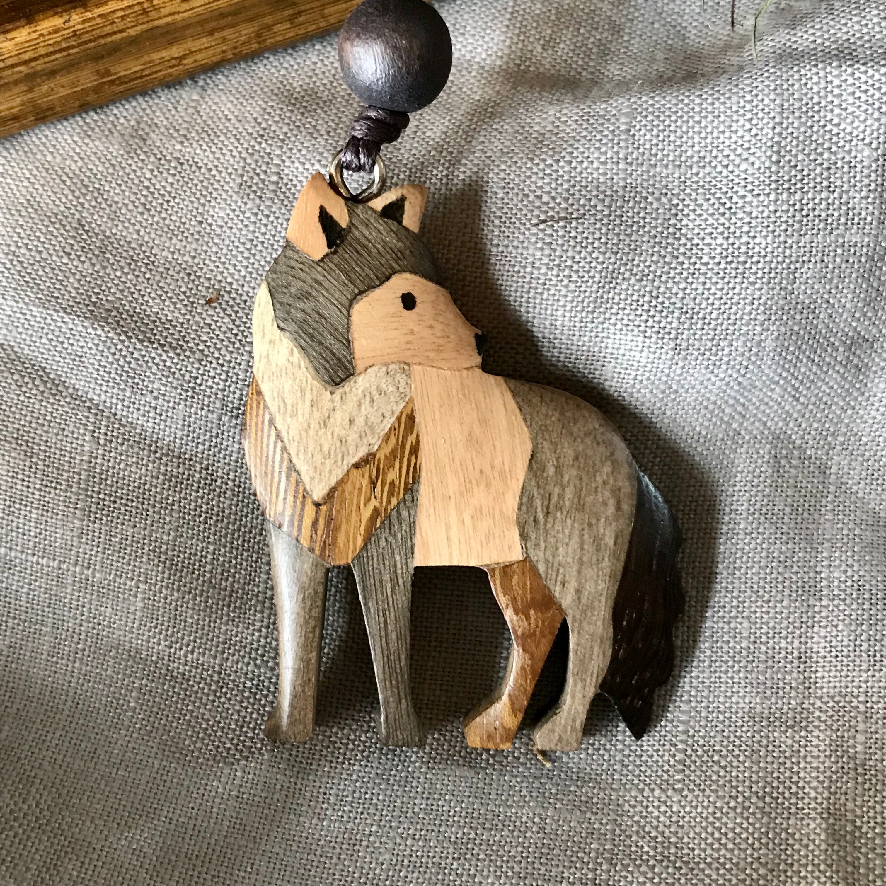 優しい顔立ちのオオカミの木製ネックレスです。