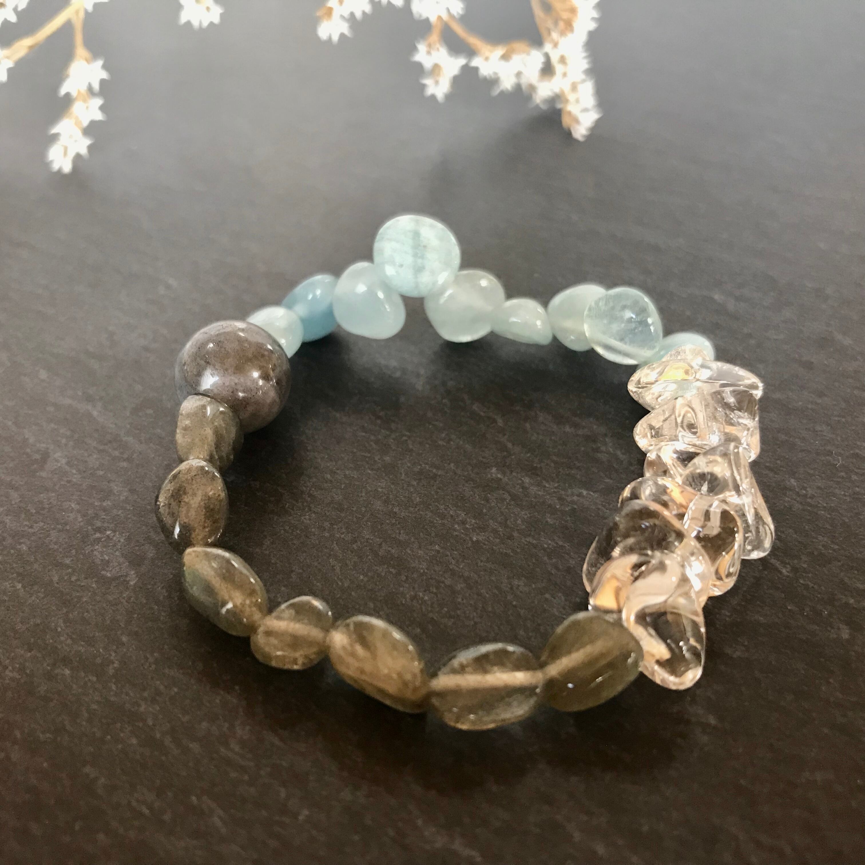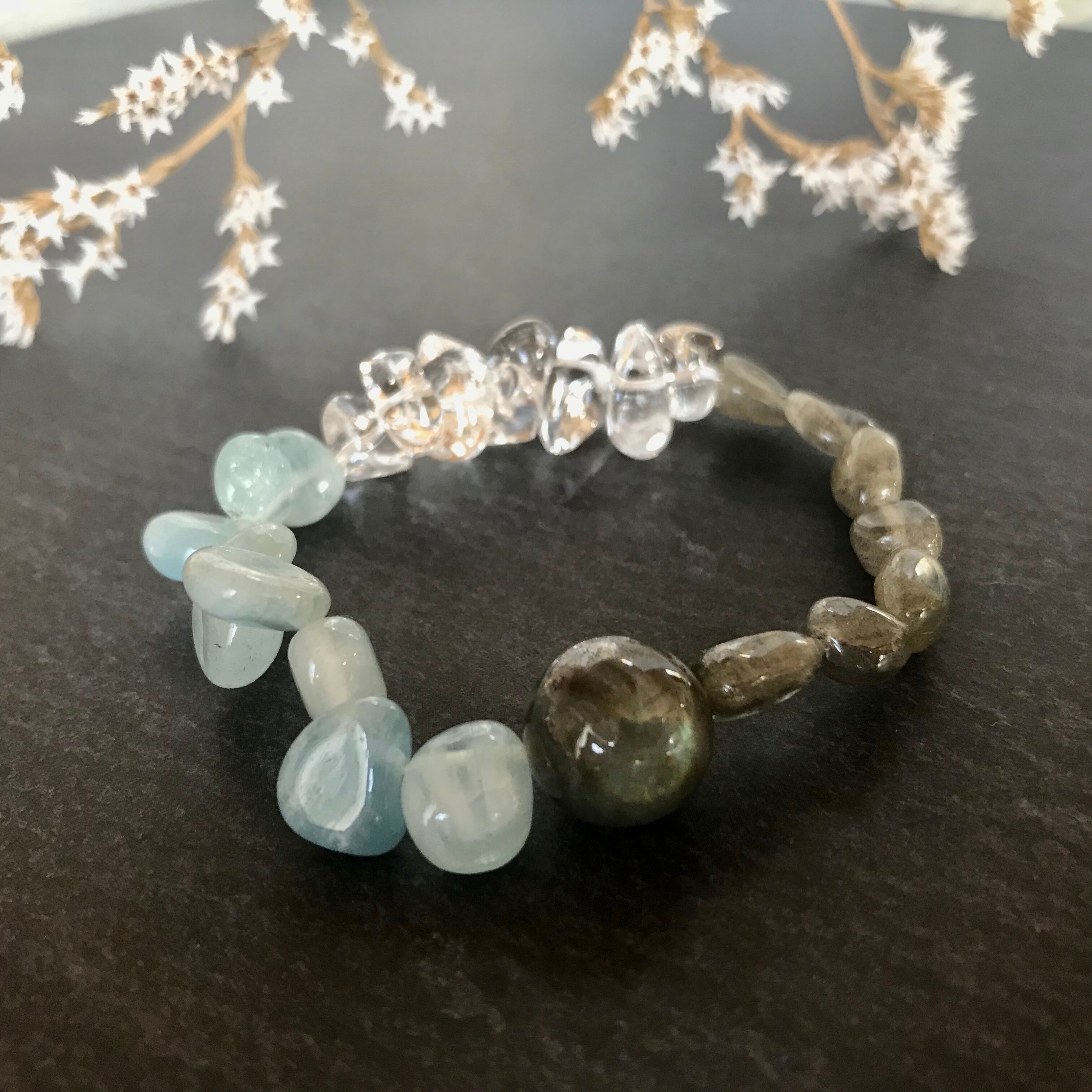 珍しい大粒のラブラドライトに小さめのラブラドライト、透明感の美しいクォーツ、優しい色合いのアクアマリンを組み合わせたブレスレットです。
