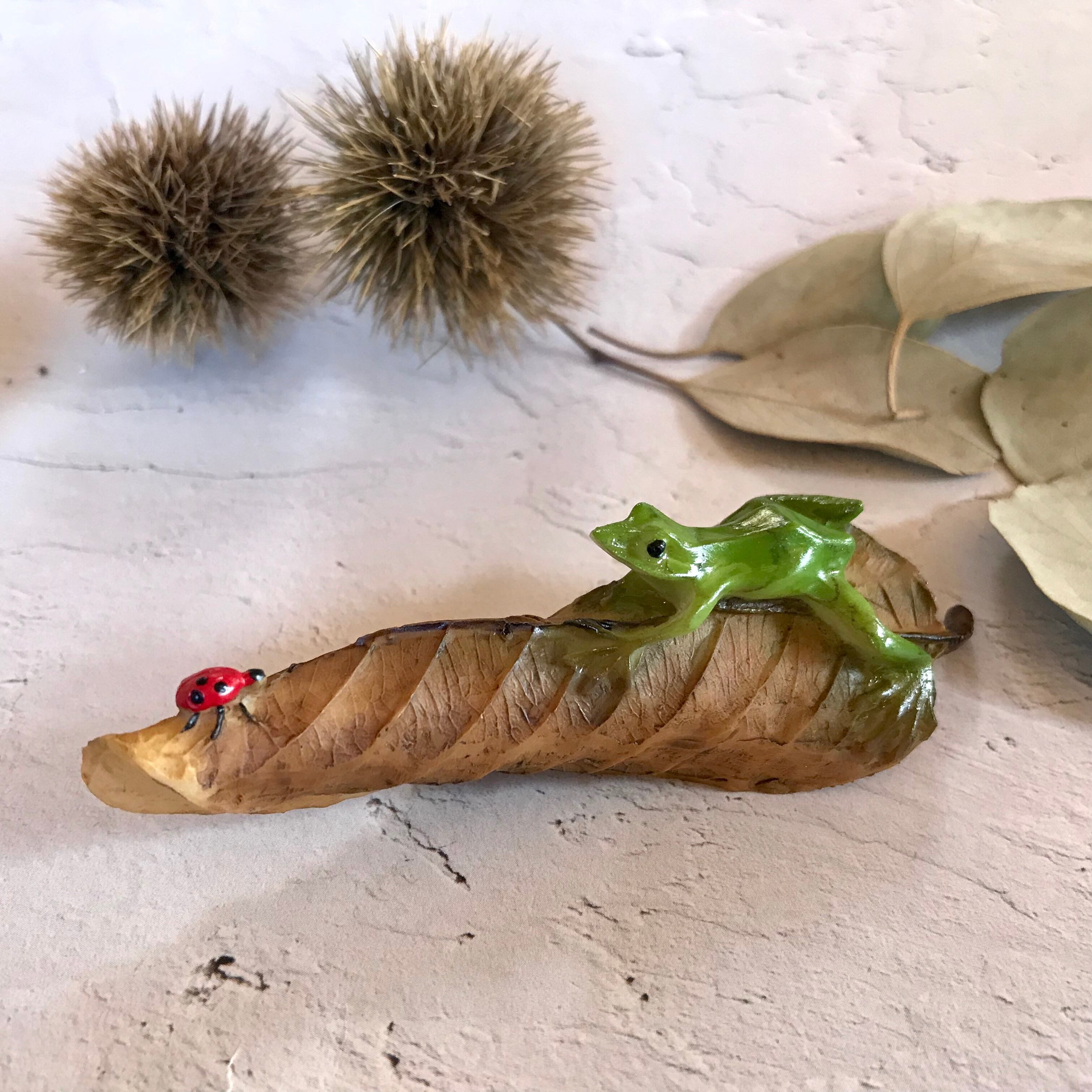 枯葉の上でにらめっこ カエルとてんとう虫 オブジェ