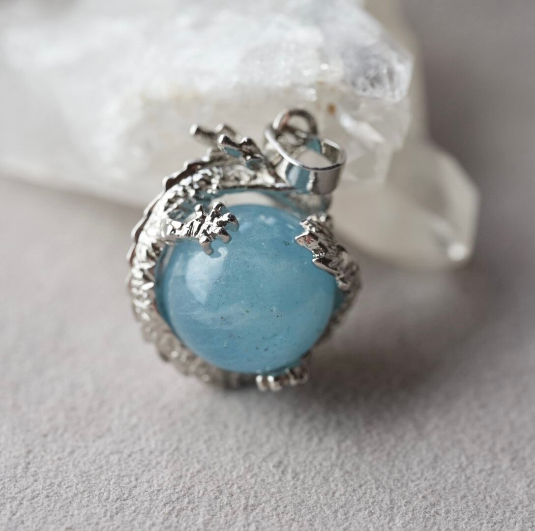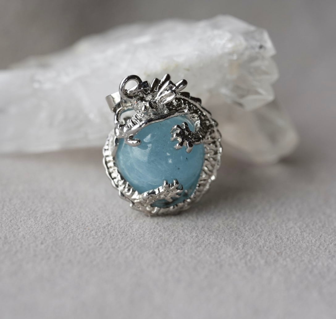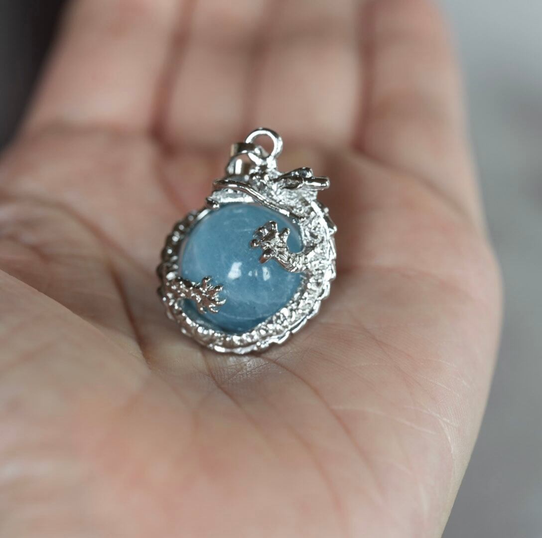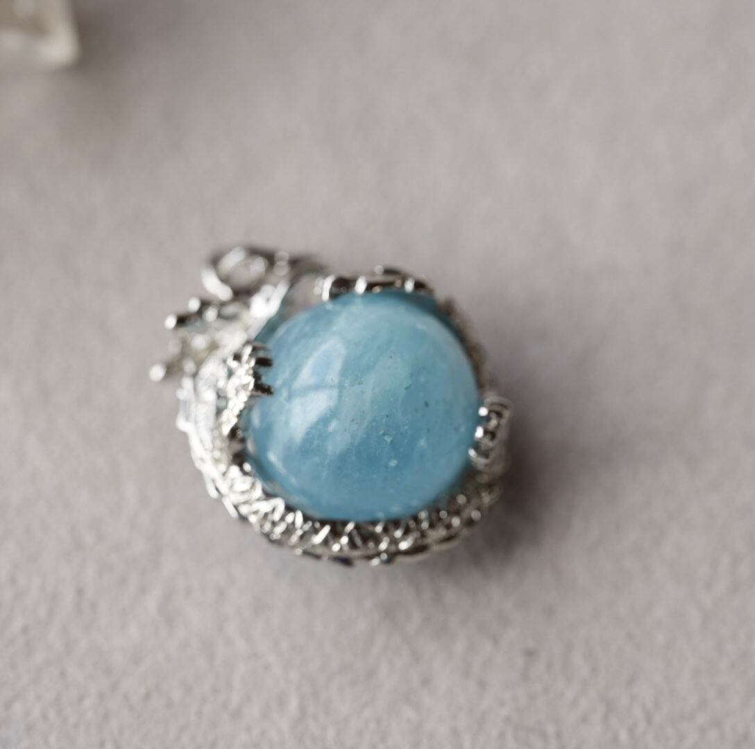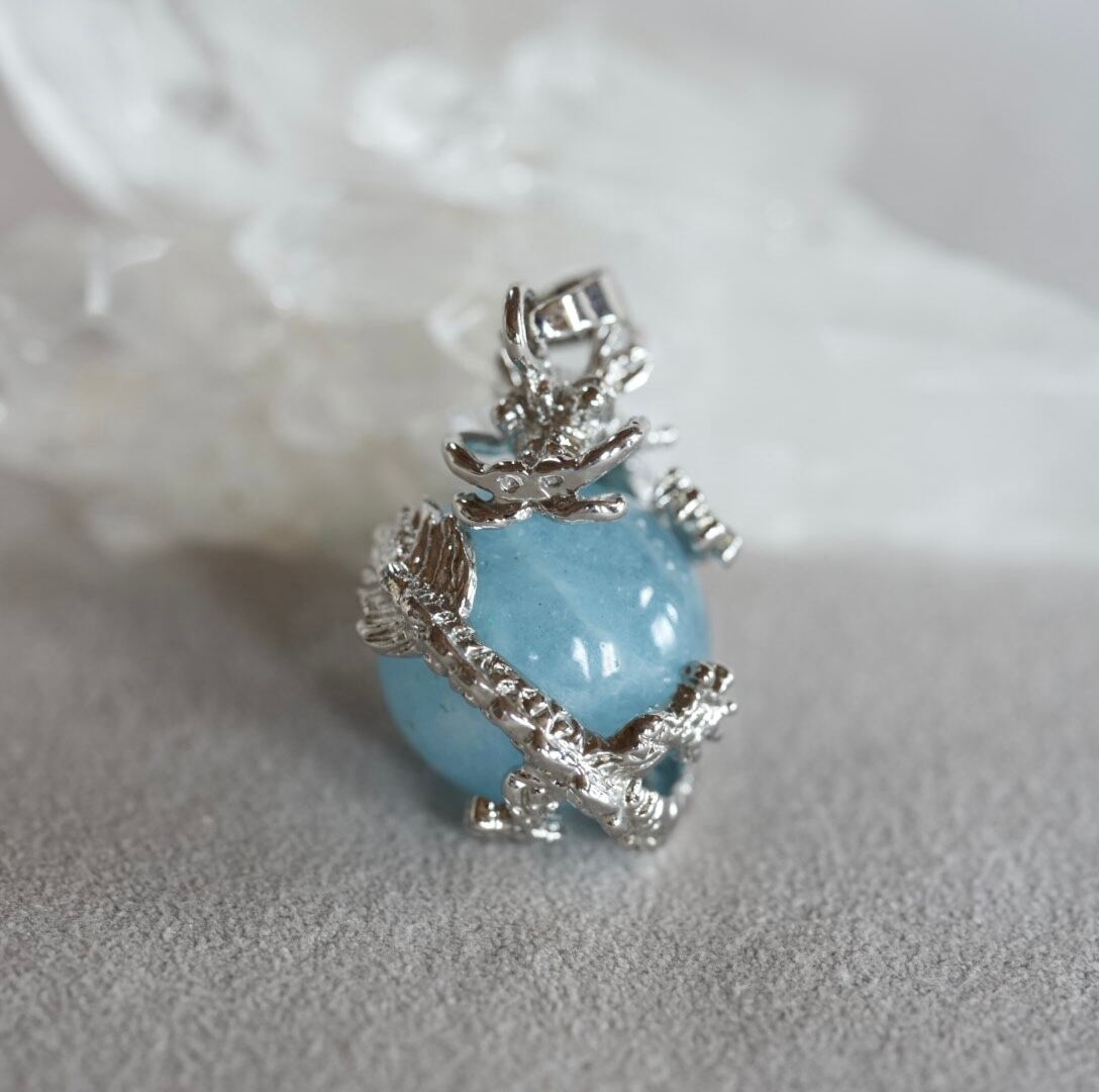 アクアマリンと龍の組み合わせで縁起物として飾っておくのも良いですね。今回は優しい水色の部分と少し濃いめの水色、白い部分が見られるアクアマリンです。龍とアクアマリンの石は固定ではないため、その日の気分でくるくると回して簡単に変えることができます。