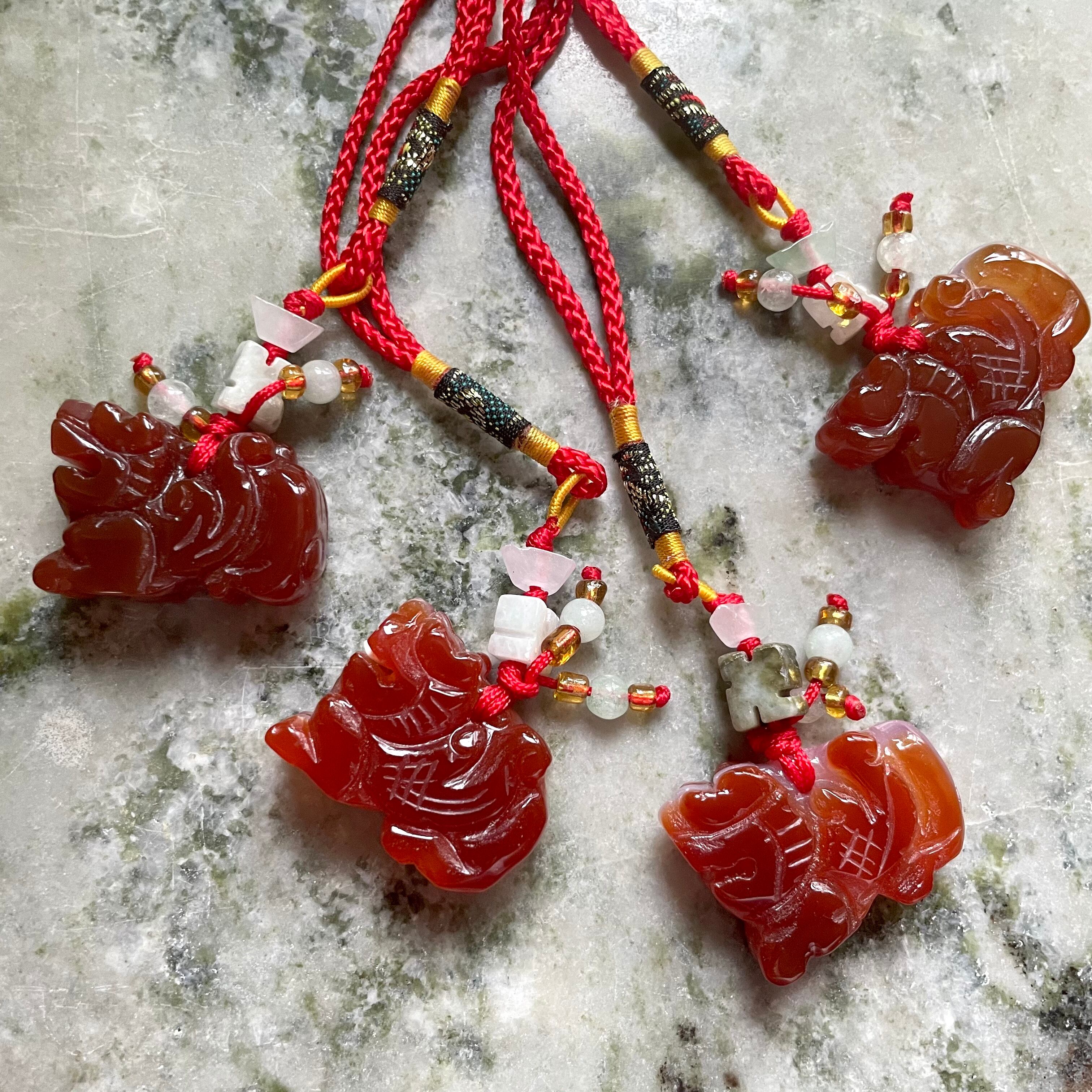 天然石瑪瑙(めのう)ひとつづつ手彫りして作られた貔貅のチャームです。