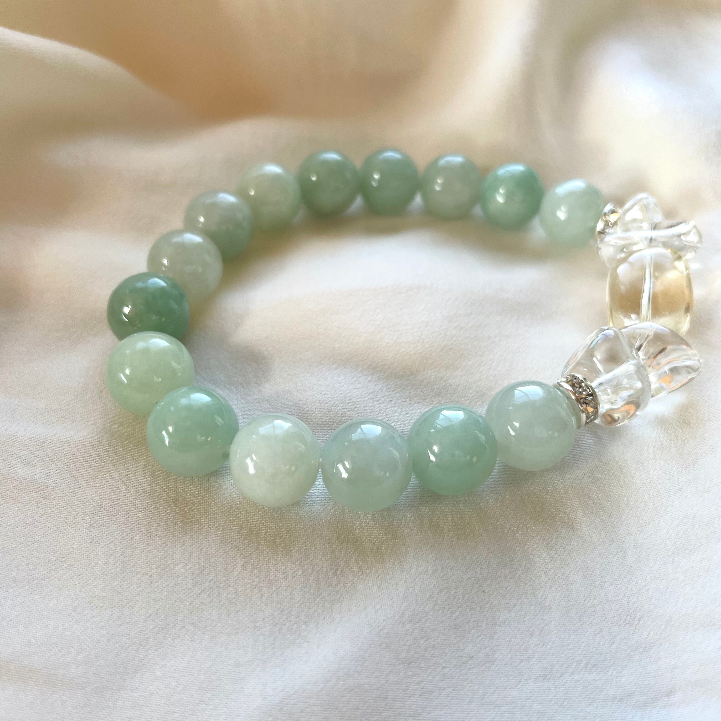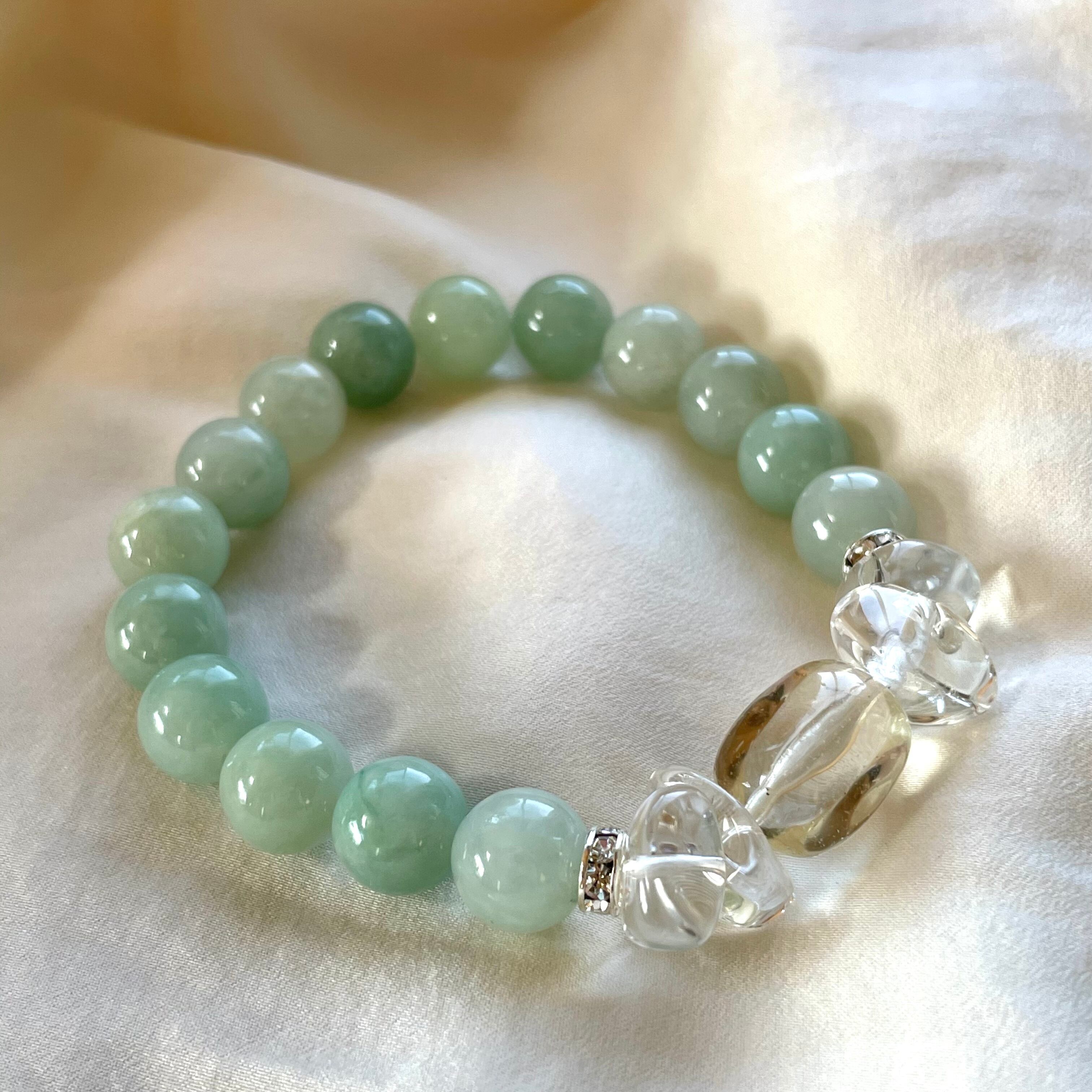 穏やかな淡い緑色が美しい翡翠のブレスレットです。中央には透明感のある水晶がアクセントとして組み合わせてあります。