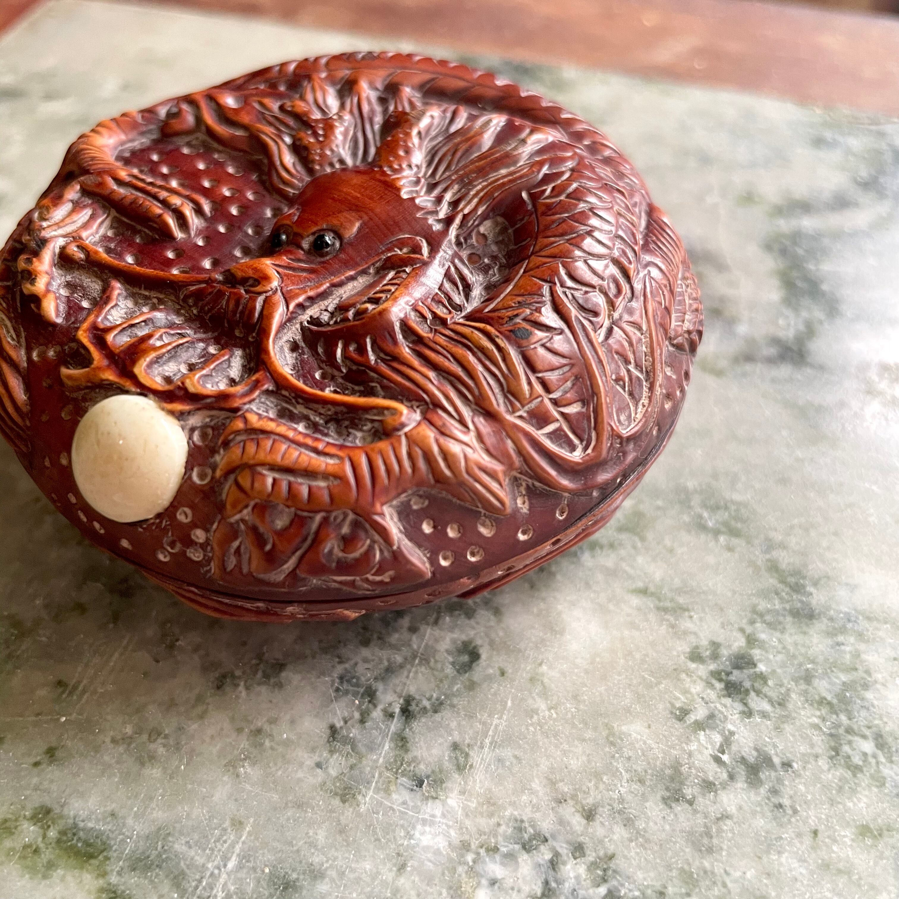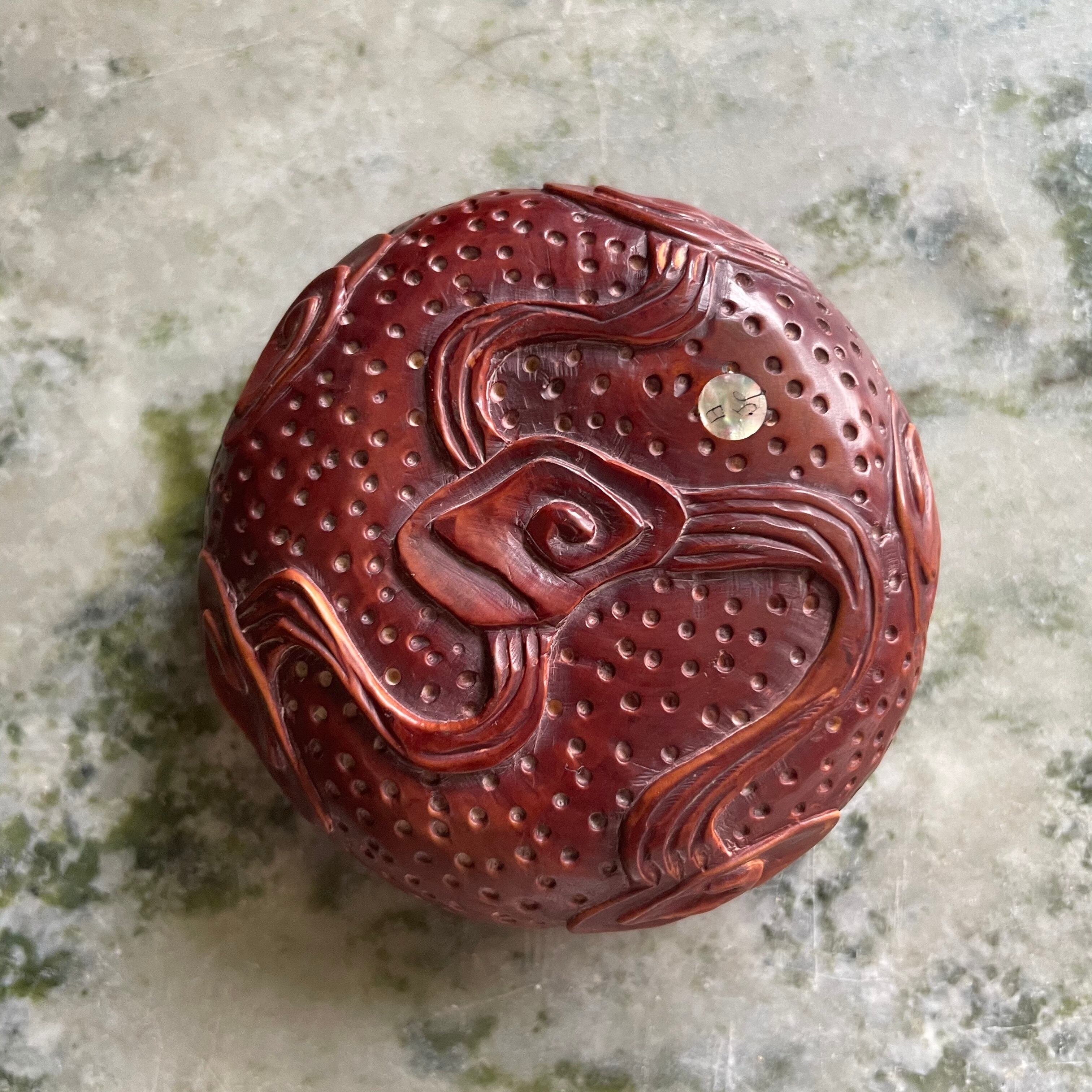 立体的に彫られています。表情も勇ましいですね。底にも模様が彫ってあり、表面の白い丸は水牛の骨を付けております。