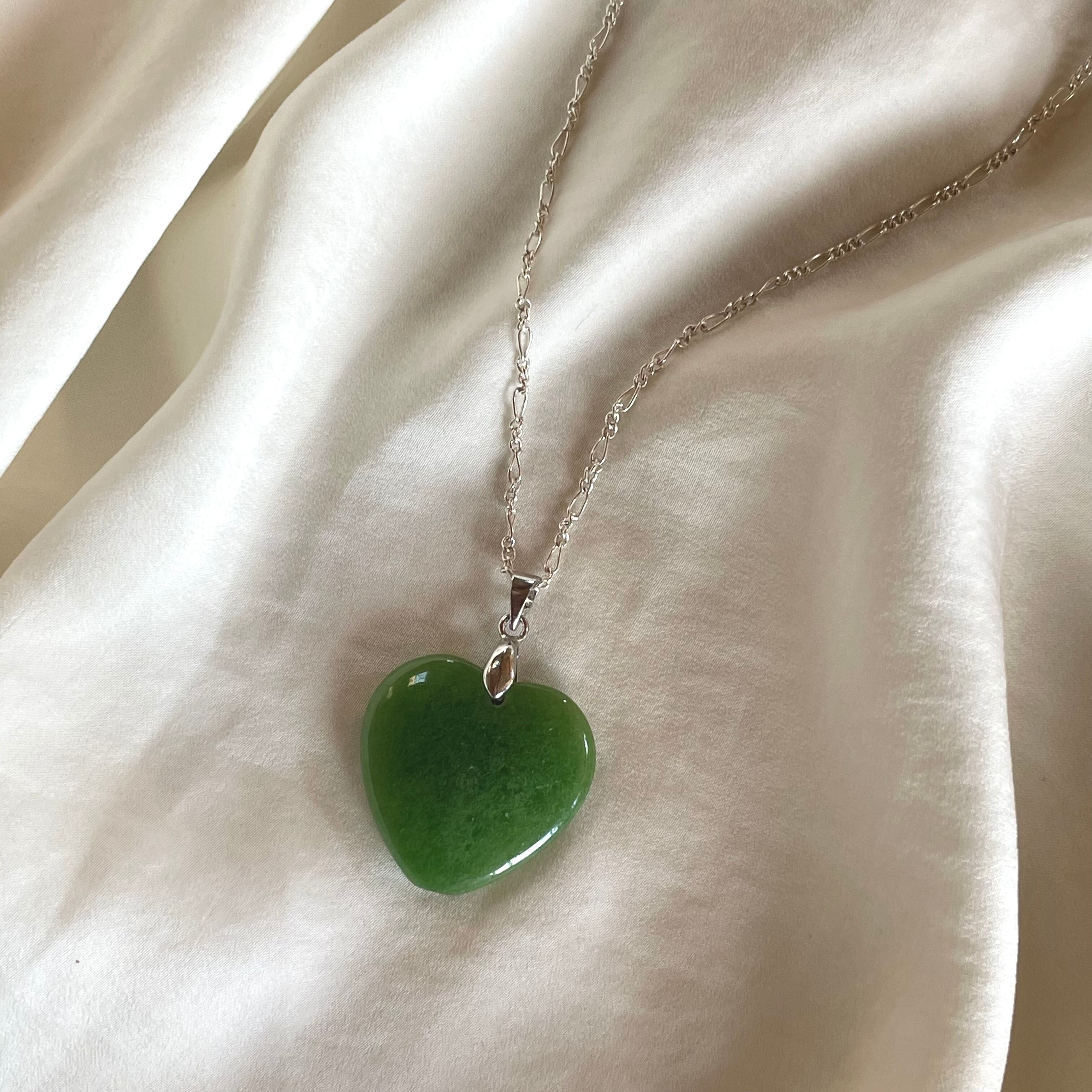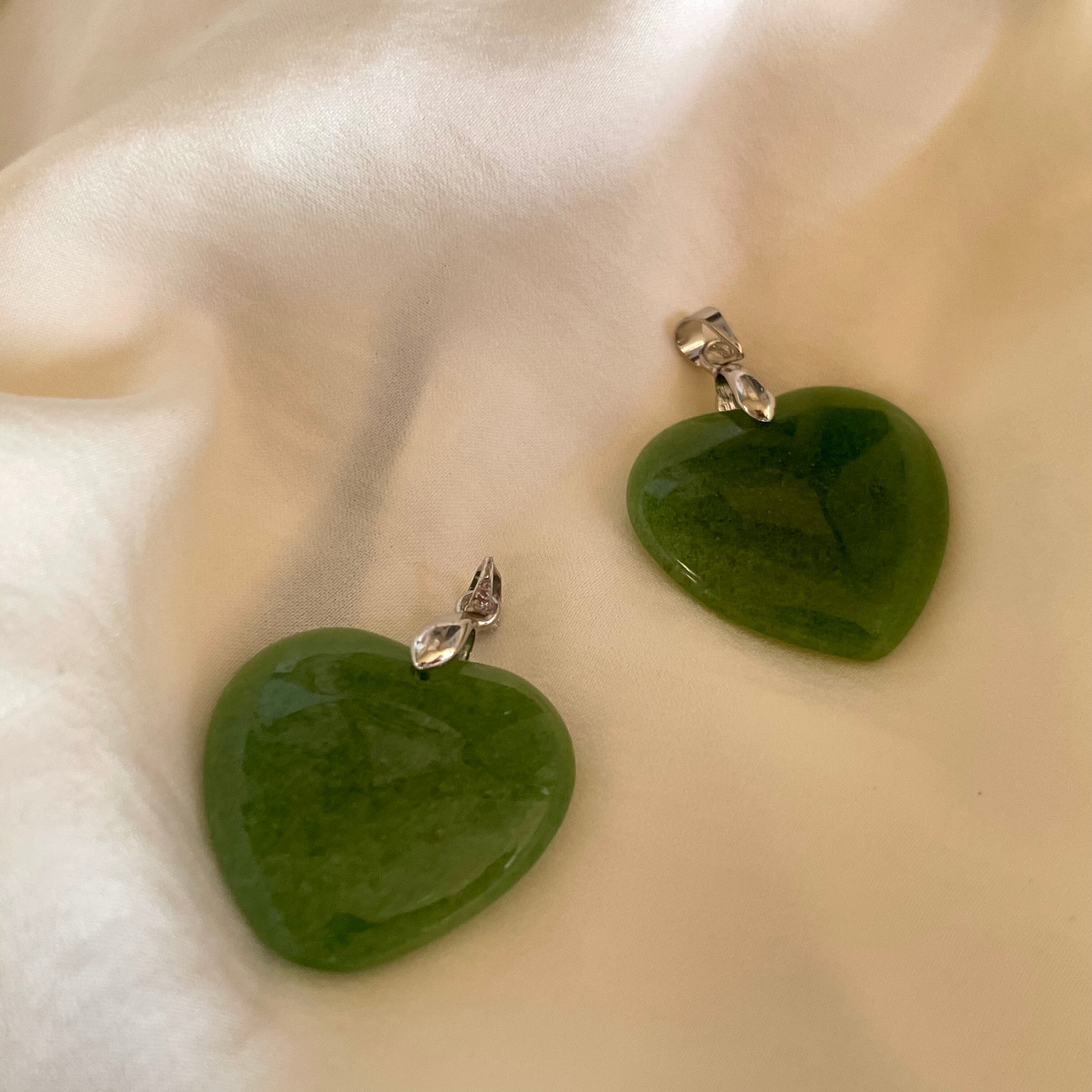 落ち着いた緑色が美しい翡翠のペンダントトップ、珍しい大きめのハート形です。