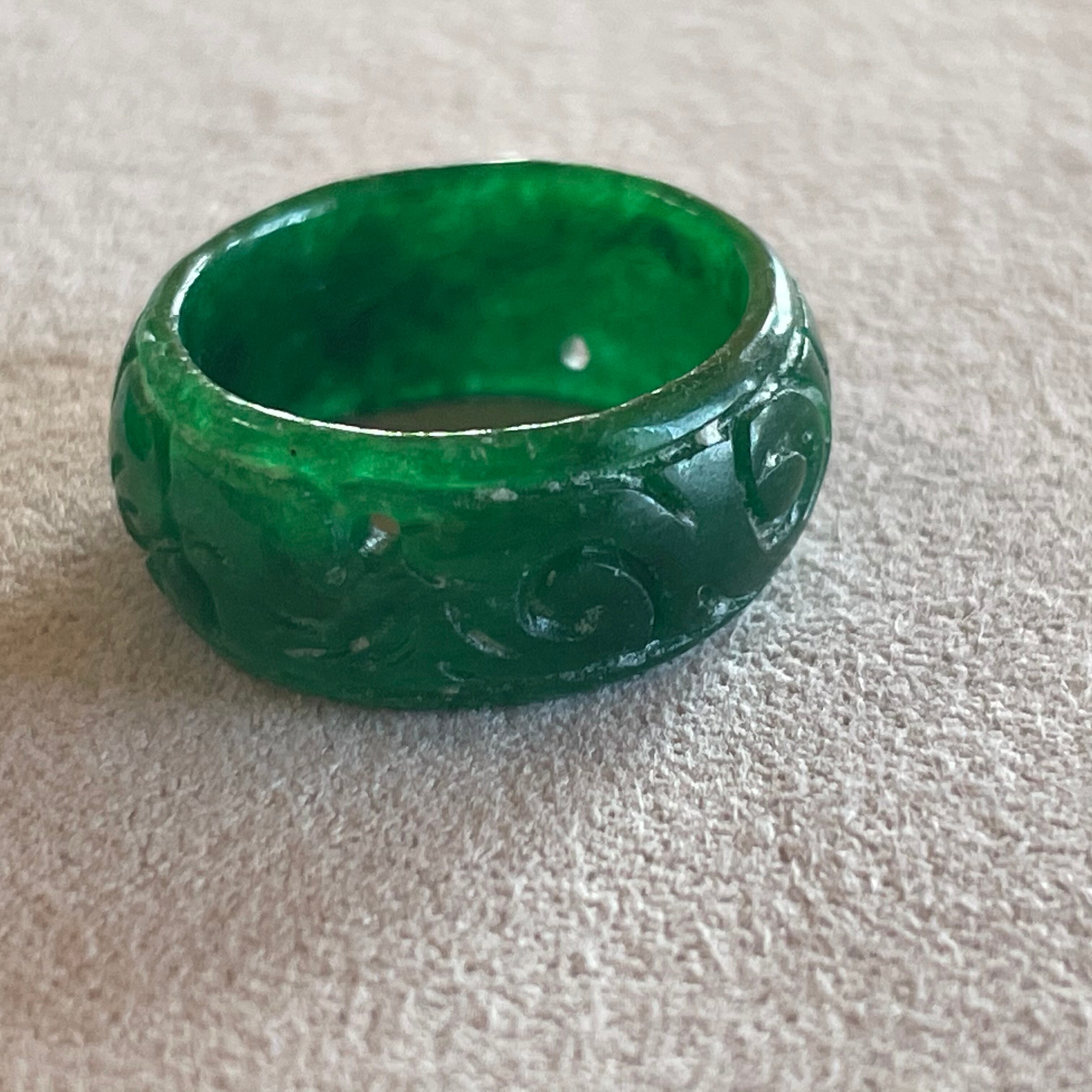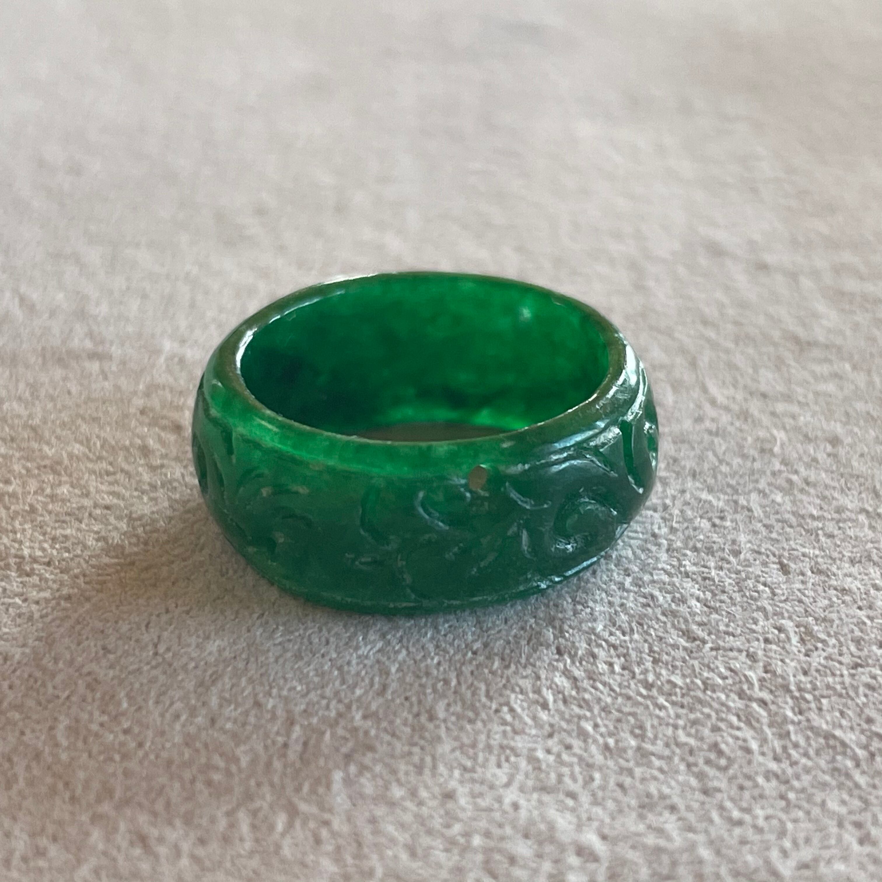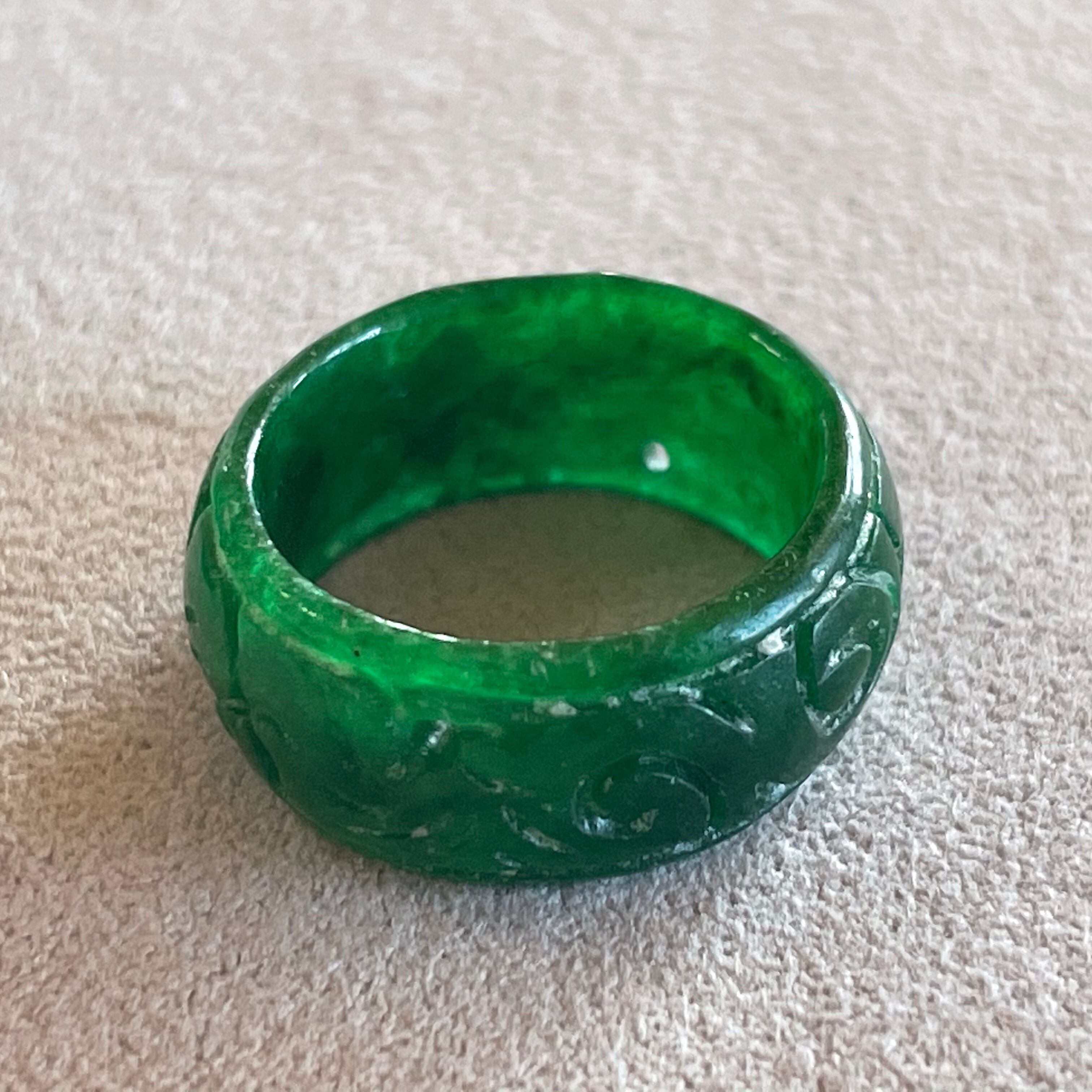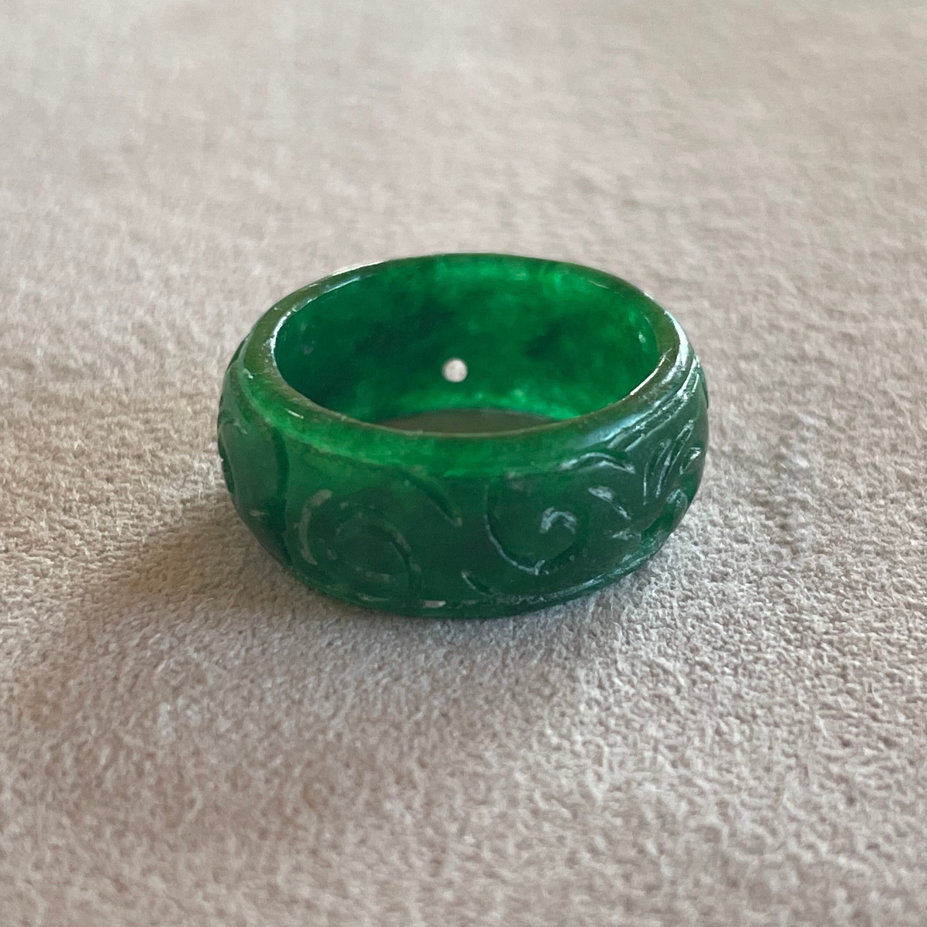 深く鮮やかな緑色が美しい翡翠の指輪、