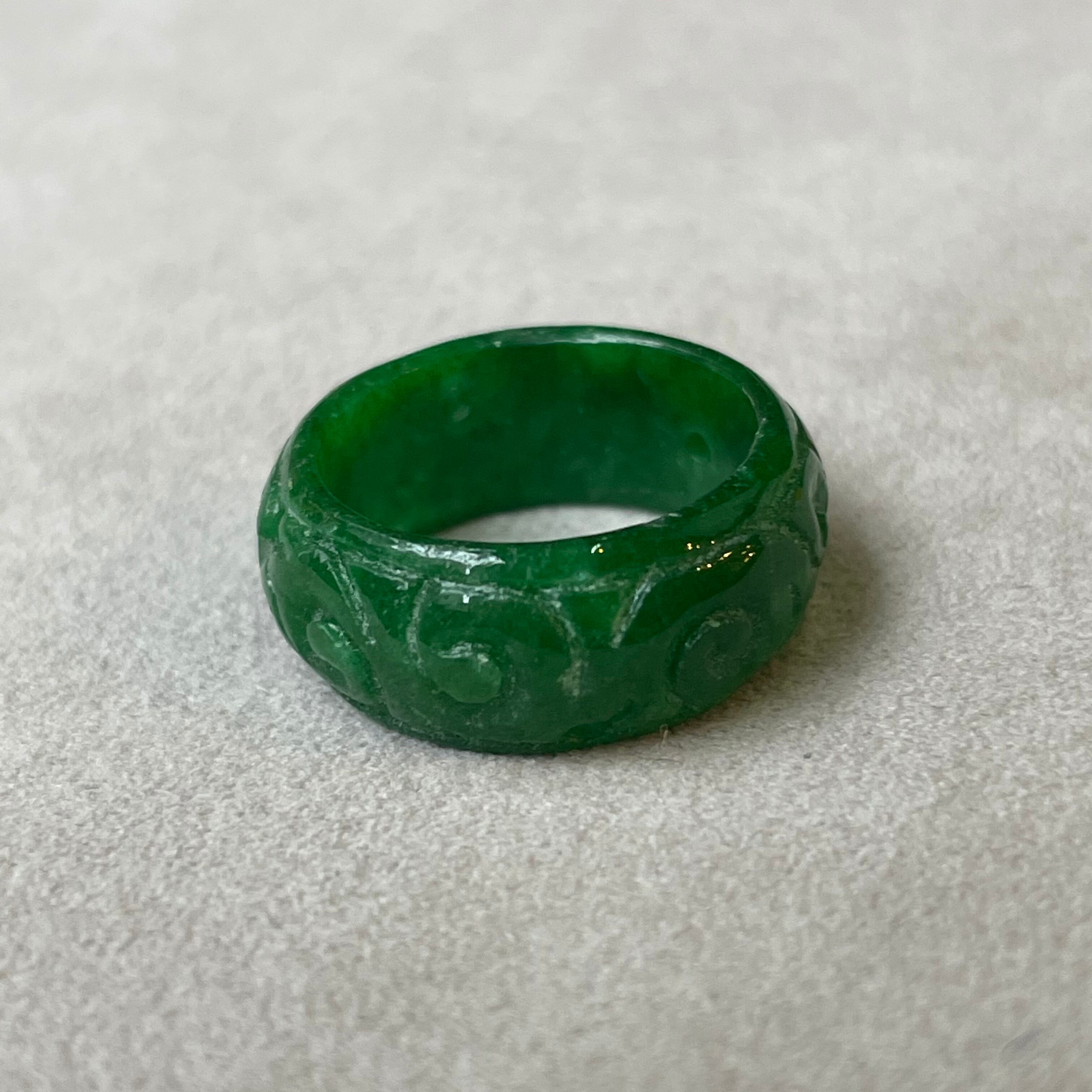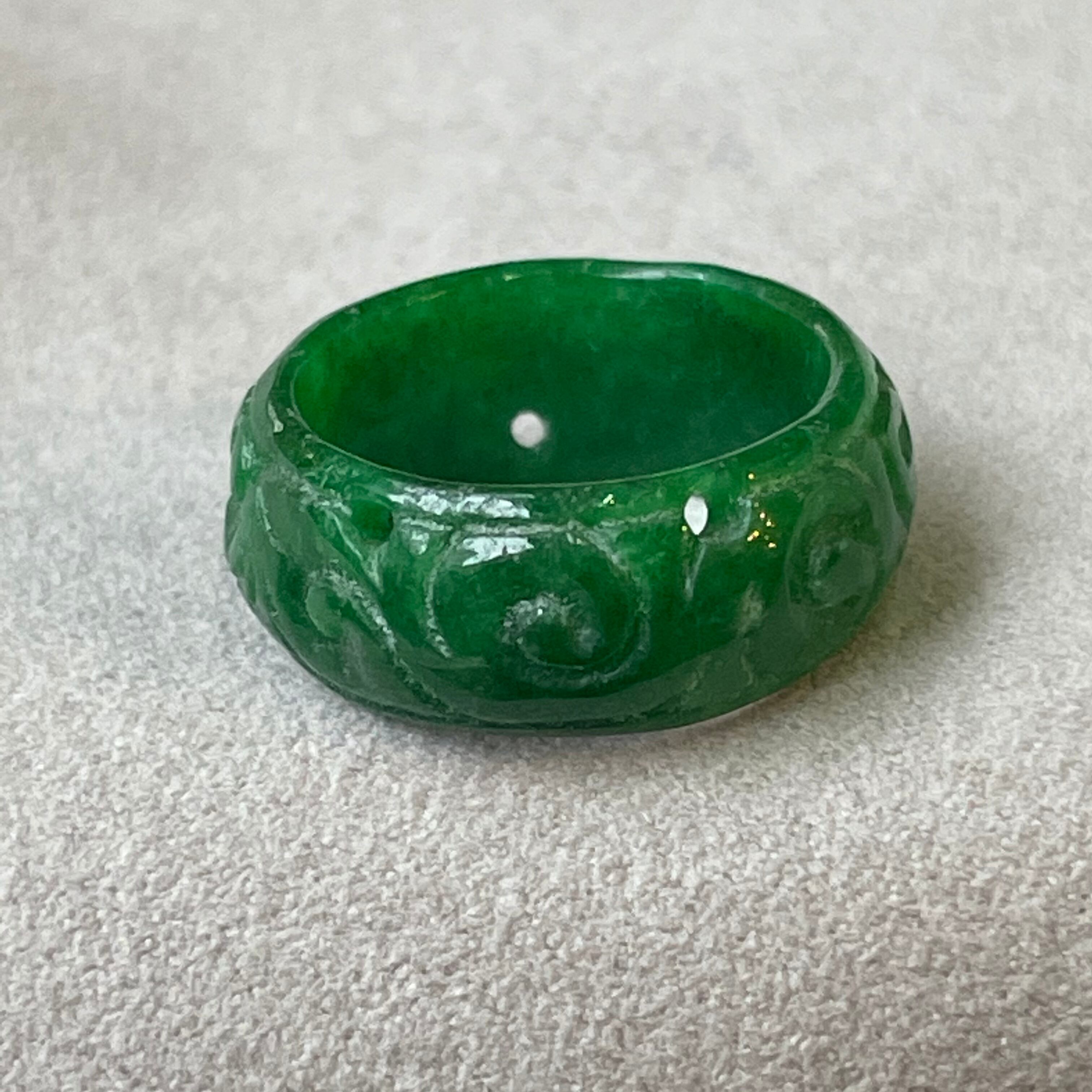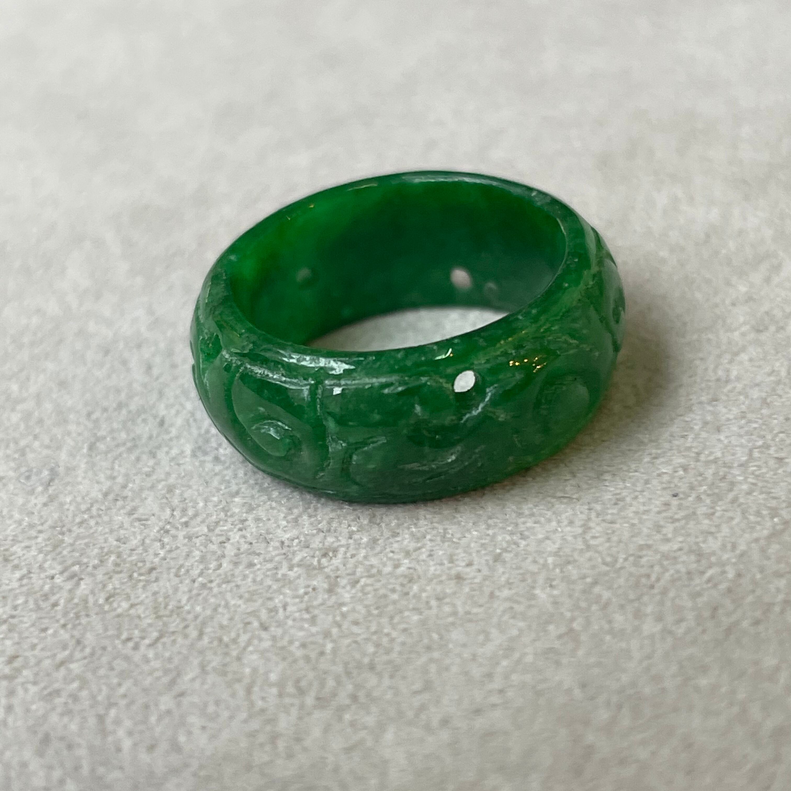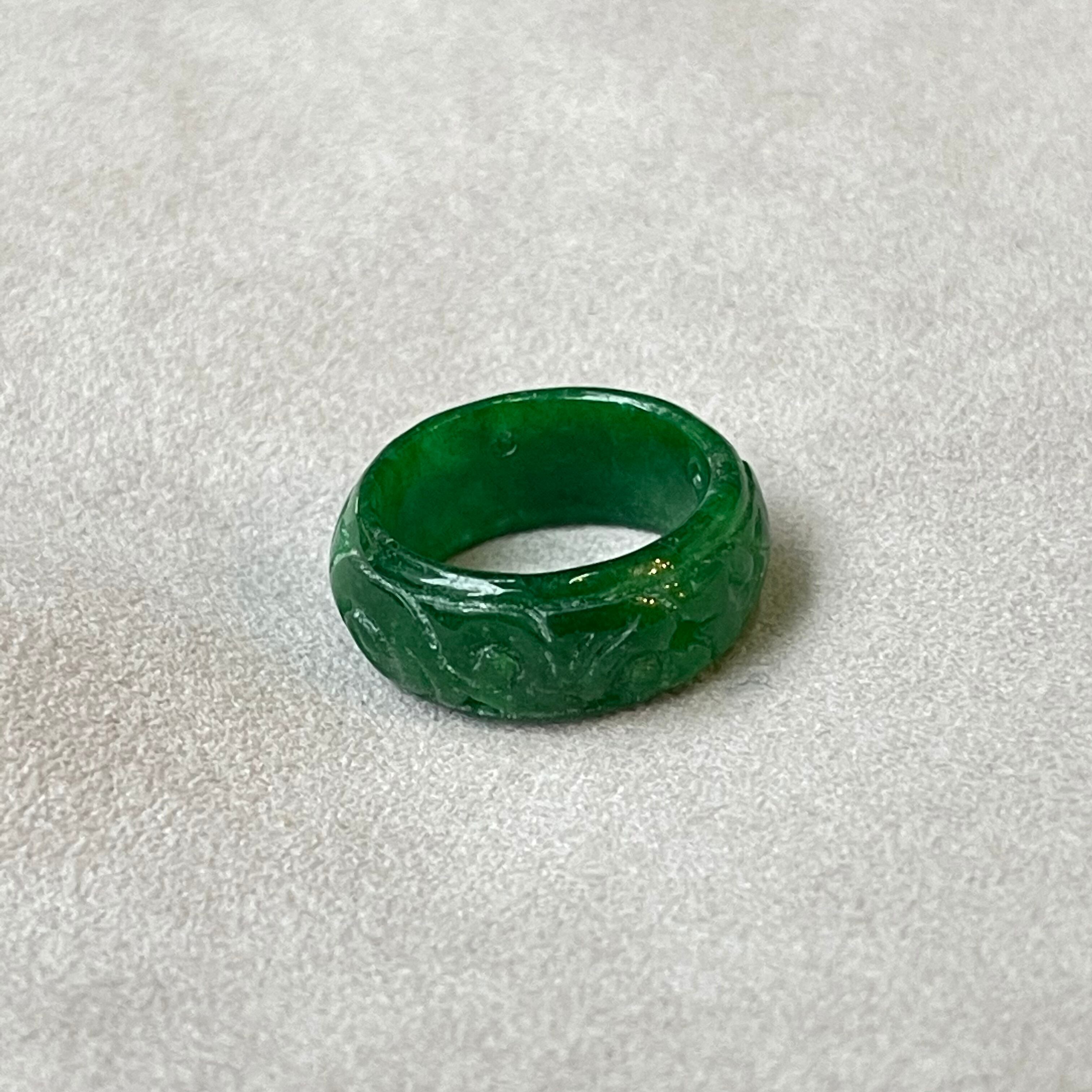 深く鮮やかな緑色が美しい翡翠の指輪、
