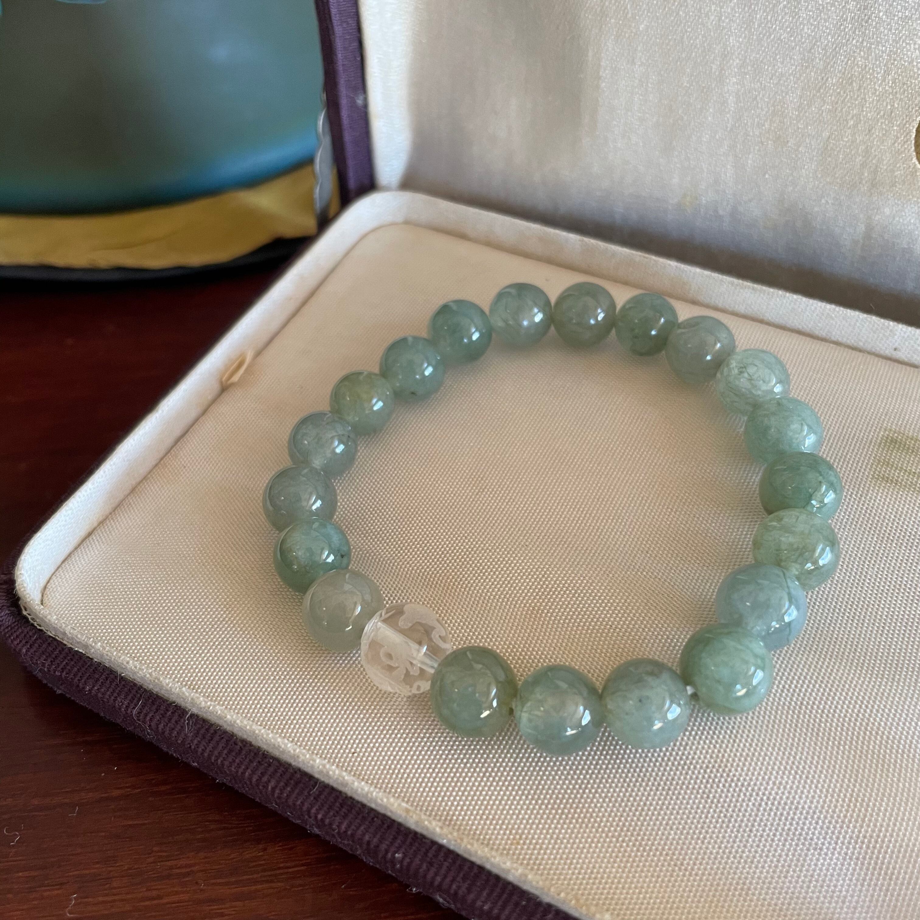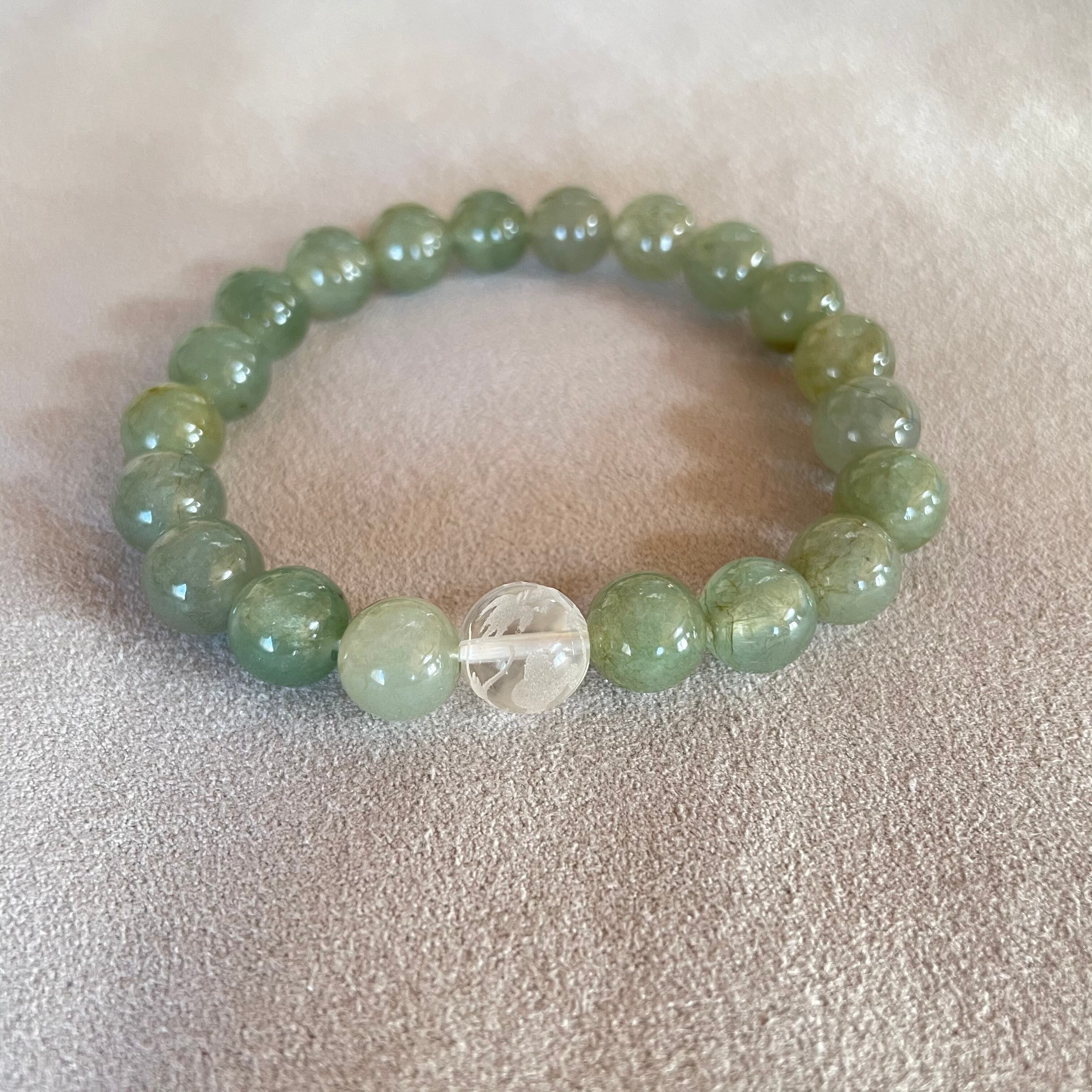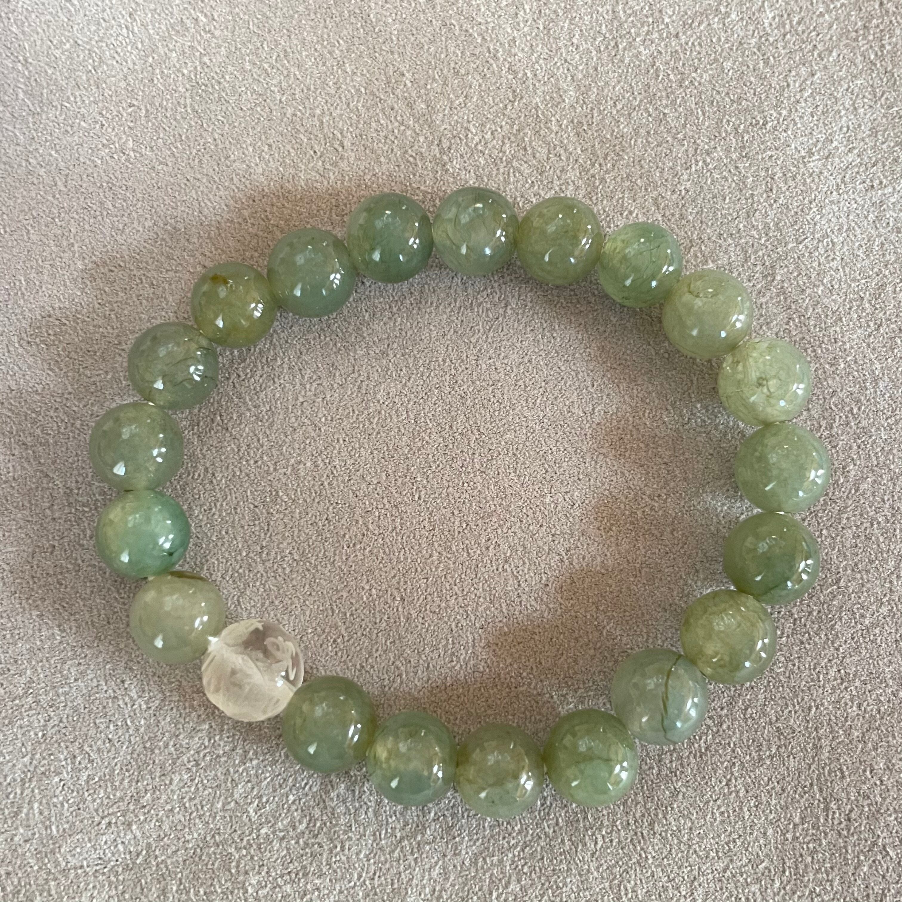 深い緑色が美しい翡翠のブレスレットです。中央には龍の彫刻入り水晶がアクセントとして組み合わせてあります。
