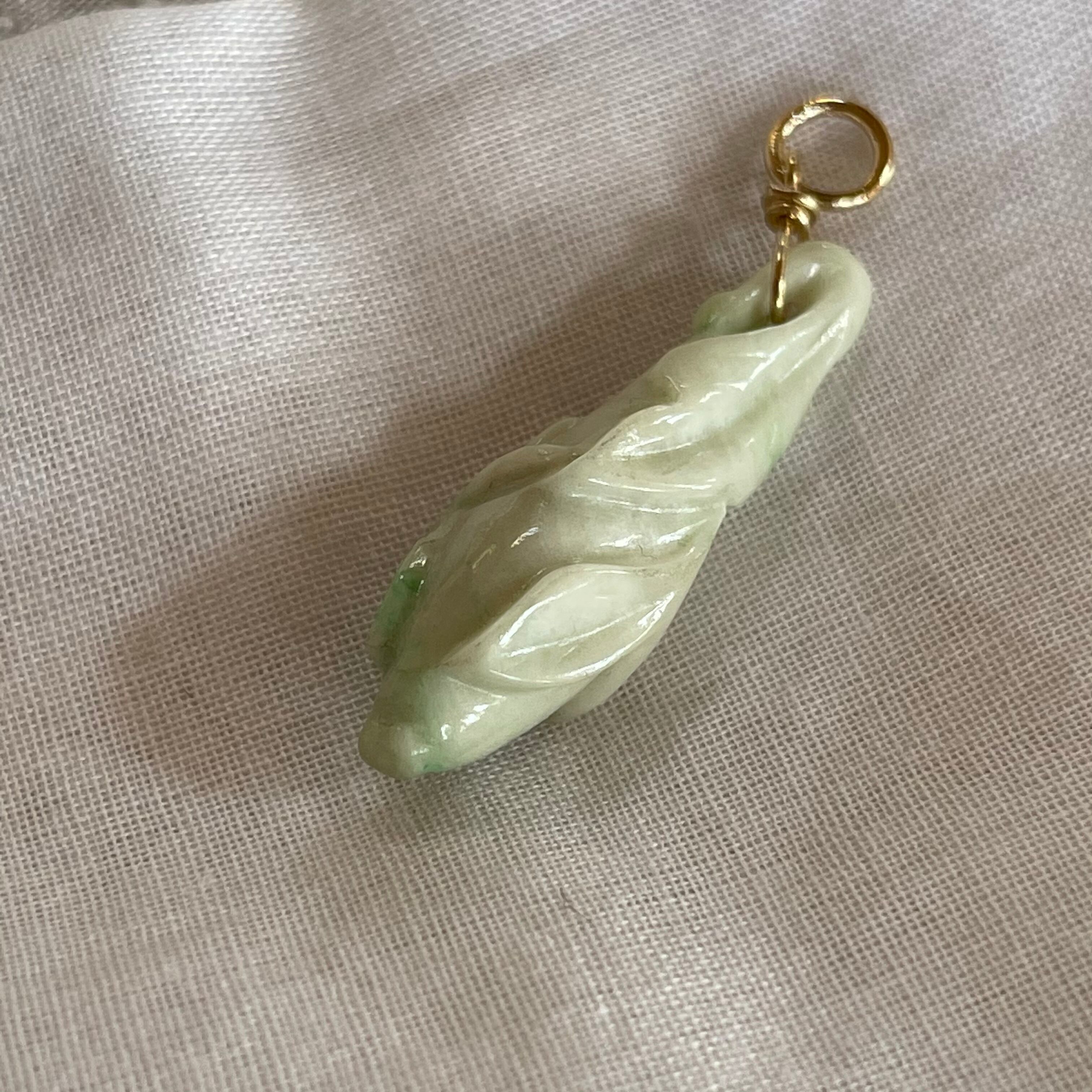 ころんとした立体的なかたちに蔦が彫刻してあります。果物や瓜をモチーフにしているのでしょうか。全体的に白っぽい中にほんのり明るい緑色がアクセントになっており、とても魅力的な翡翠です。彫刻はっきりと彫られ美しいです。