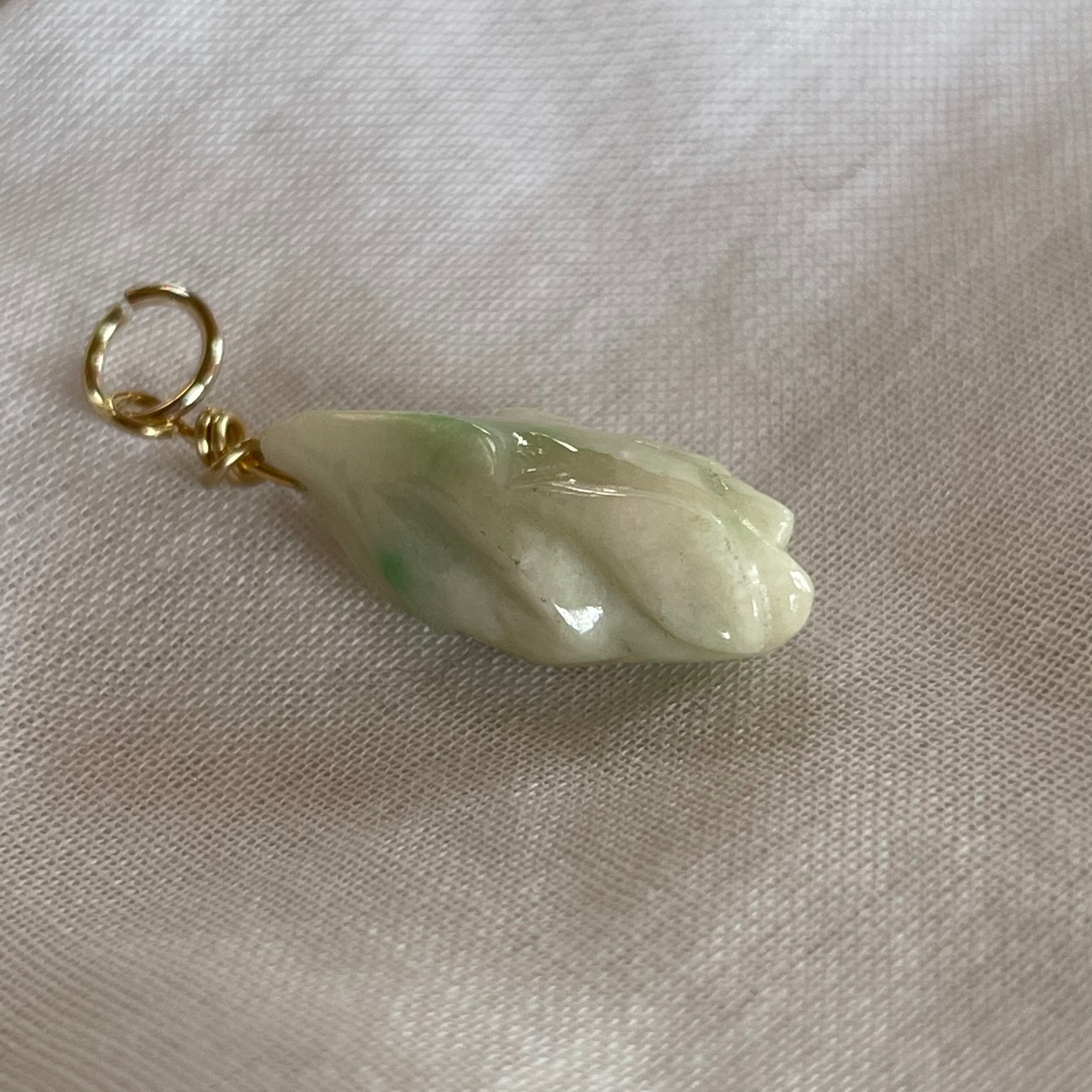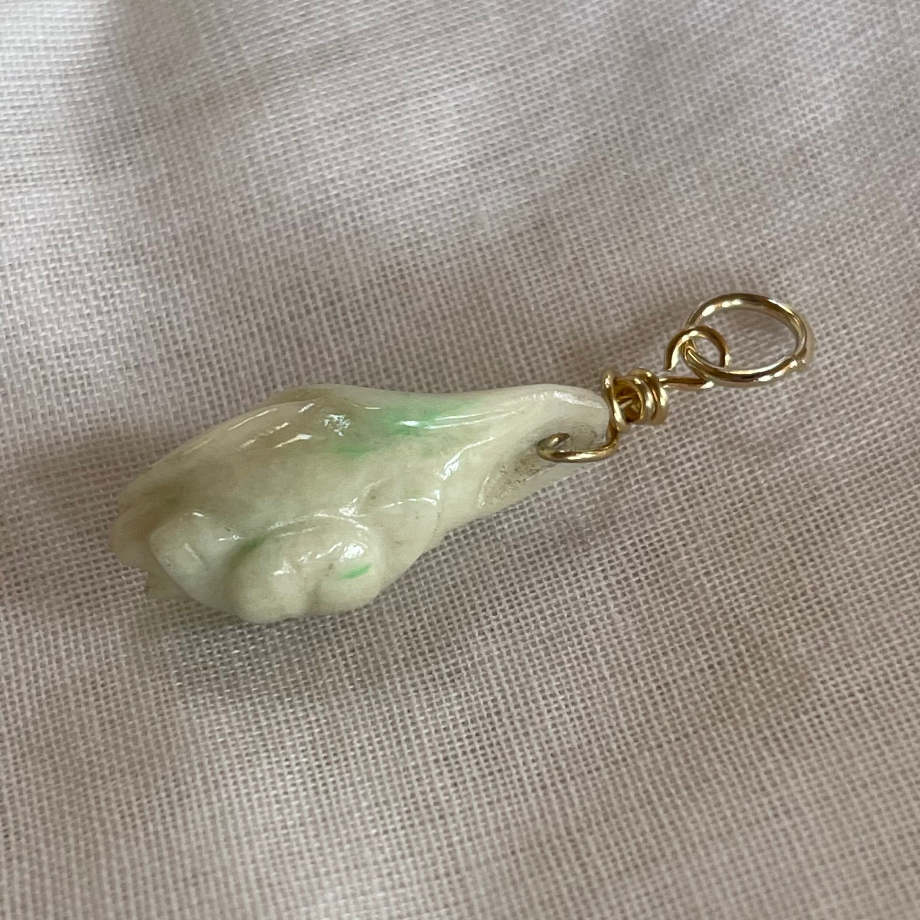 ころんとした立体的なかたちに蔦が彫刻してあります。果物や瓜をモチーフにしているのでしょうか。全体的に白っぽい中にほんの少しの明るい緑色がアクセントになっており、とても魅力的な翡翠です。