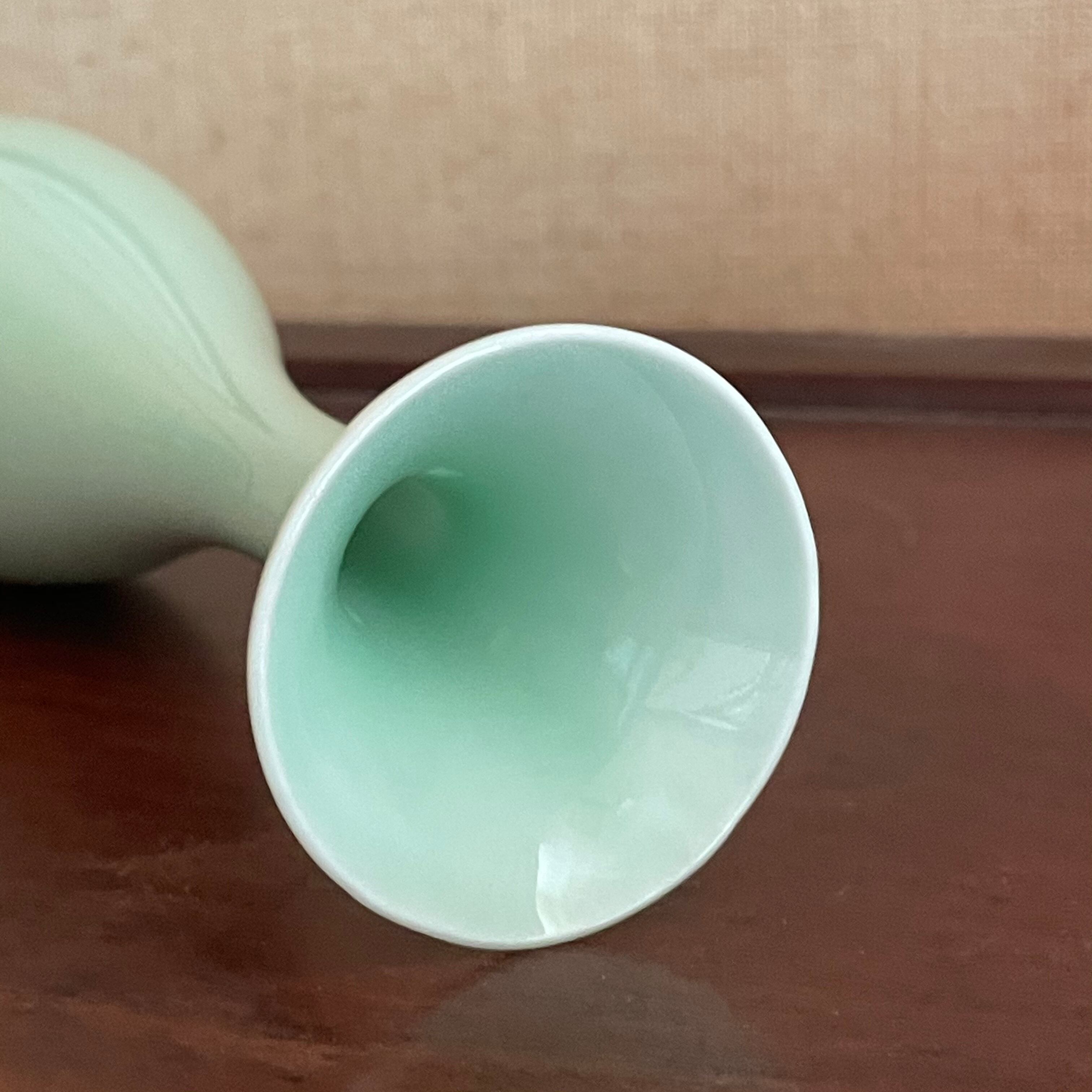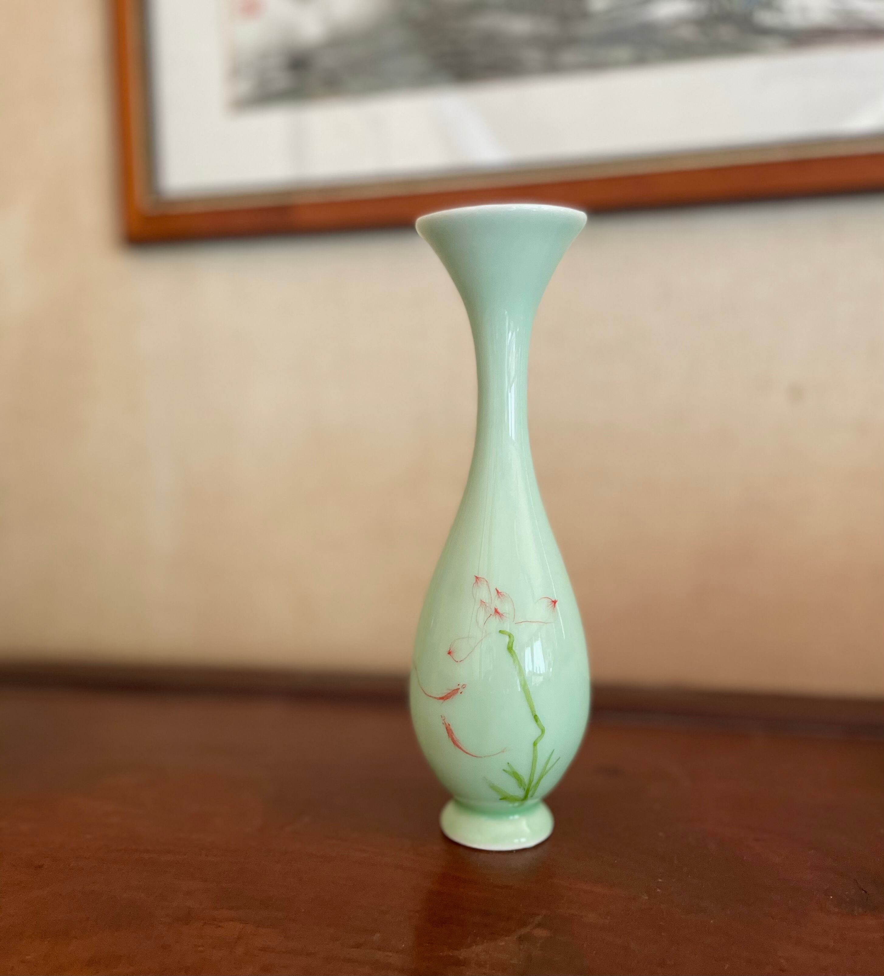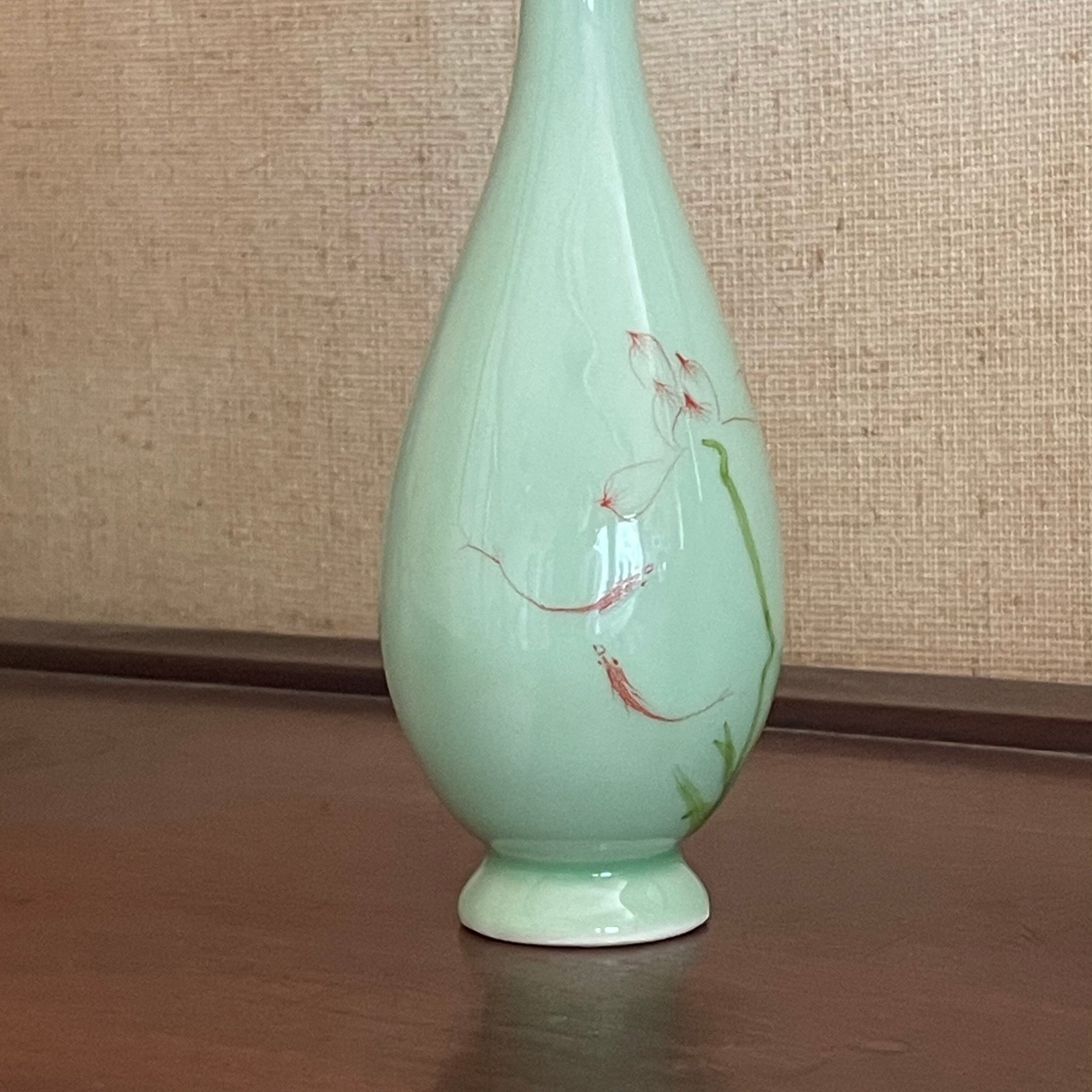 淡い青磁色が美しい一輪挿し、蓮とメダカを職人さんが一つ一つ手描きした洗練されたお品です。