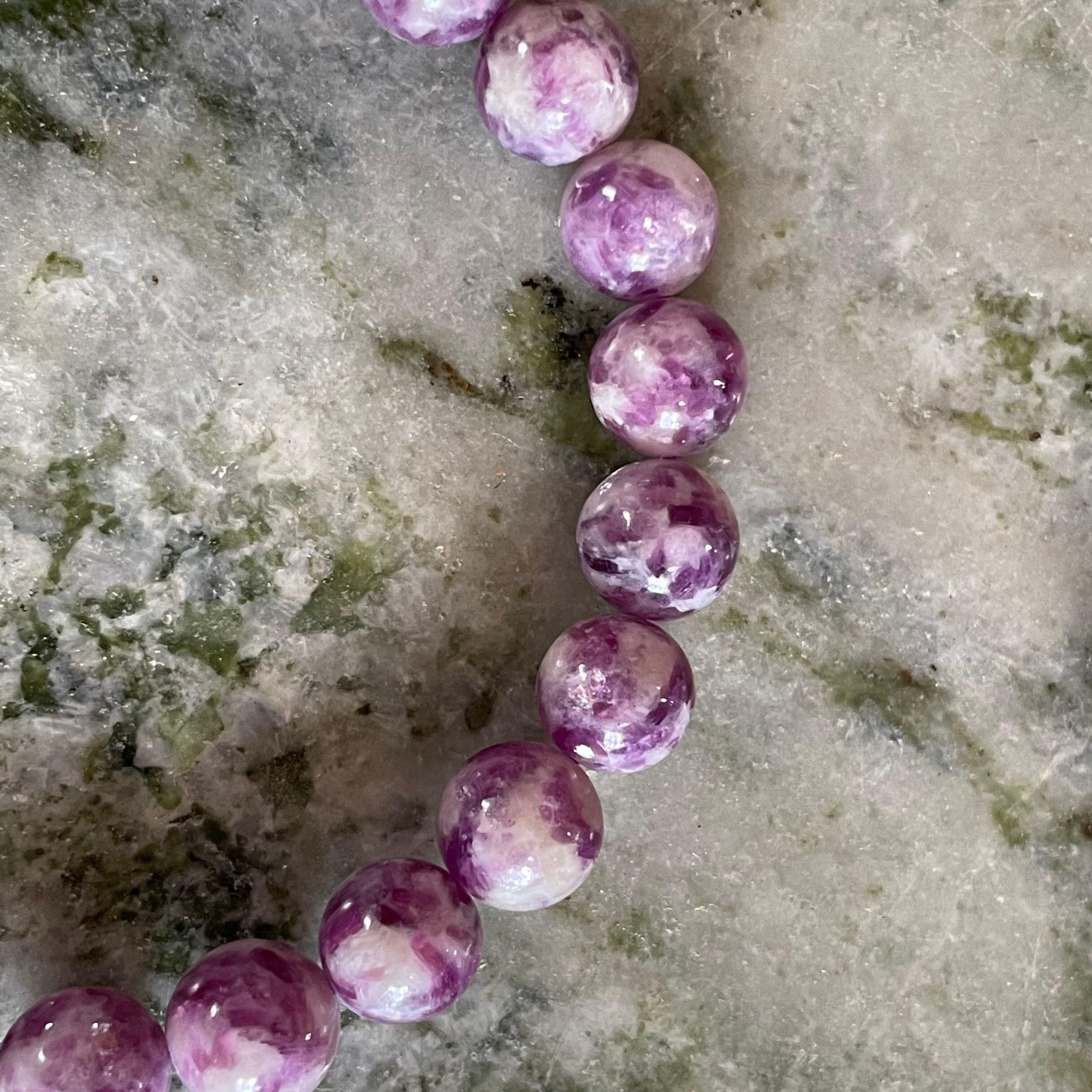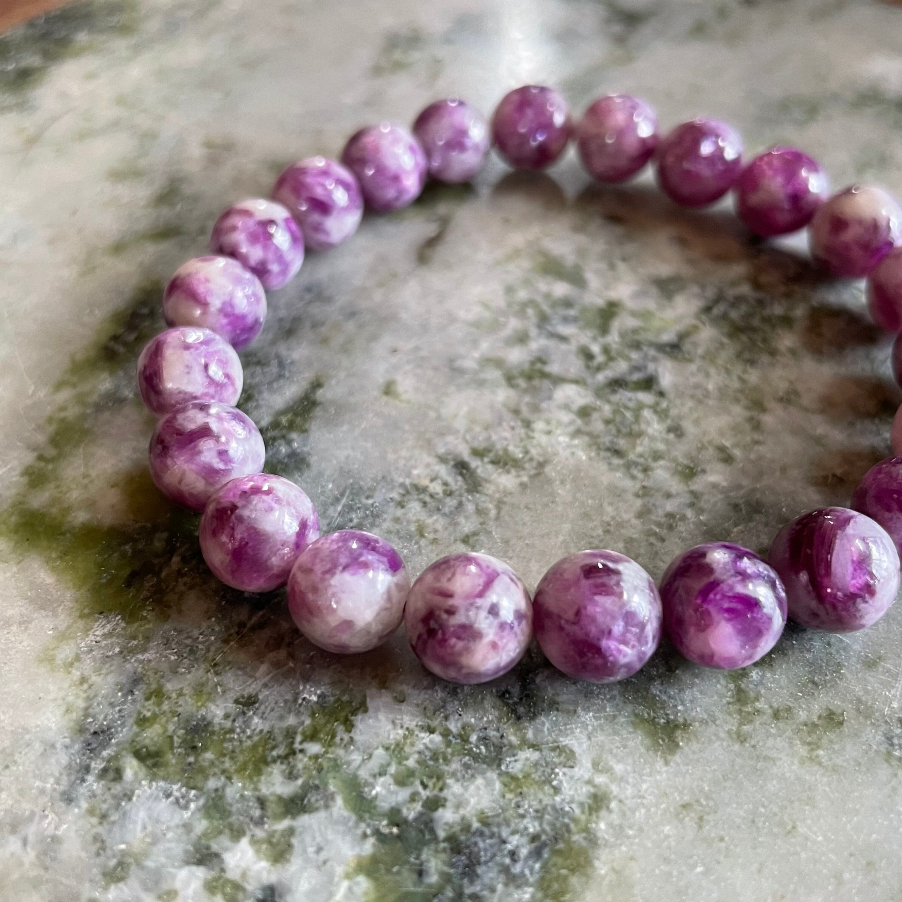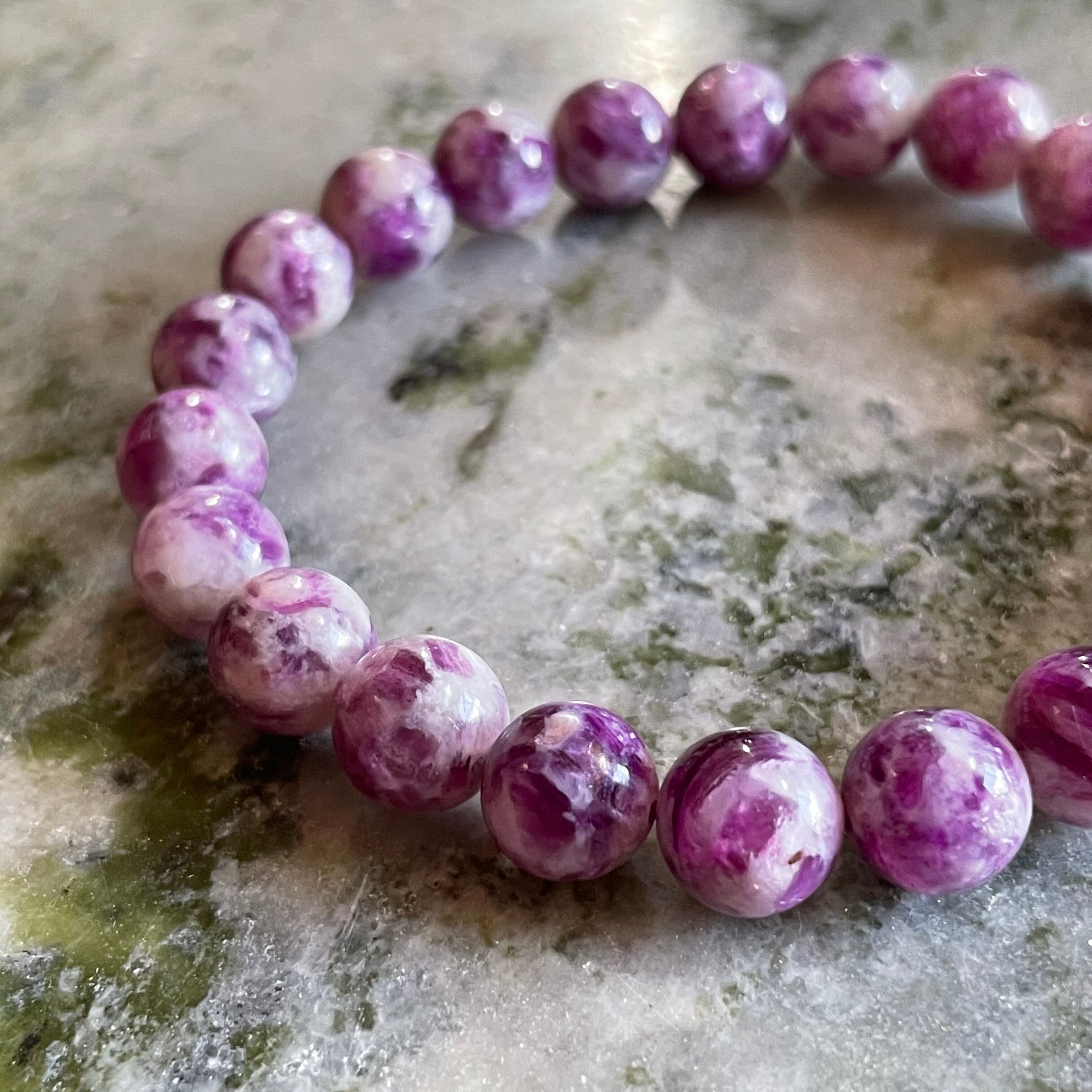 ブルーベリーにラズベリー色を混ぜたような赤みの紫色が美しい色合いの天然石、レピドライト。