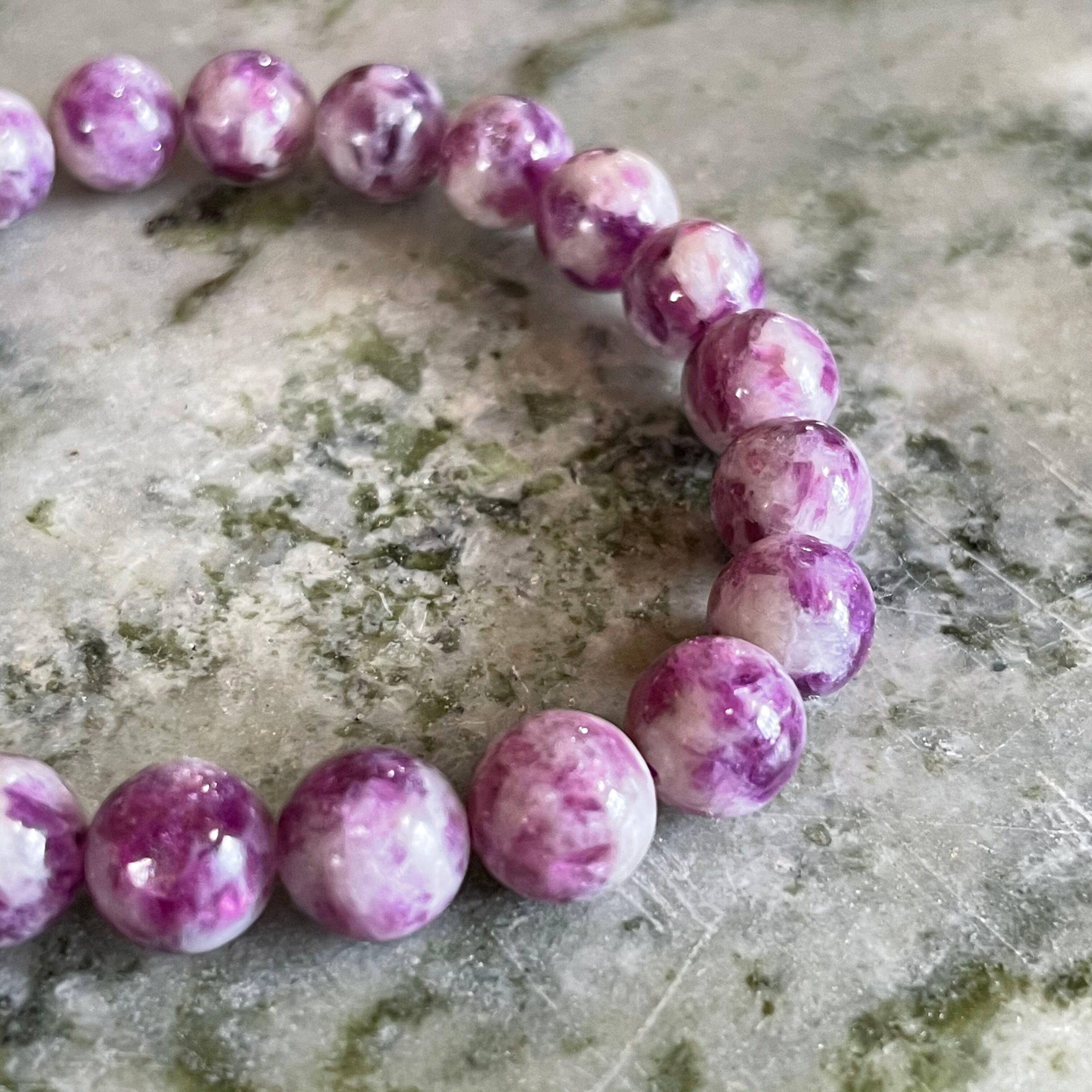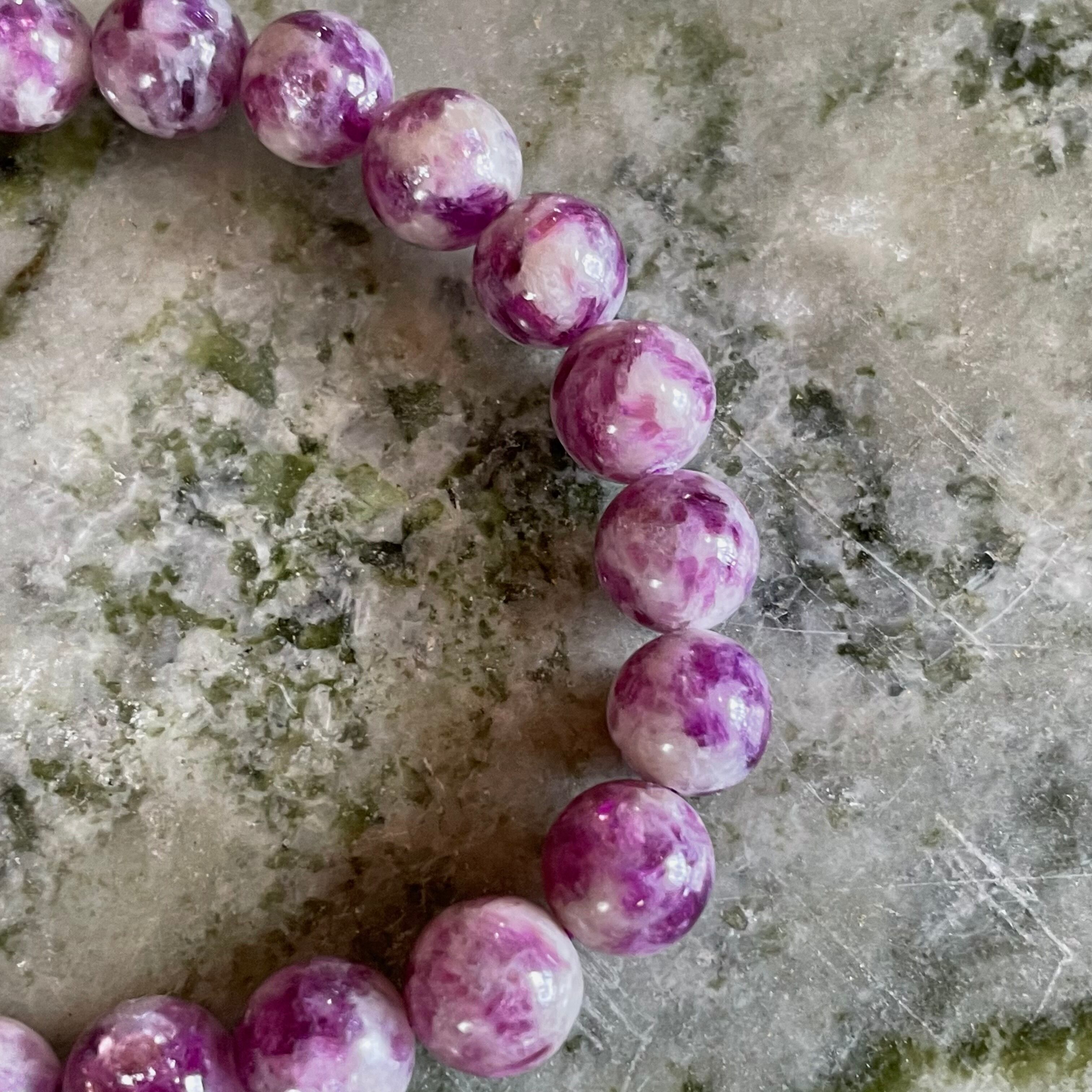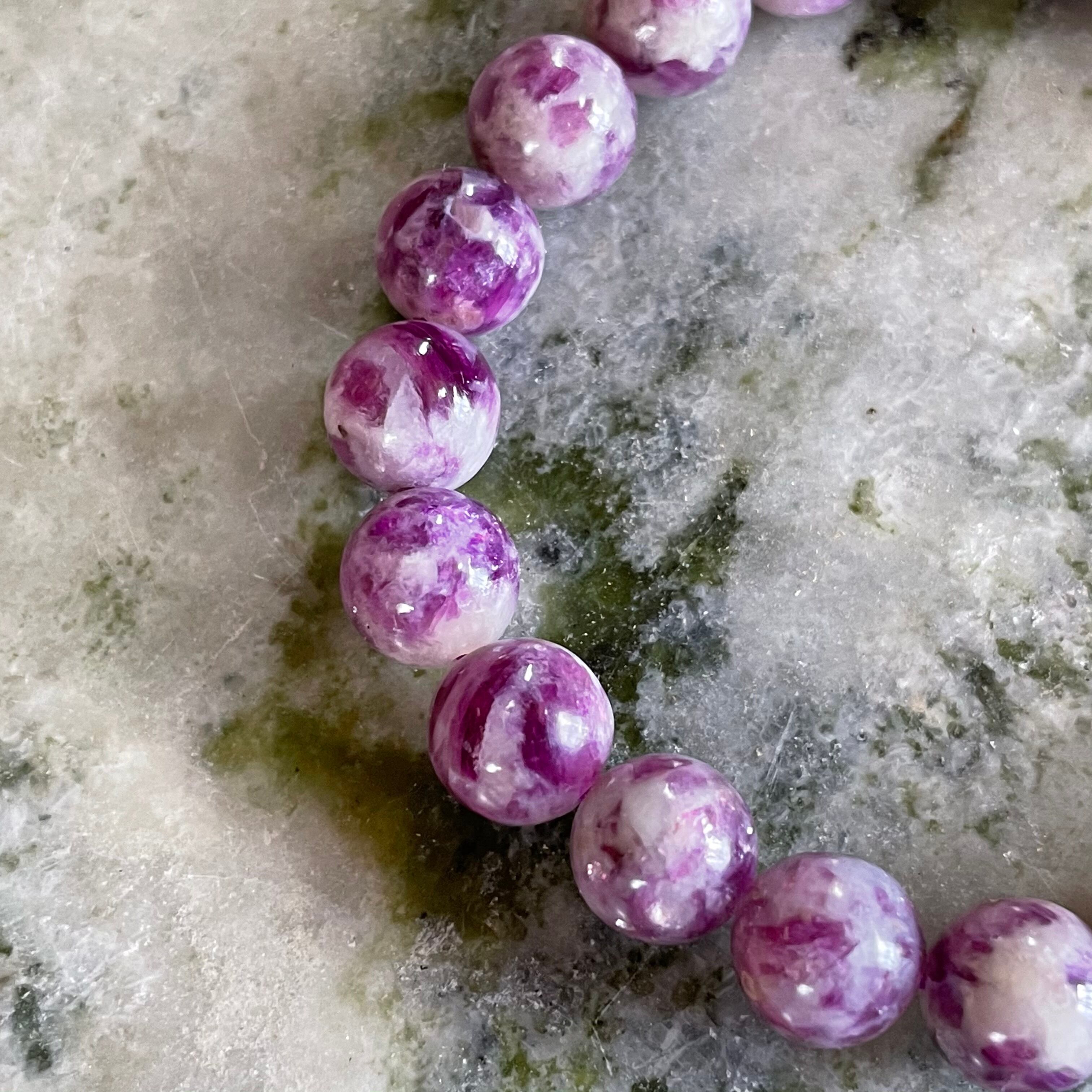 ブルーベリーにラズベリー色を混ぜたような赤みの紫色が美しい色合いの天然石、レピドライト。