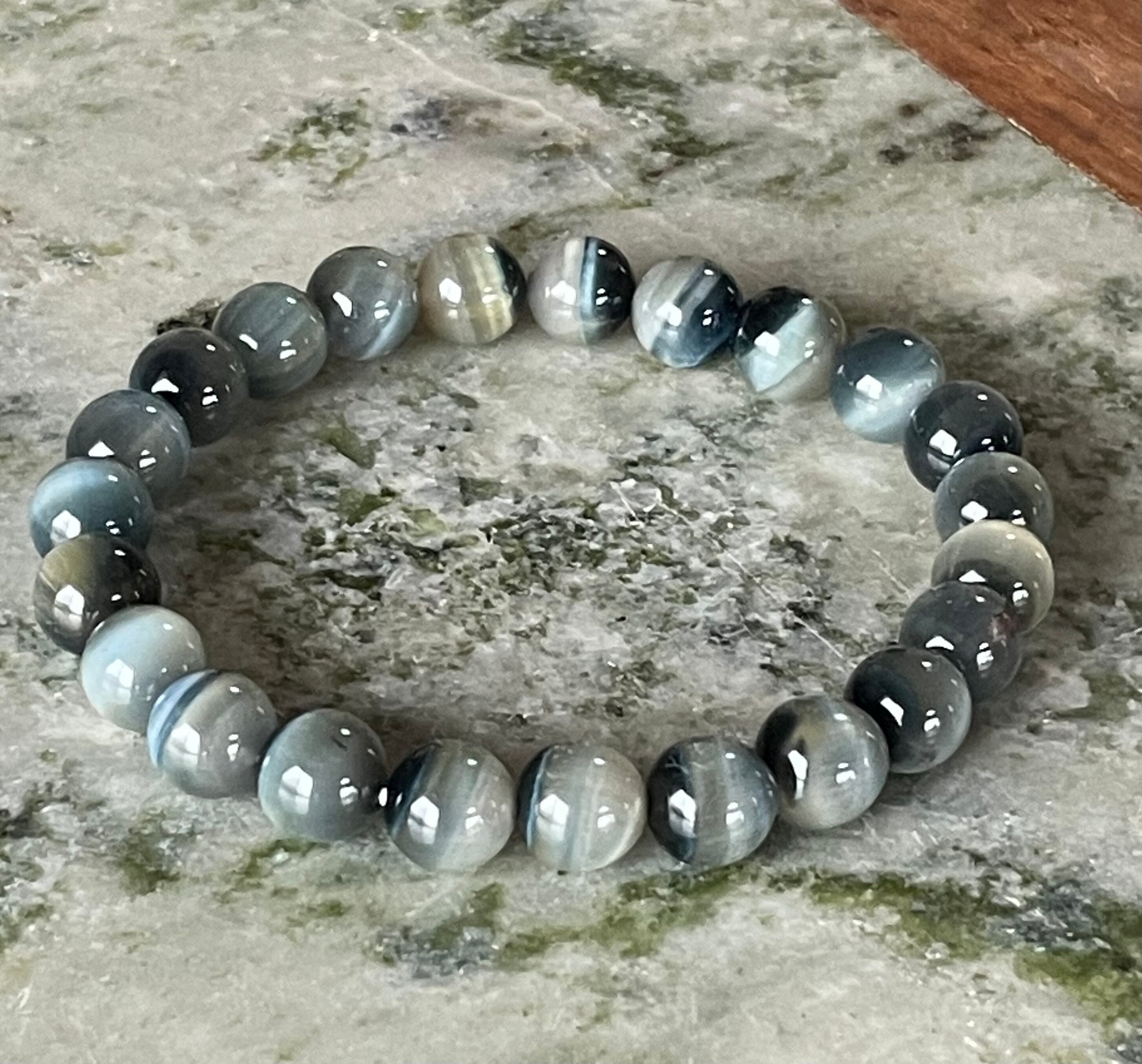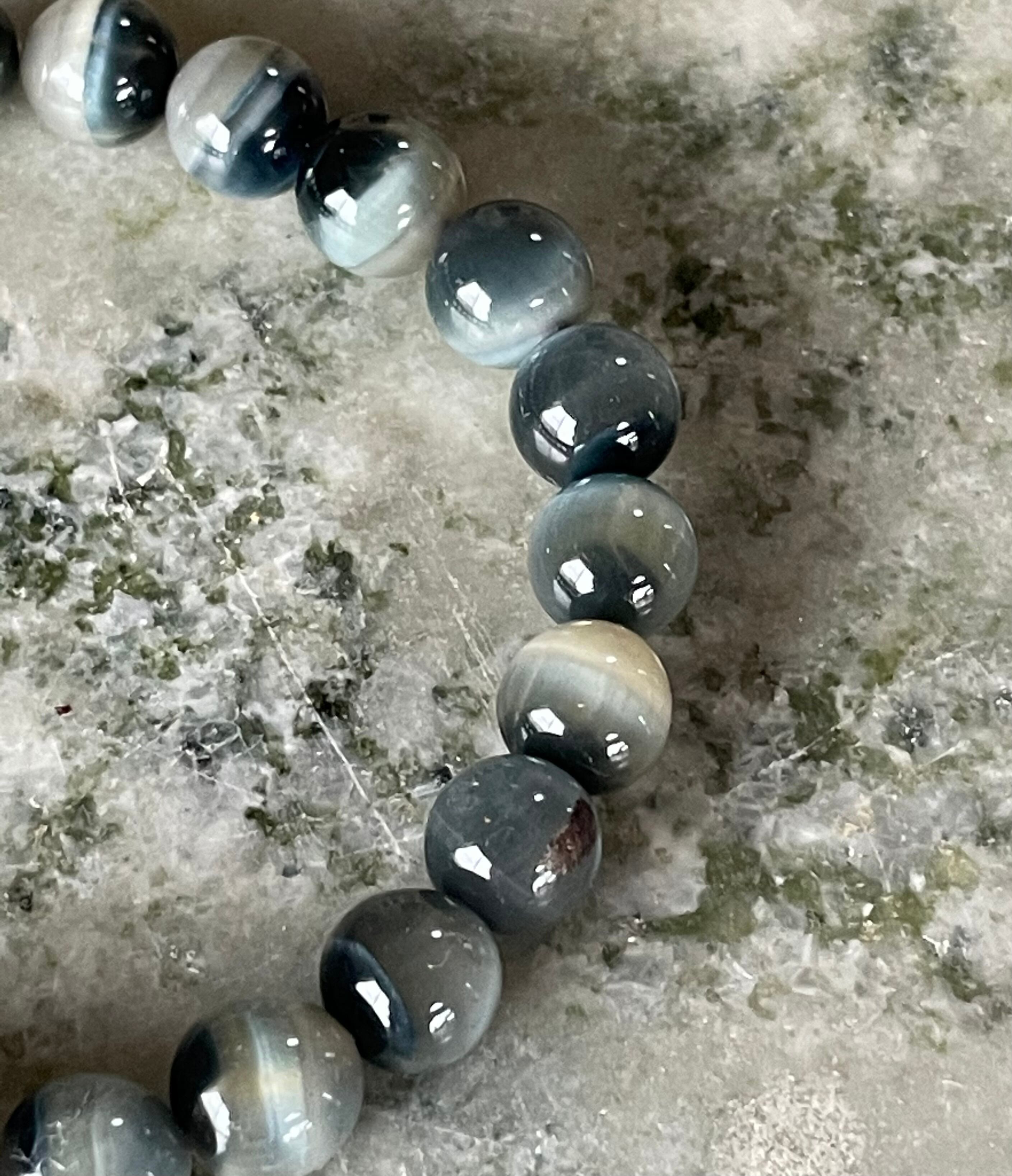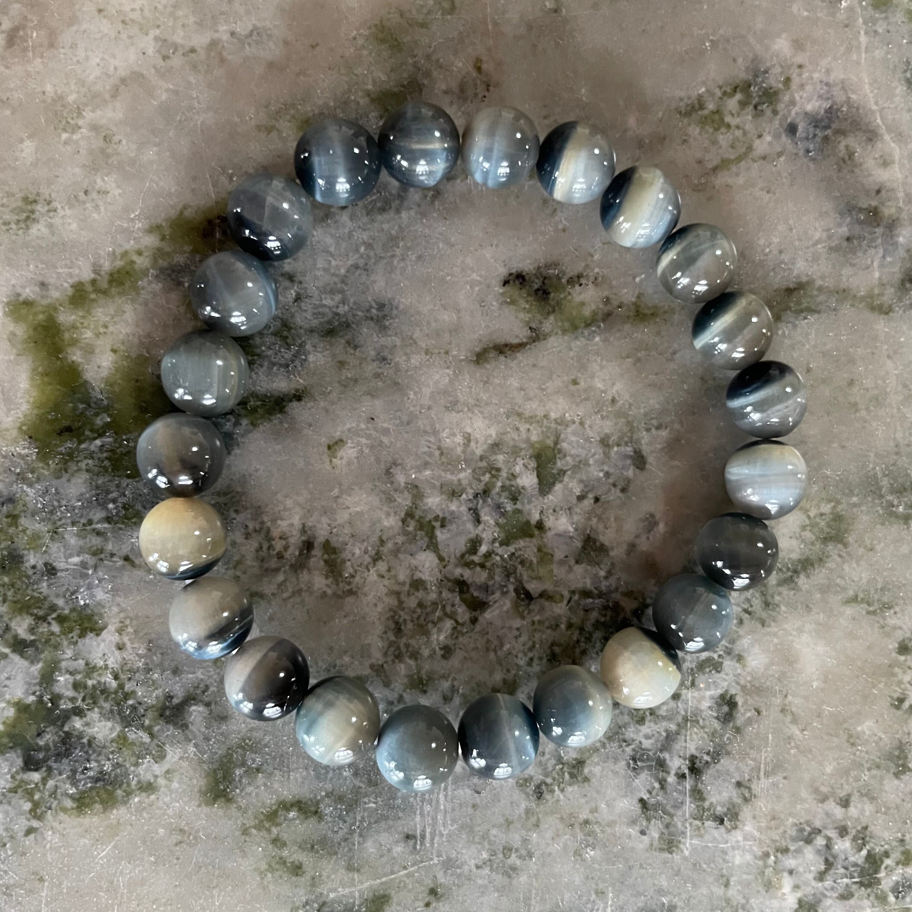 シックな色合いのホークスアイ(ブルータイガーアイ)に水晶が美しく混ざり合う、ホークスアイシリカのブレスレットです。