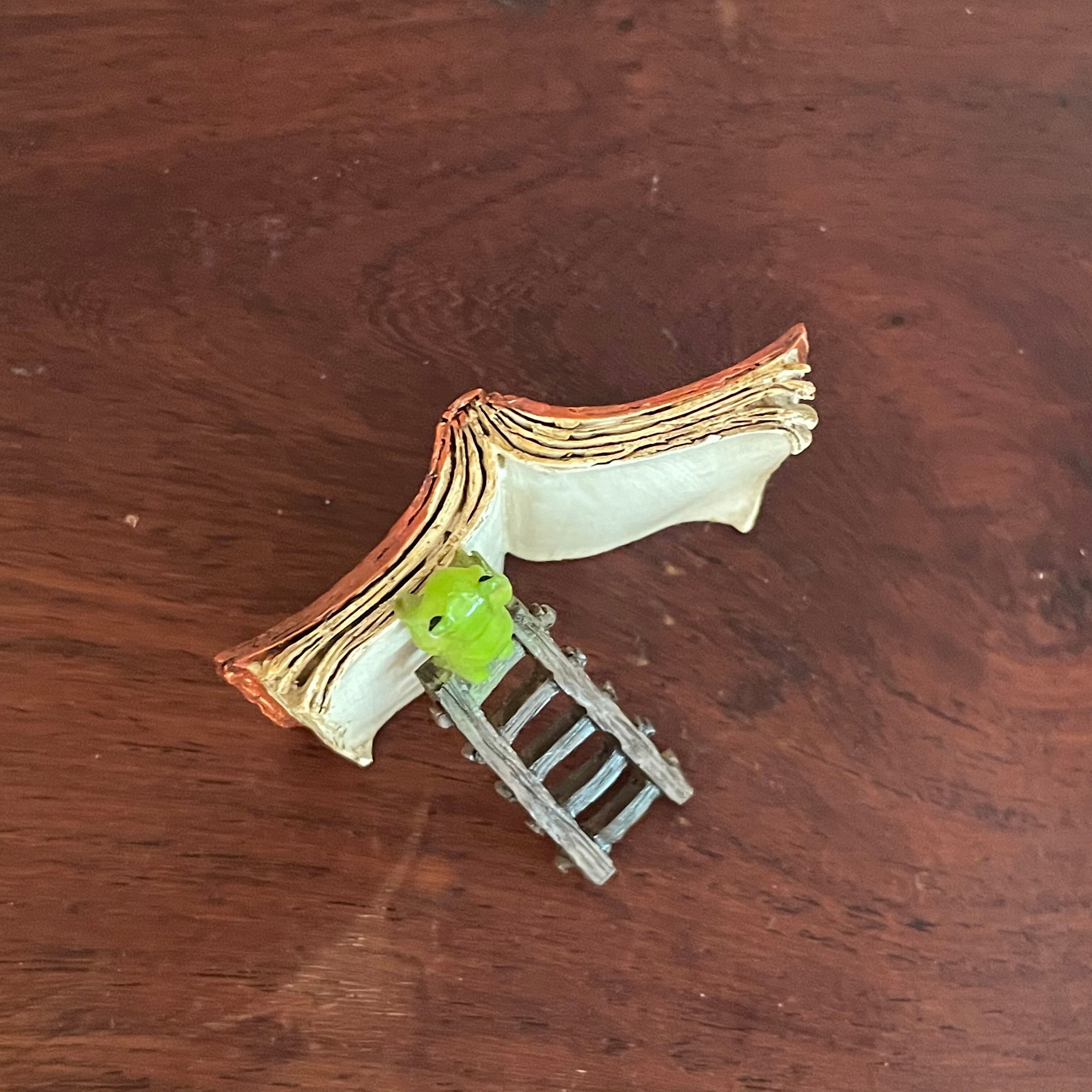 アンティーク調の本からはしごに登ったカエルさんが顔を出しています。