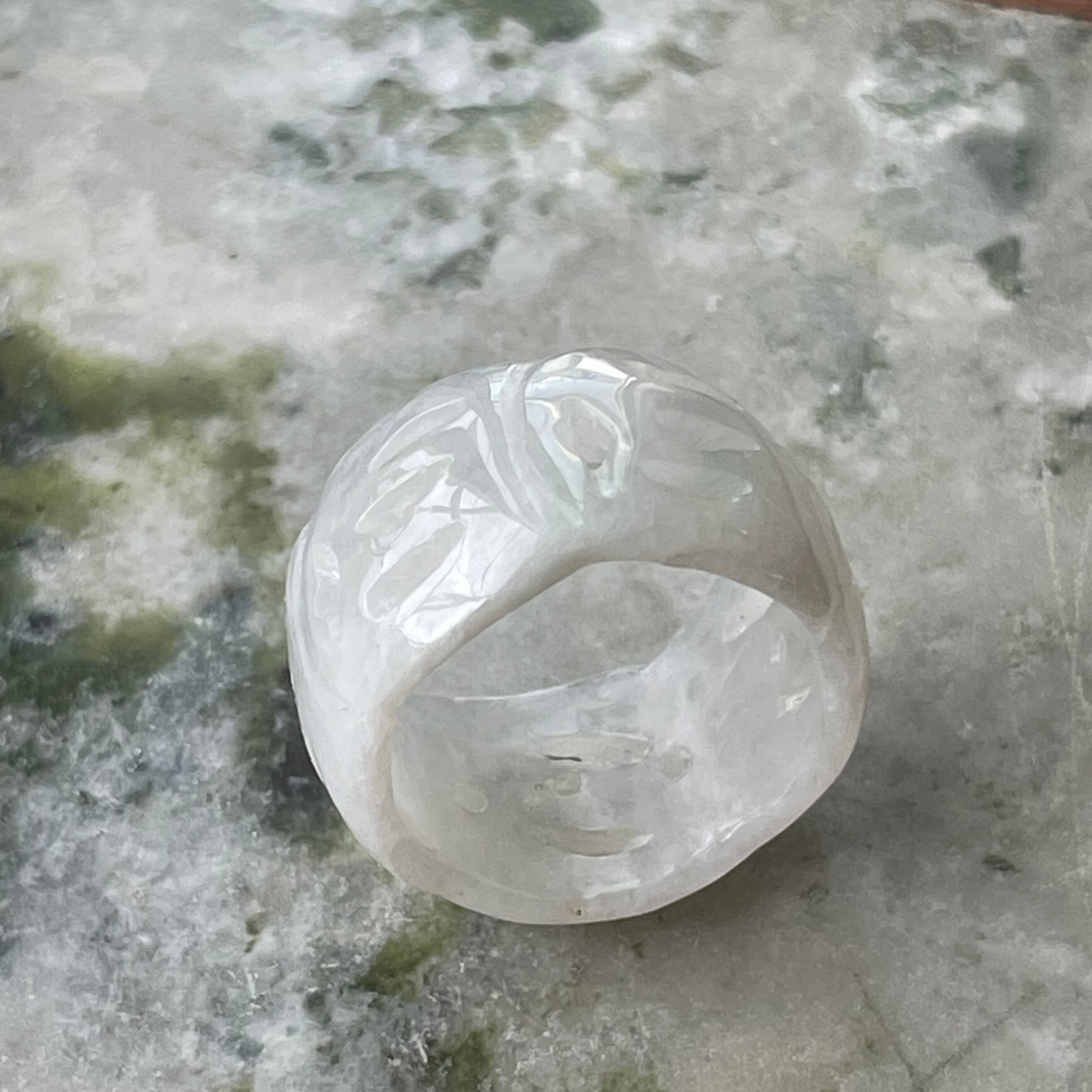 手に馴染むシンプルなデザインの翡翠リング、こちらは約30年程前のデットストック品です。ところどころアクセントとして石に彫刻がしてあります。
