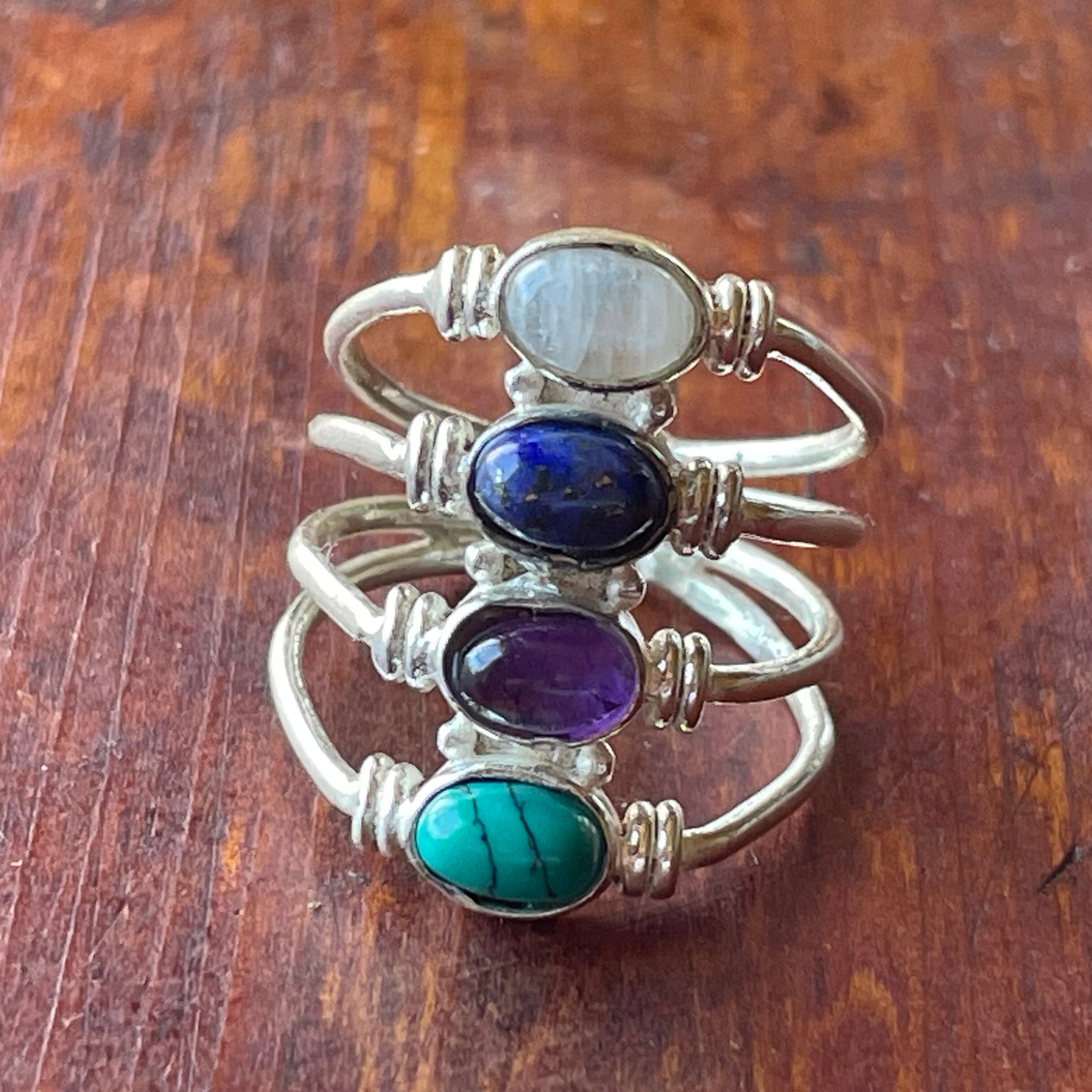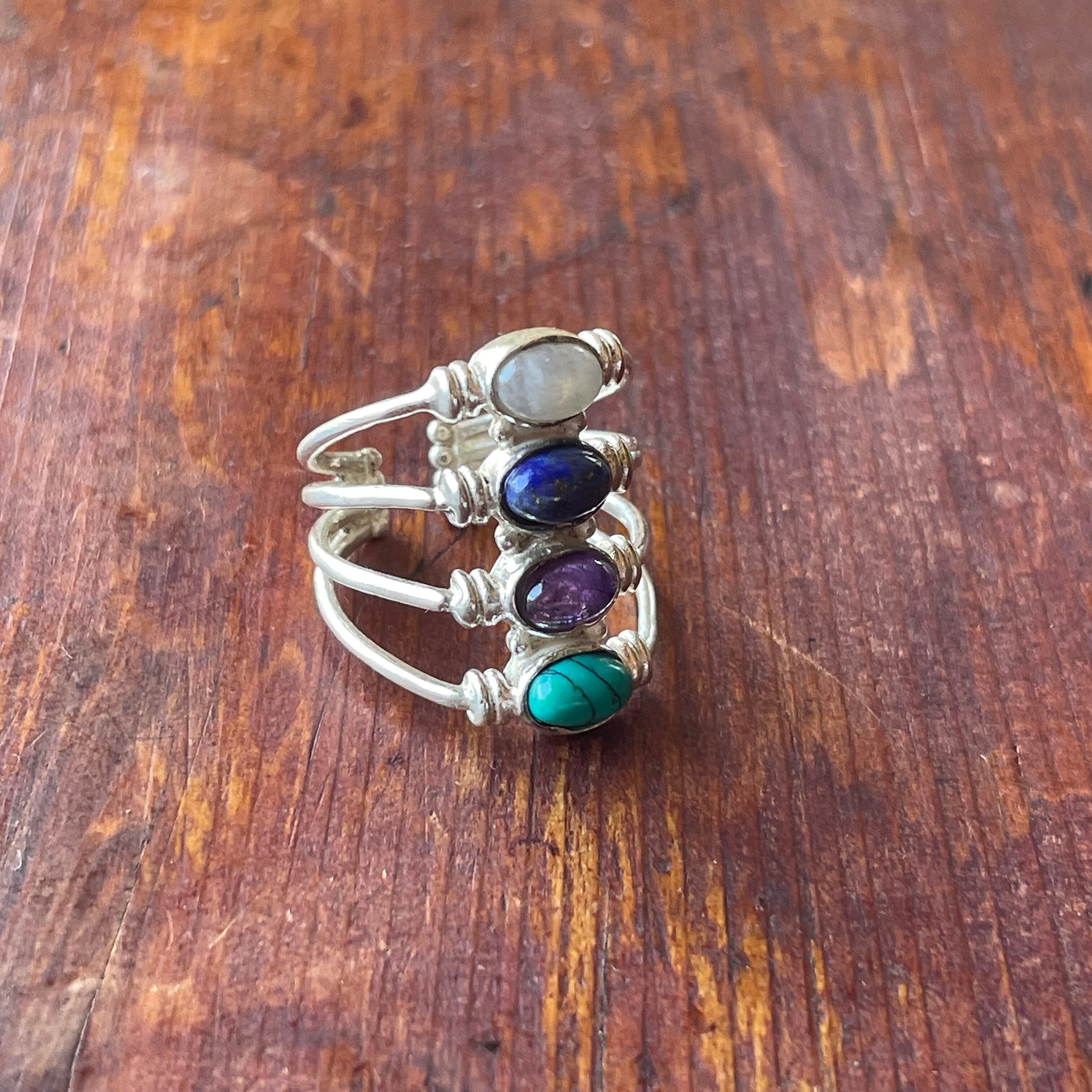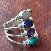 天然石リング4連で、手元に華やかさをプラスしませんか?控えめなサイズ感の天然石がつらなることでちょうど良いバランスのリング、ターコイズ、アメジスト、ラピスラズリー、ムーンストーンと色の組み合わせも素敵ですね。