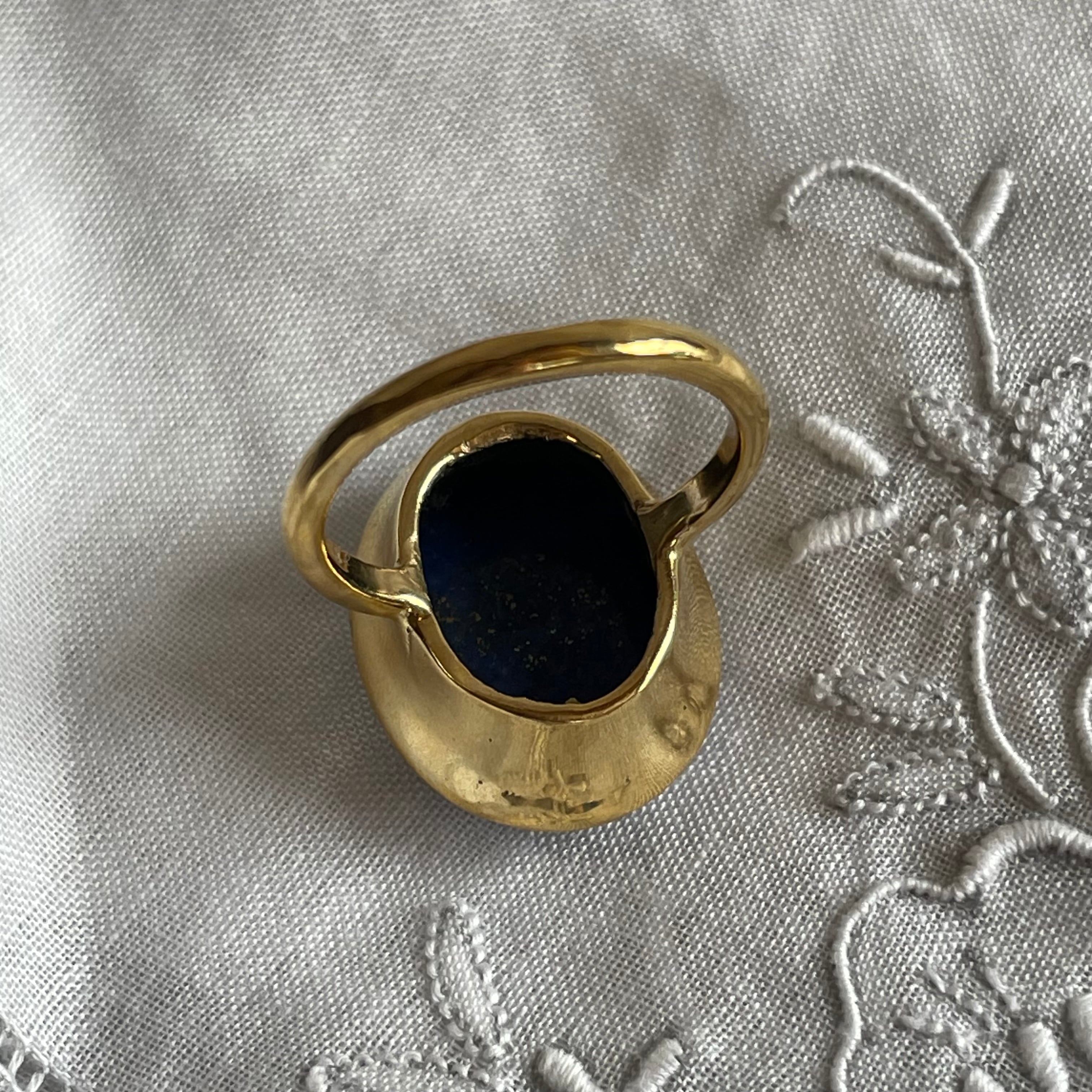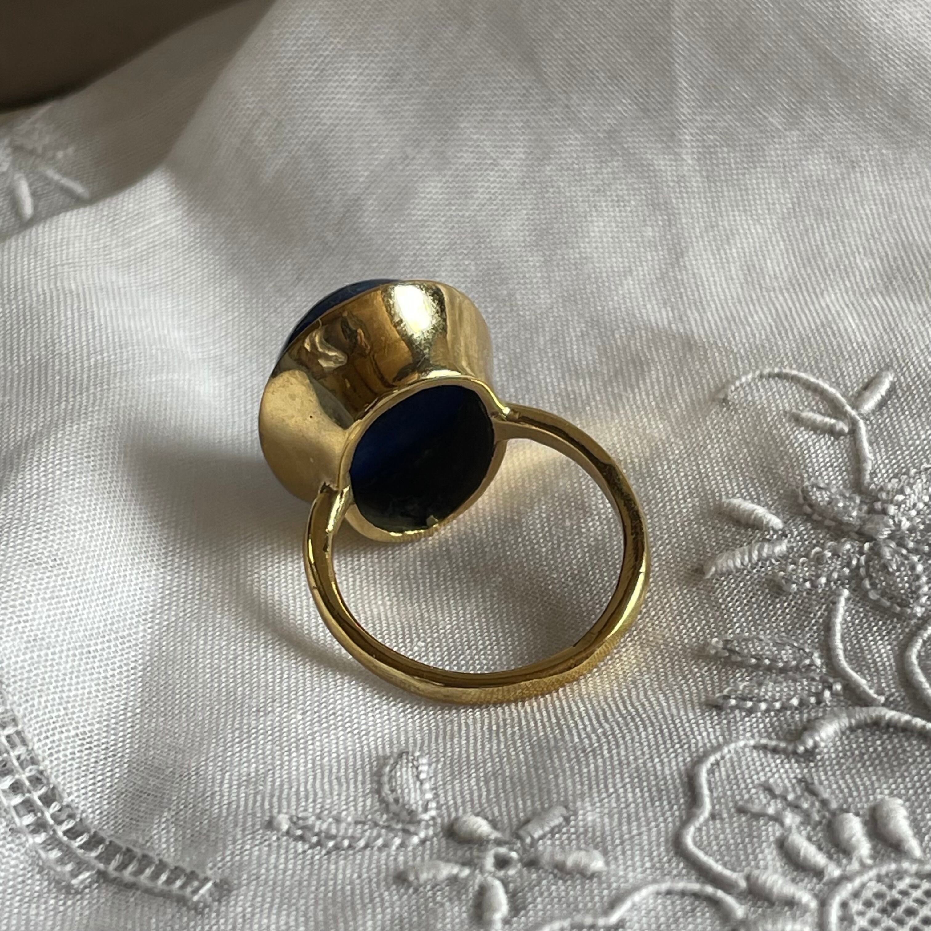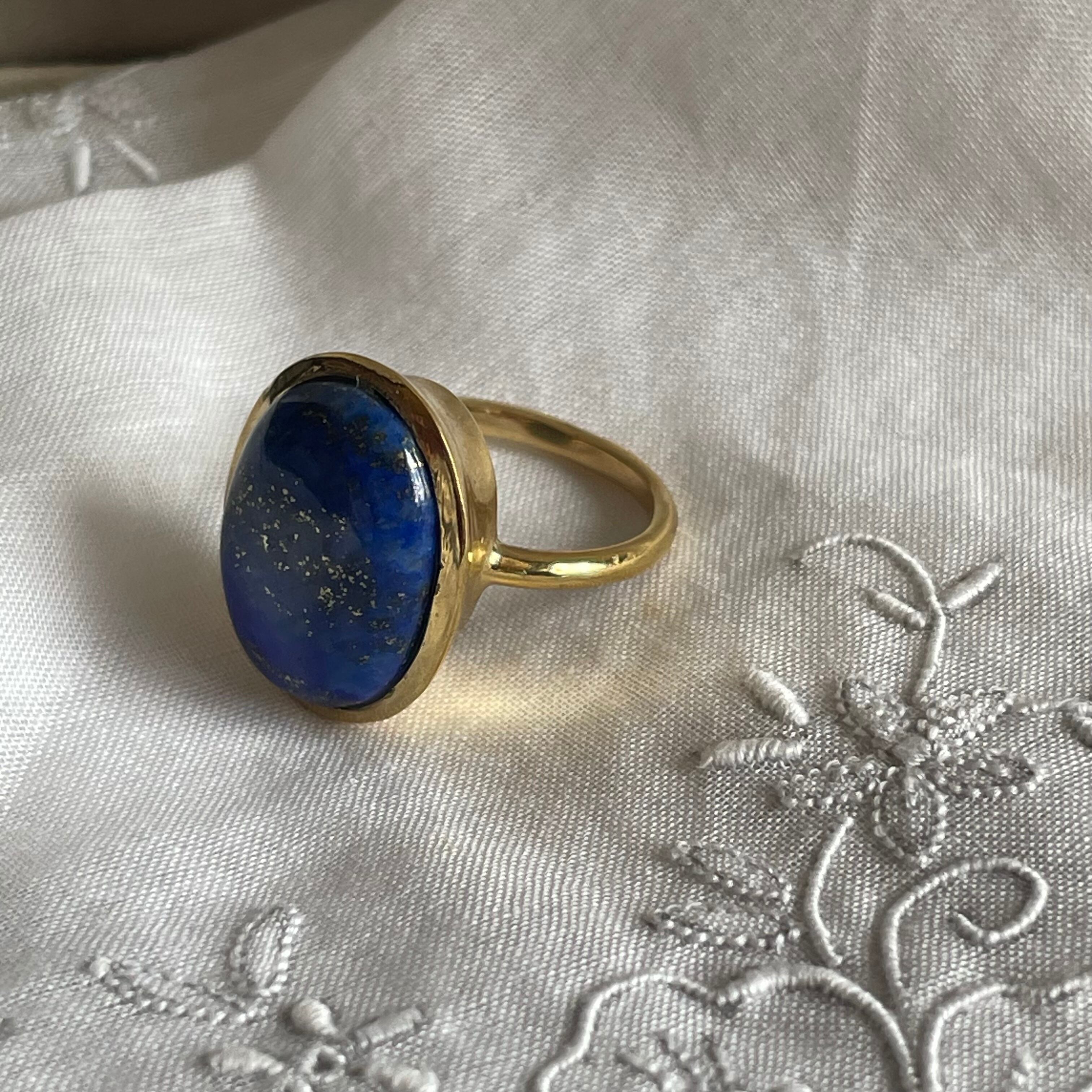 深い青が魅力のラピスラズリーのリング。大ぶりで存在感のあるデザインが特徴です。深い青色の石が指元を華やかに彩ります。
