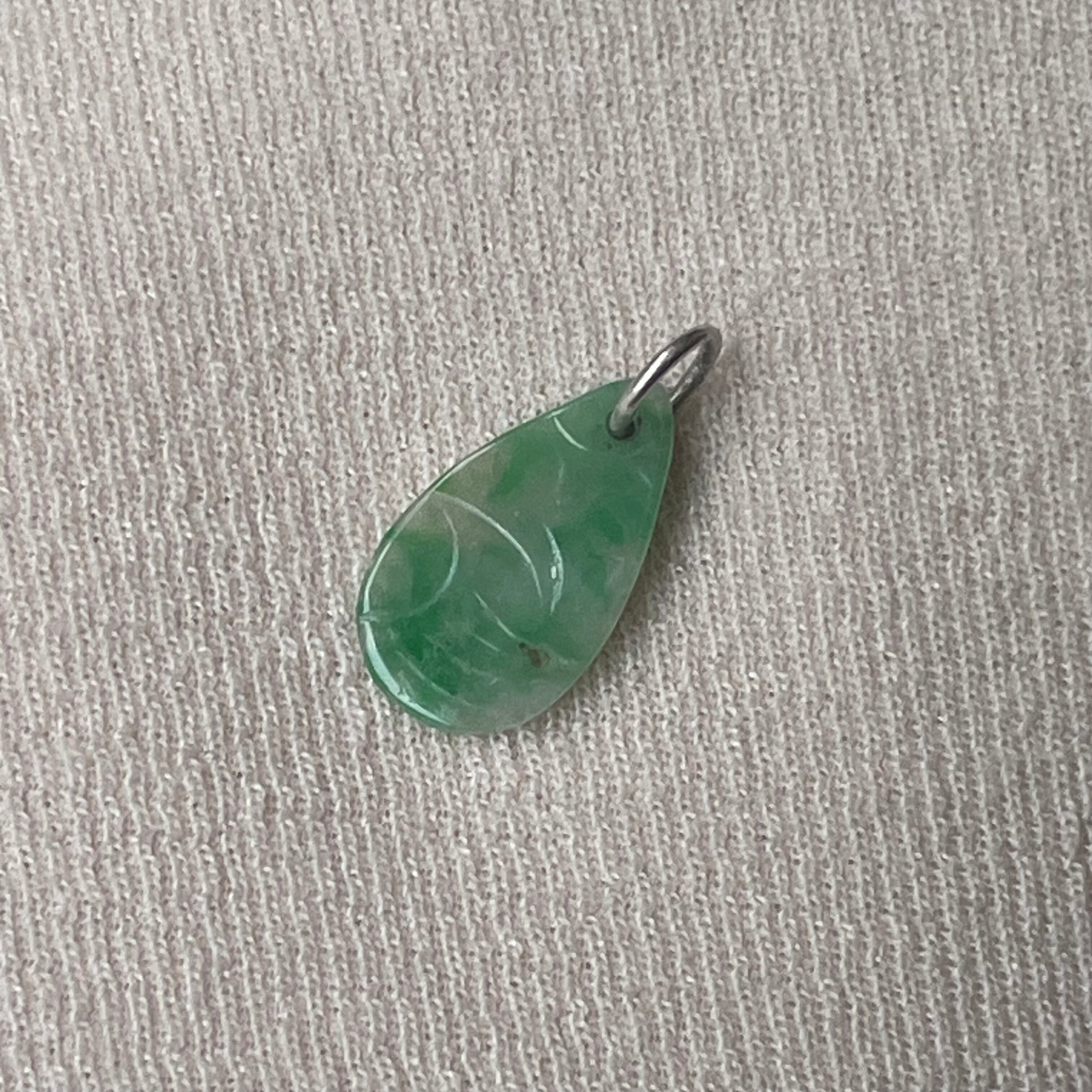 なみだ形が可愛い小さめサイズの翡翠、ところどころに模様のように入っている明るめの緑色が美しいですよ。