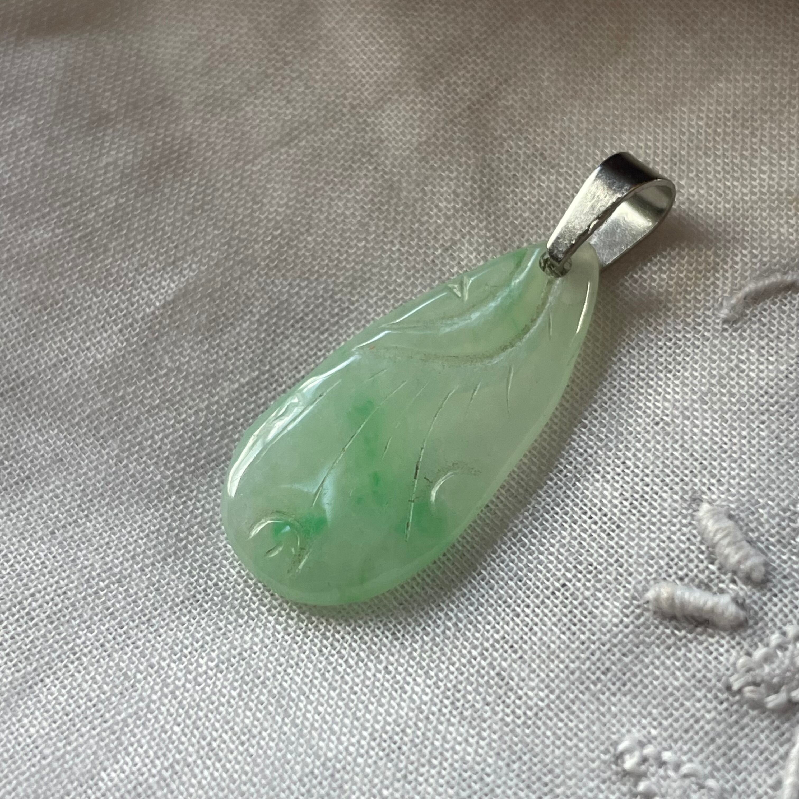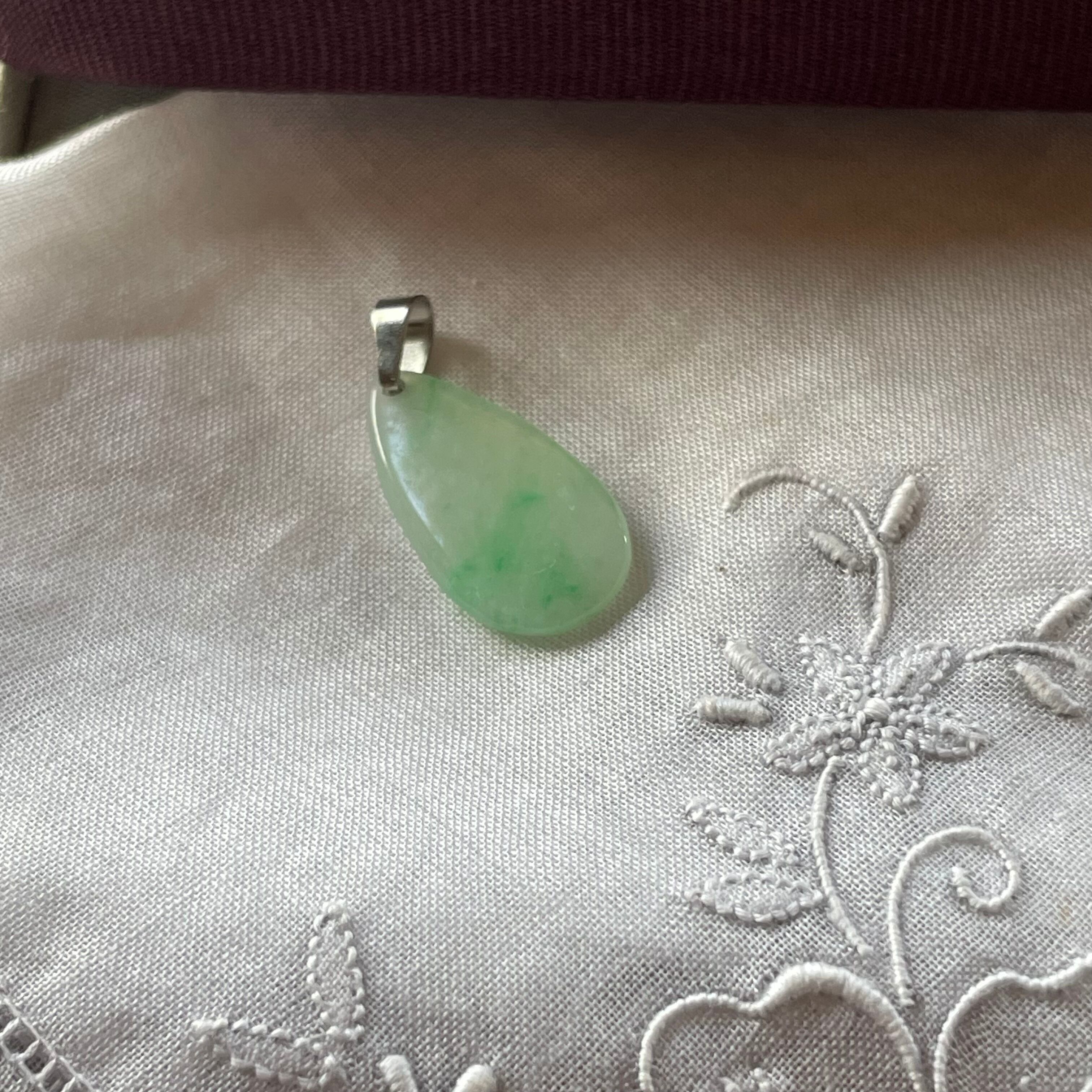 なみだ形のふんわりと優しい雰囲気の翡翠。片面はうっすらと彫りがあります。両面で趣きが異なっているのも魅力です。