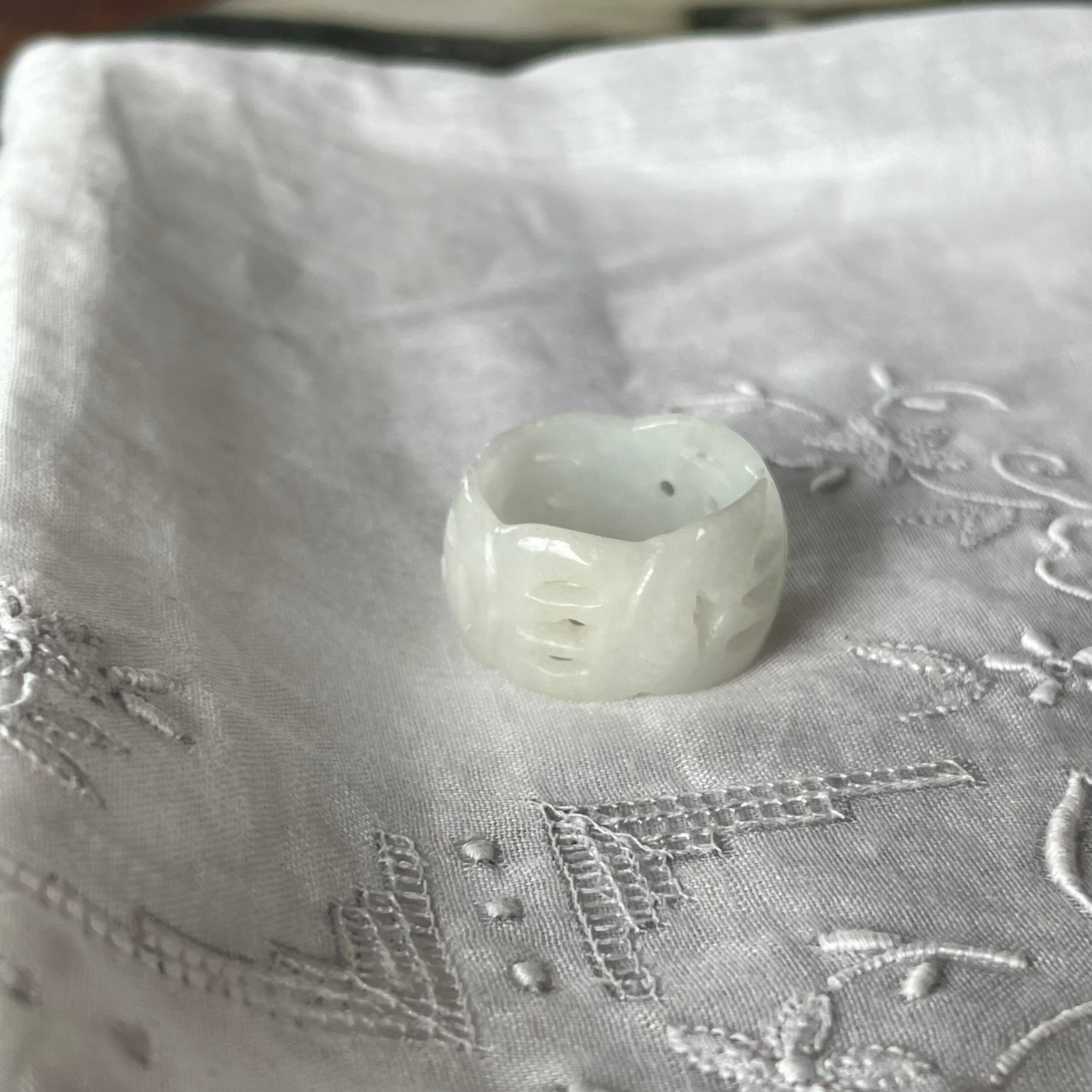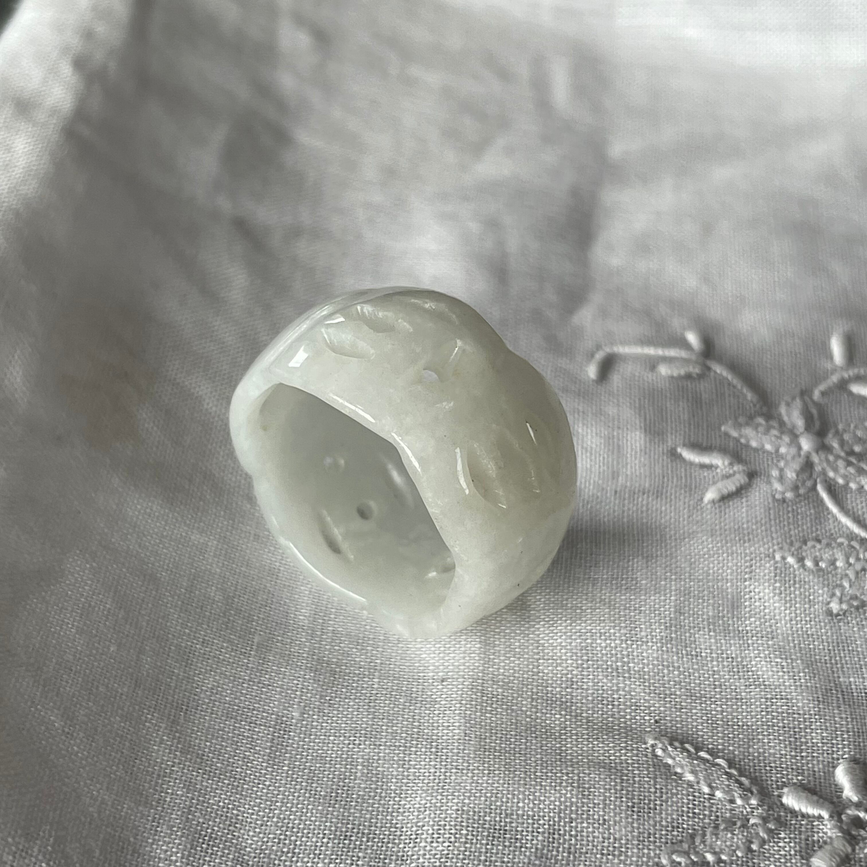 手に馴染むシンプルなデザインの翡翠リング、こちらは約30年程前のデットストック品です。ところどころアクセントとして石に彫刻がしてあります。