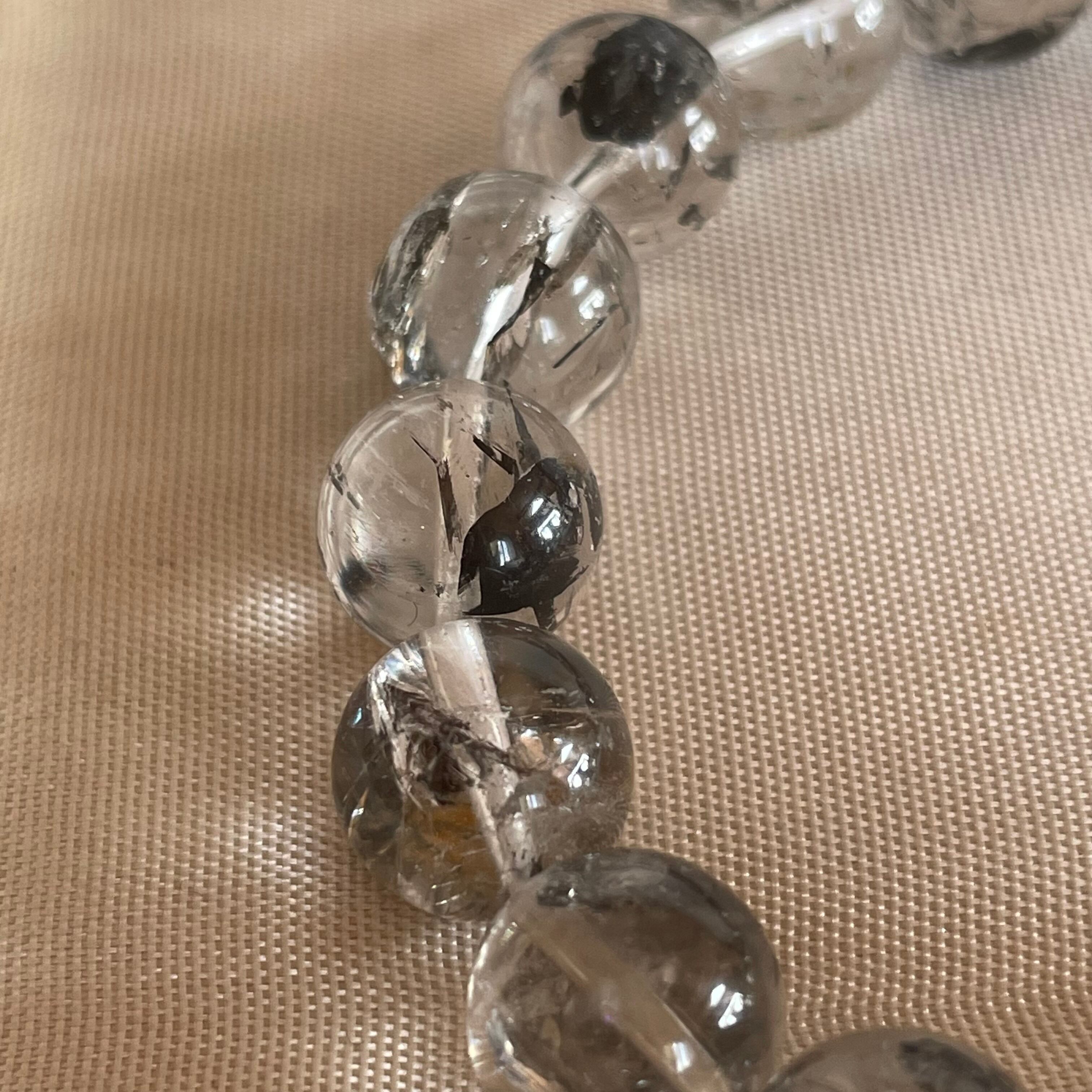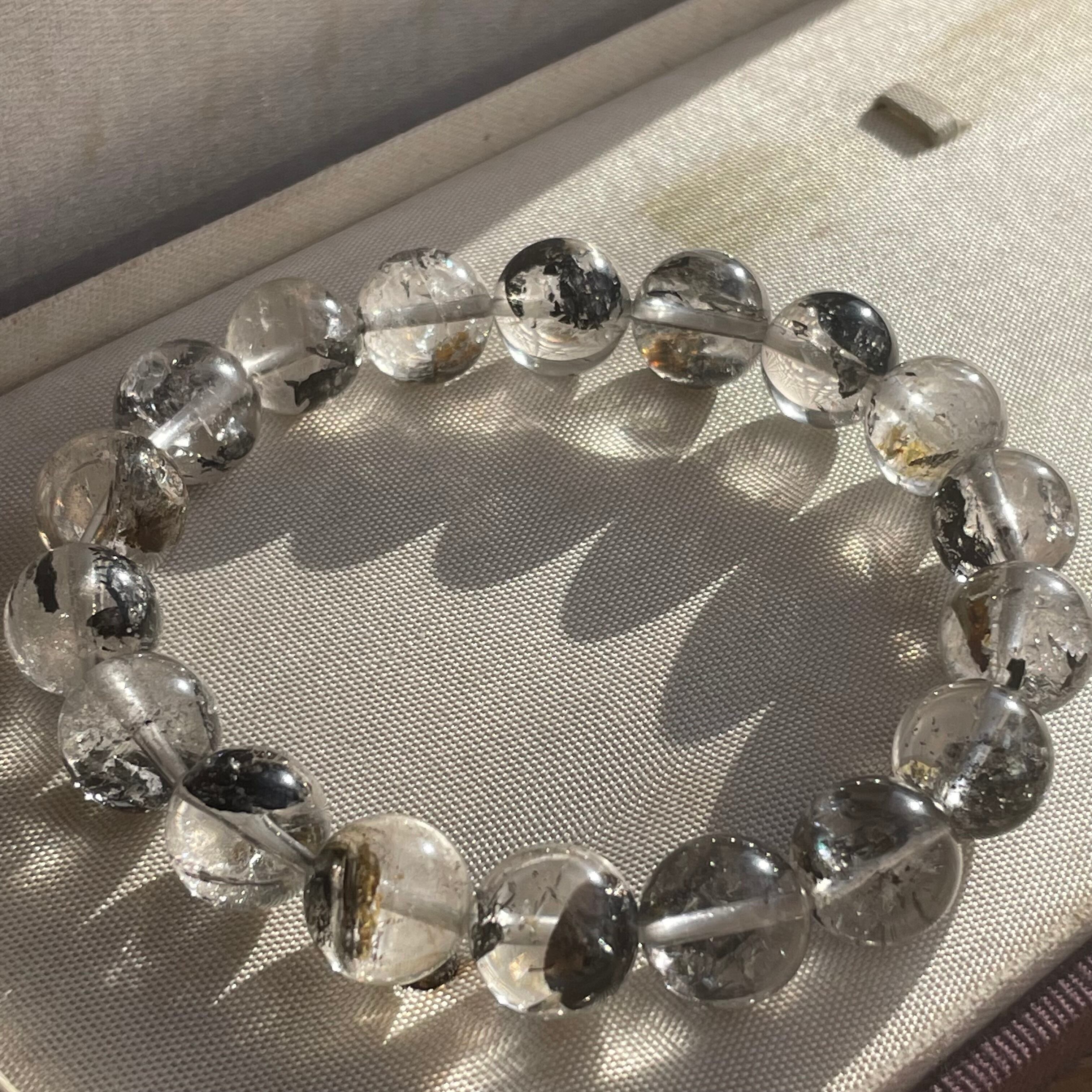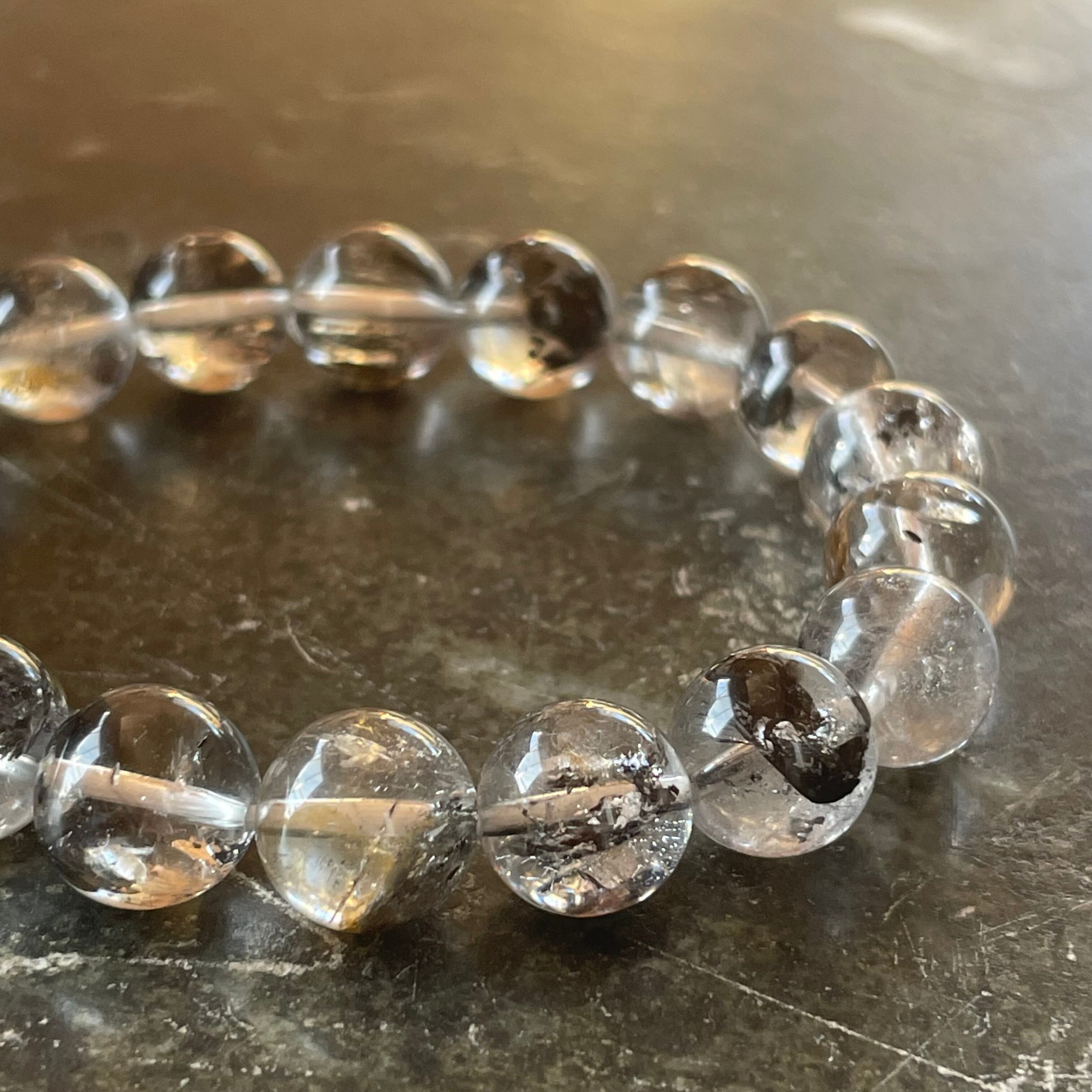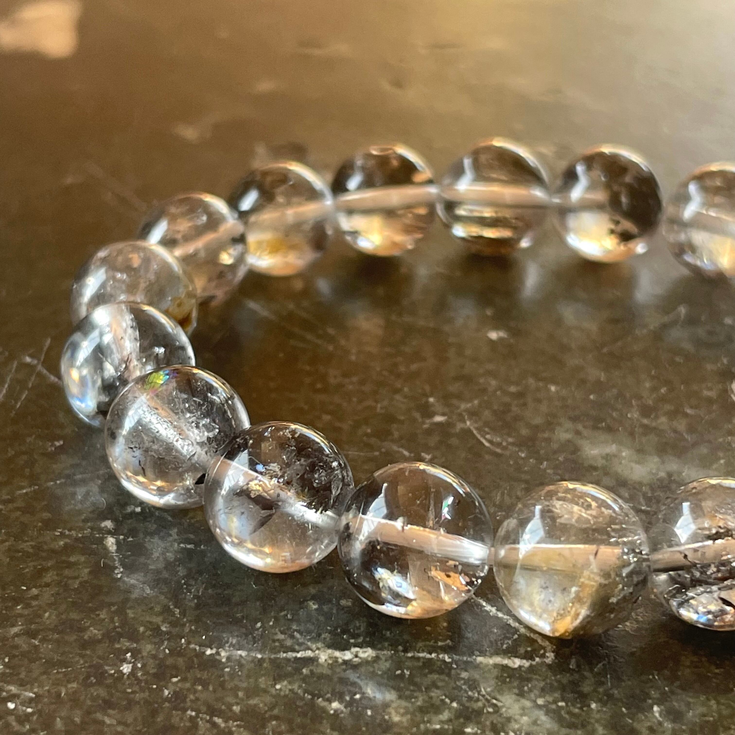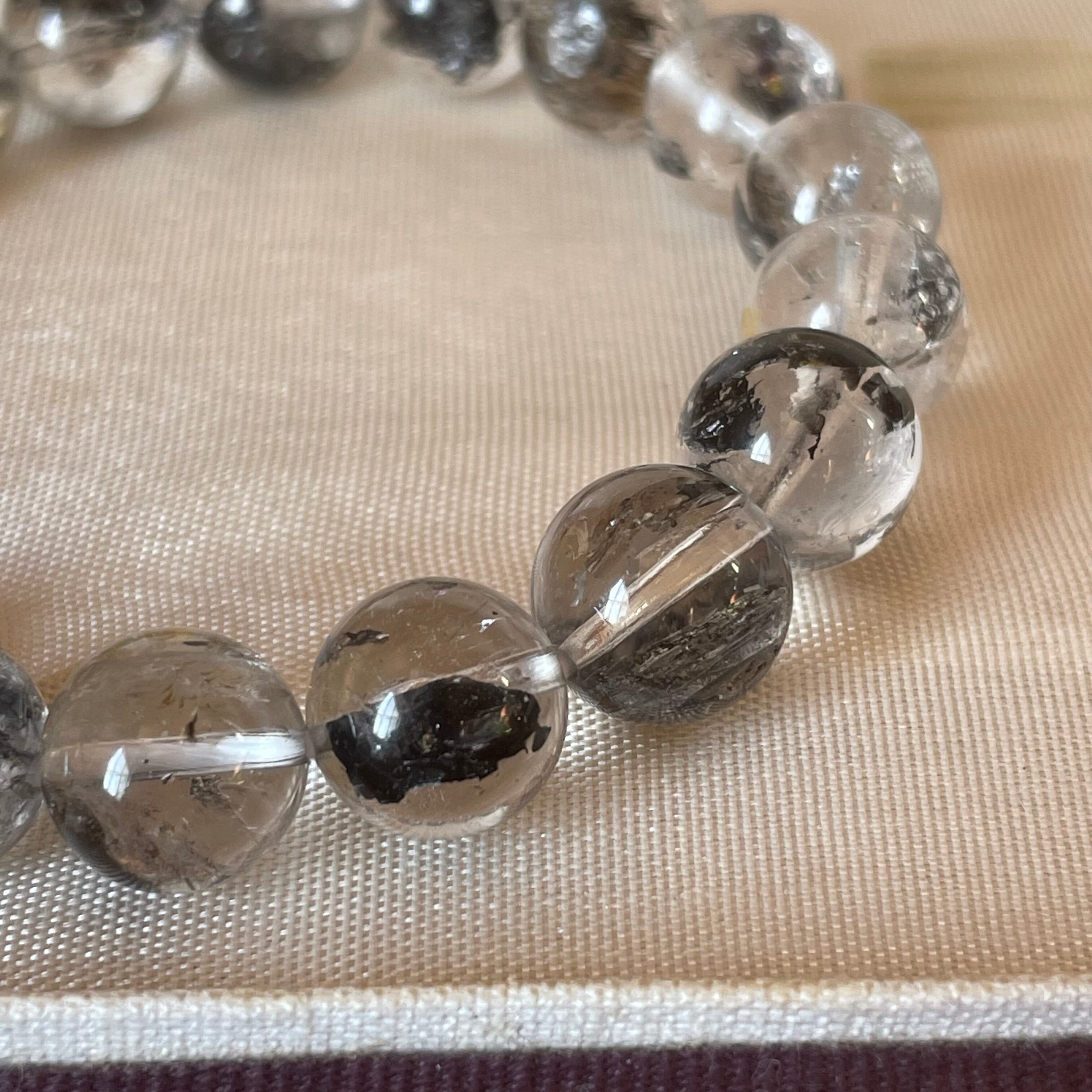 素晴らしい透明感にとこどころ入った黒い鉱物がアクセントになっている美しいブレスレットです。