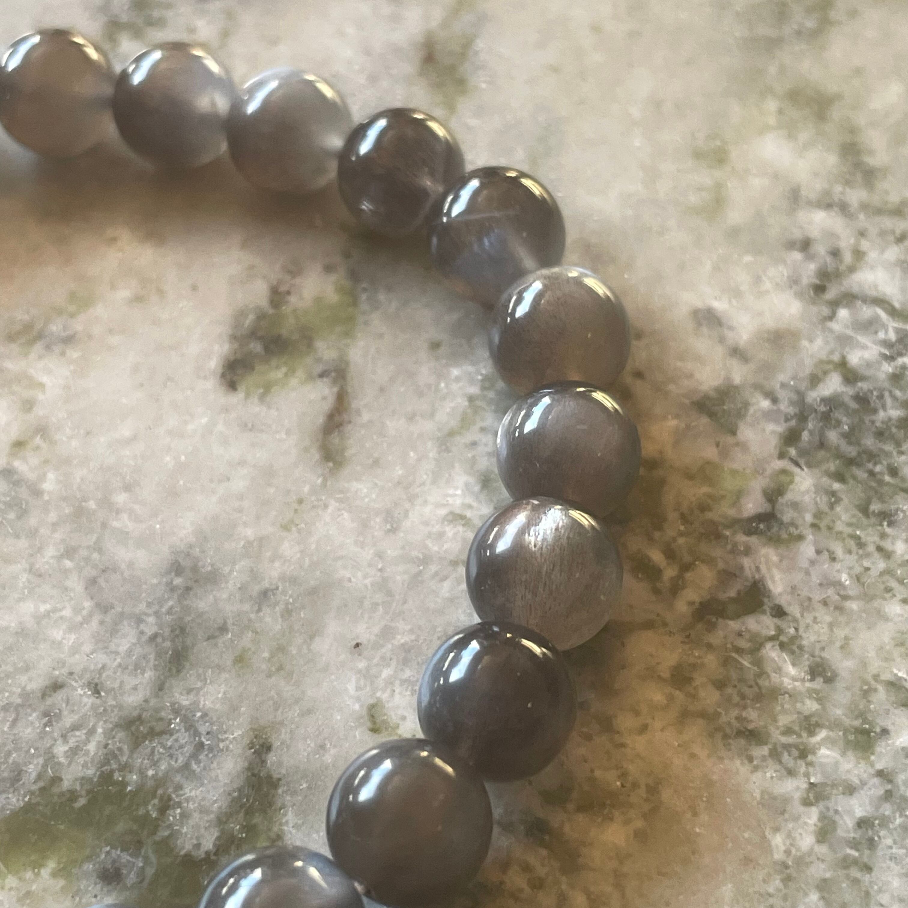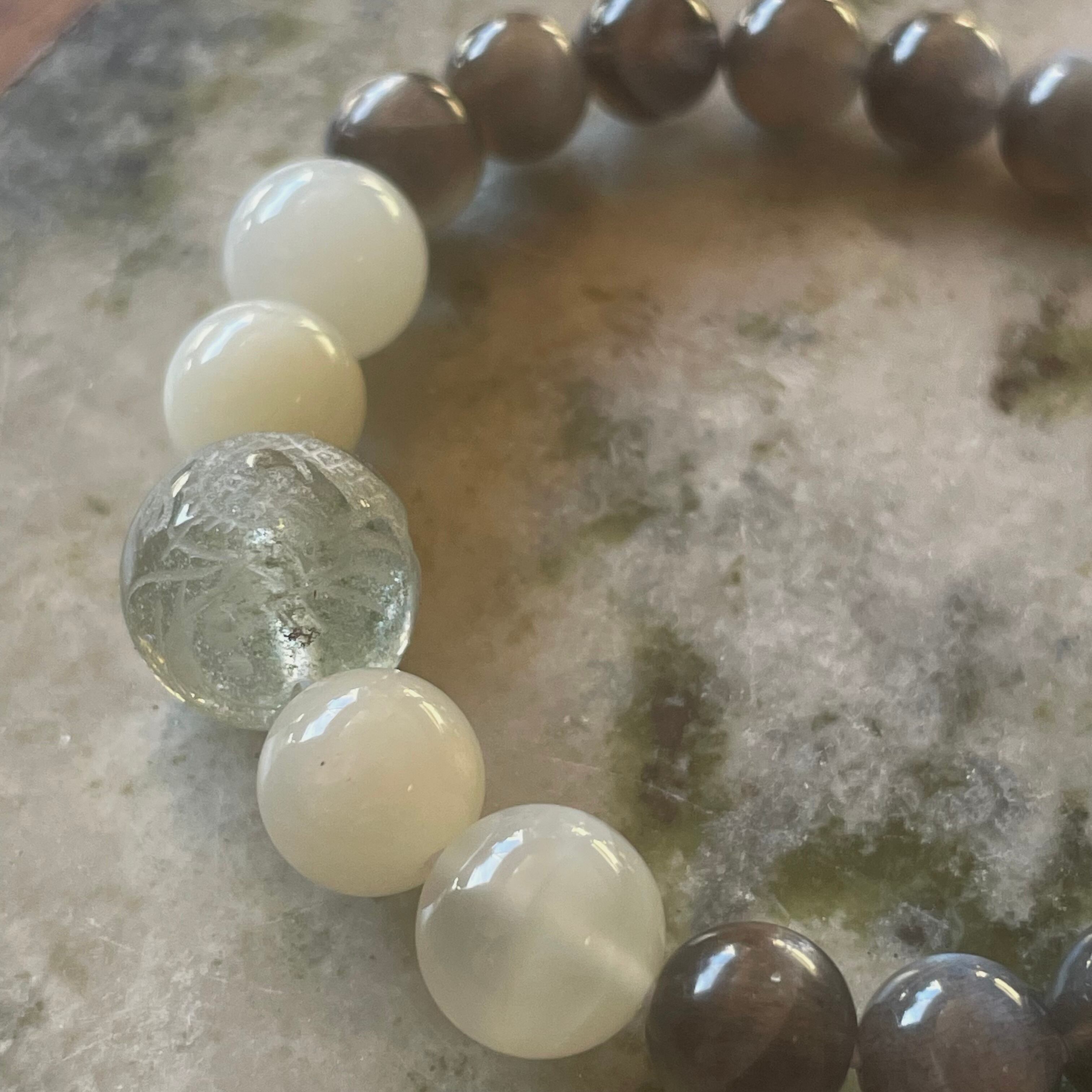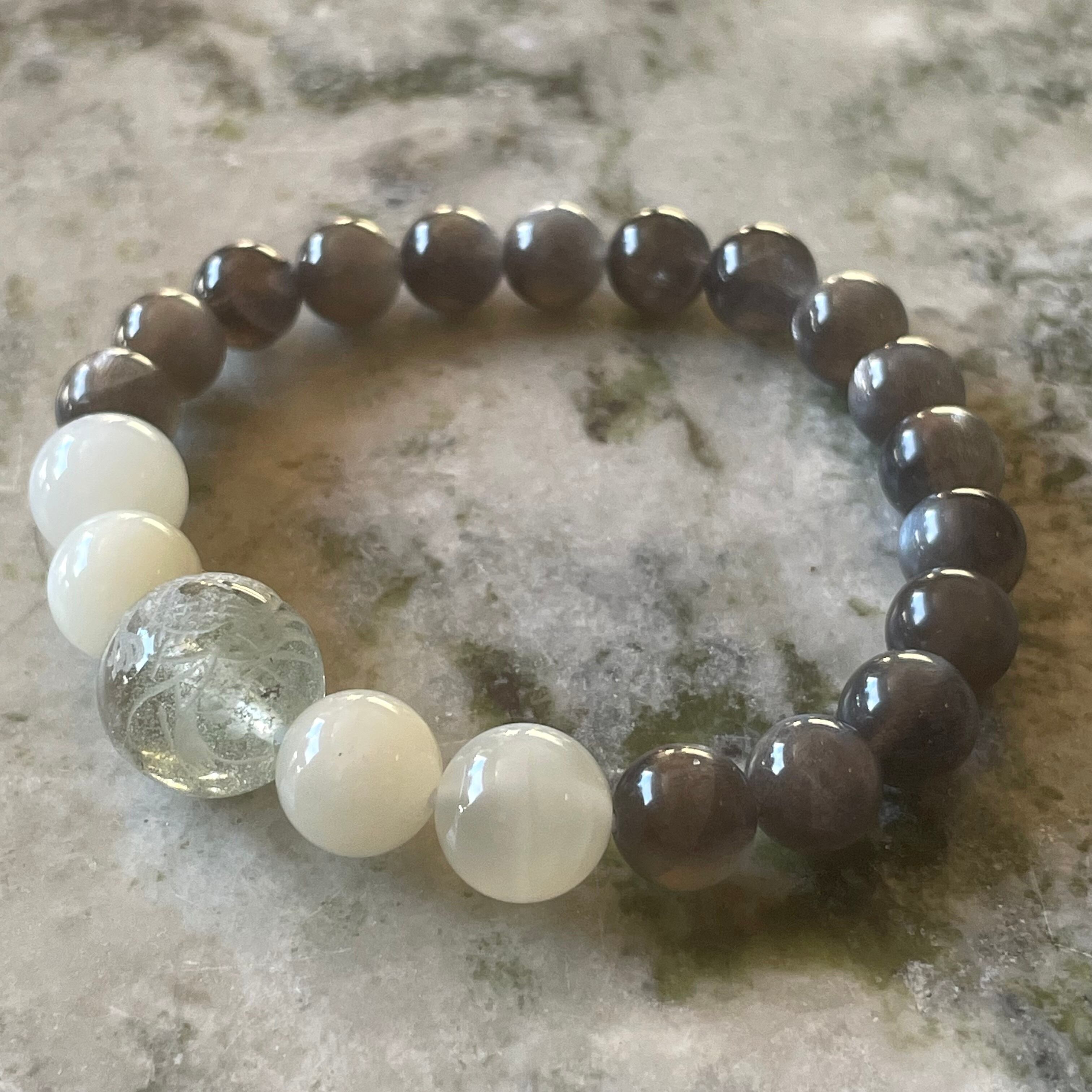 希少性の高い輝きが美しいブラックサンストーン、包み込むような優しい乳白色のムーンストーン、龍彫のガーデン水晶を組み合わせたブレスレットです。