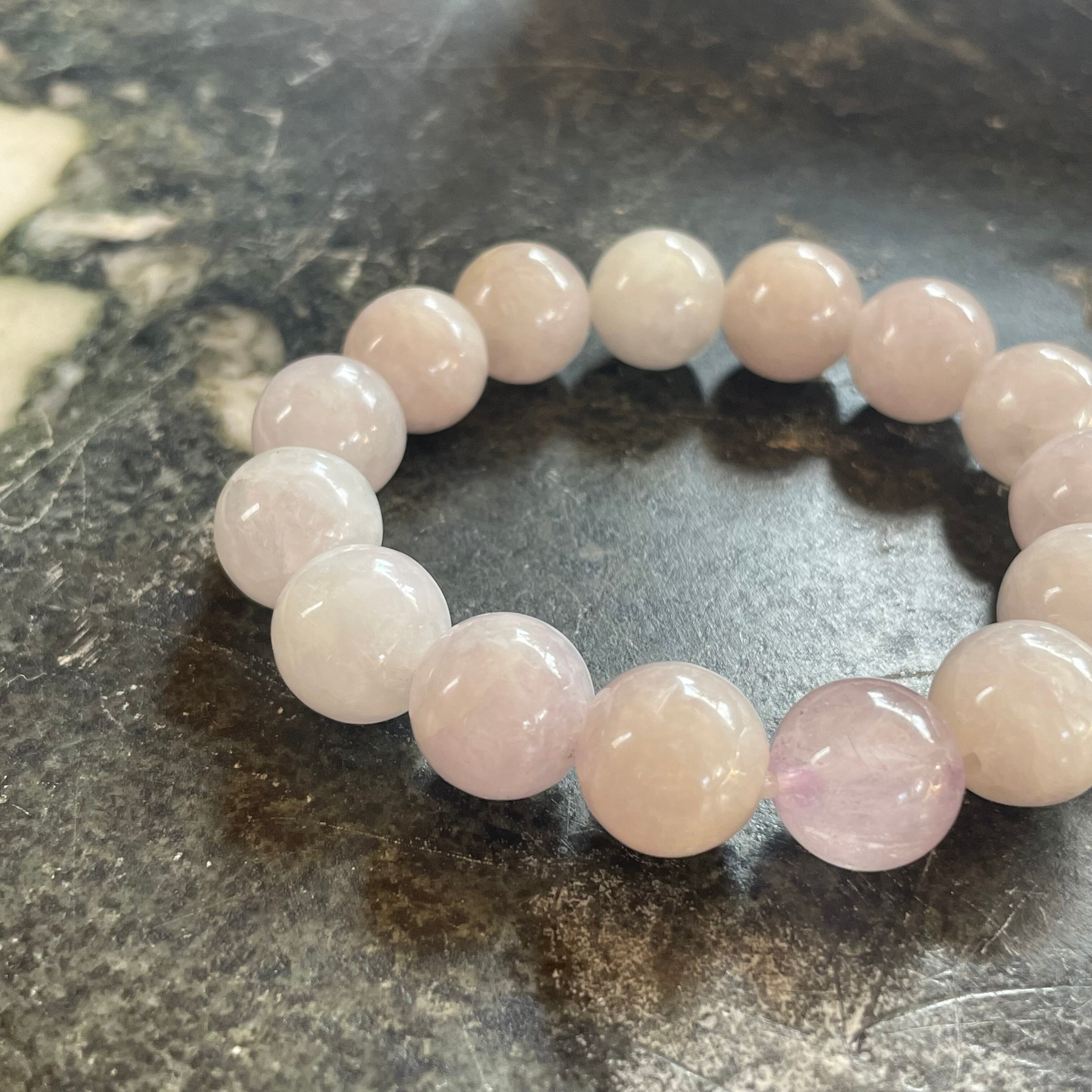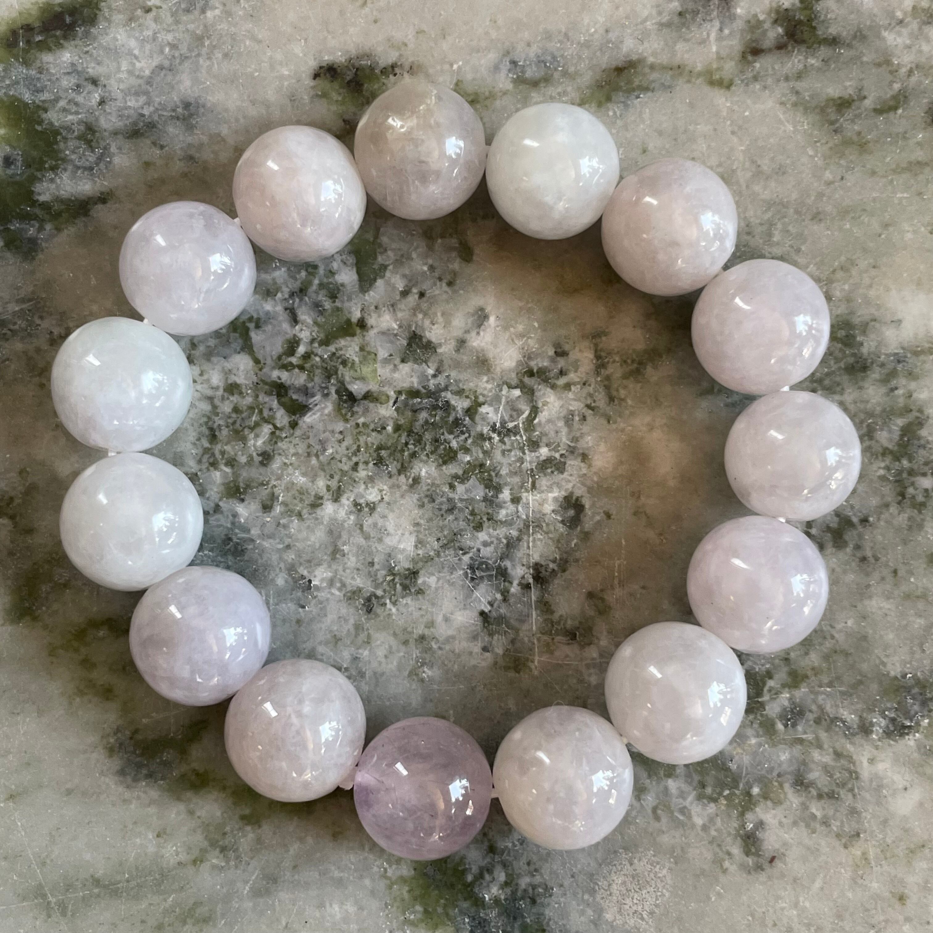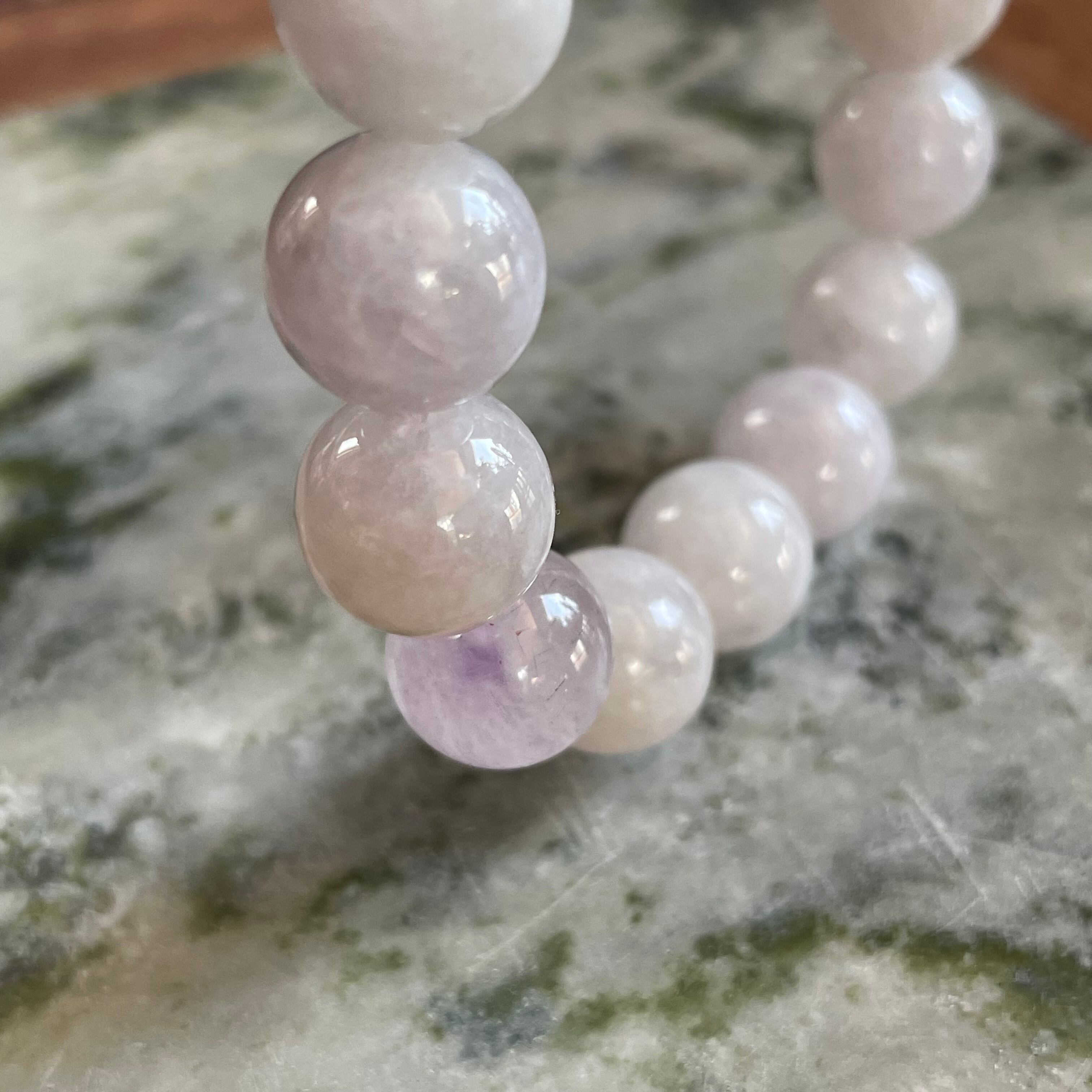淡い淡いほんのりラベンダー色の翡翠にパープルルチルクォーツが一粒入った春らしい色合いのブレスレットです。大粒なので、しっかりと石のお色目や美しさを味わうことができます。