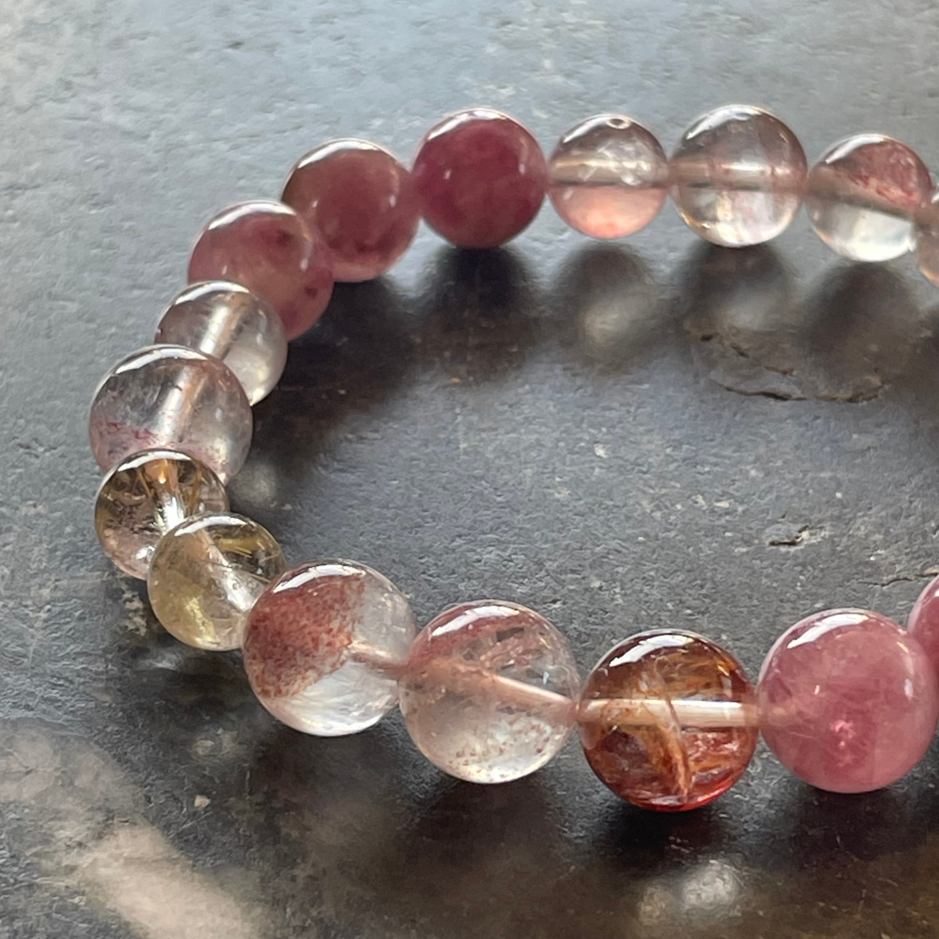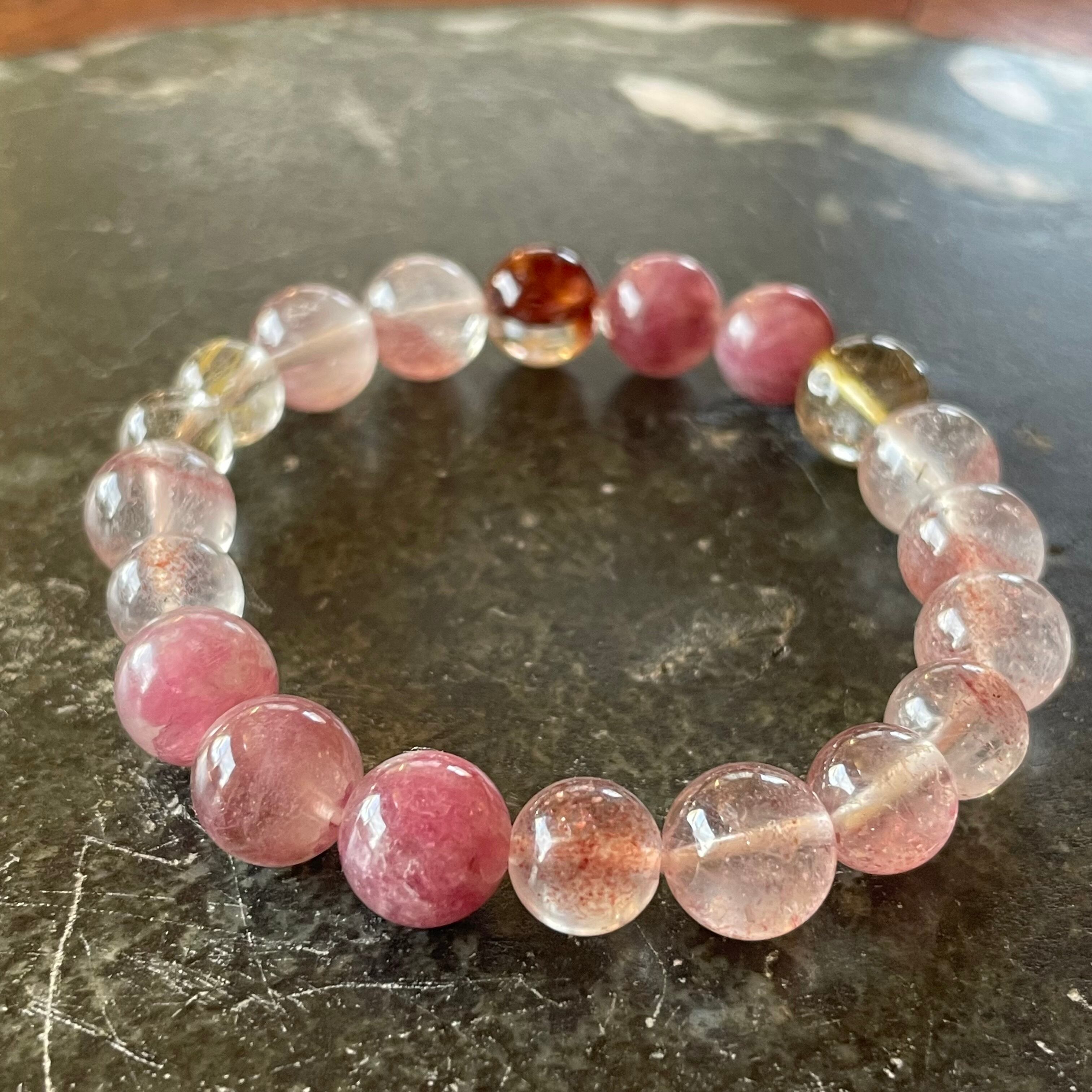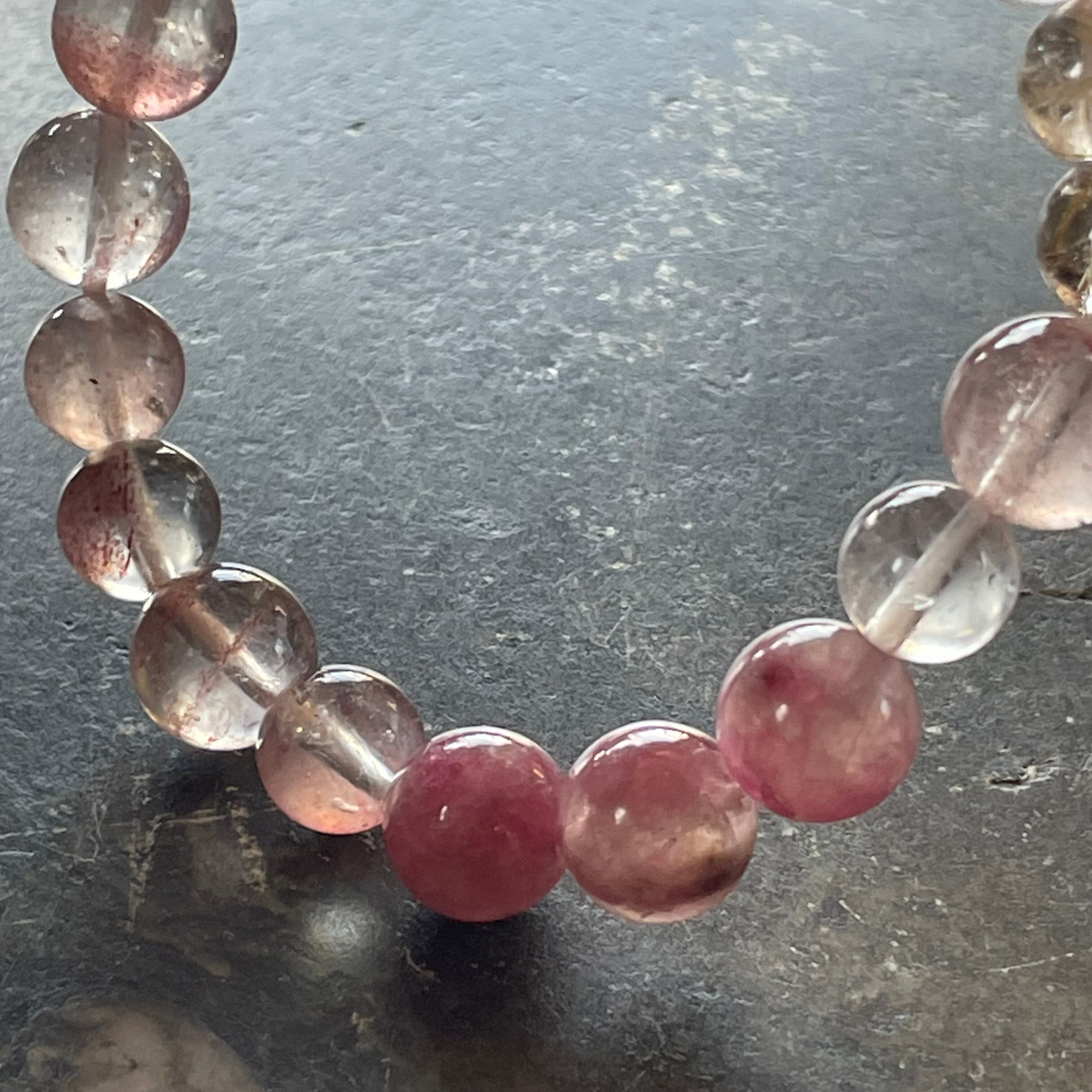 透明感のある淡いピンクのストロベリークォーツをベースに落ち着いた大人なピンクのチェリートルマリンのブレスレットです。ゴールドルチルクォーツの輝きもスパイスとして入っています。