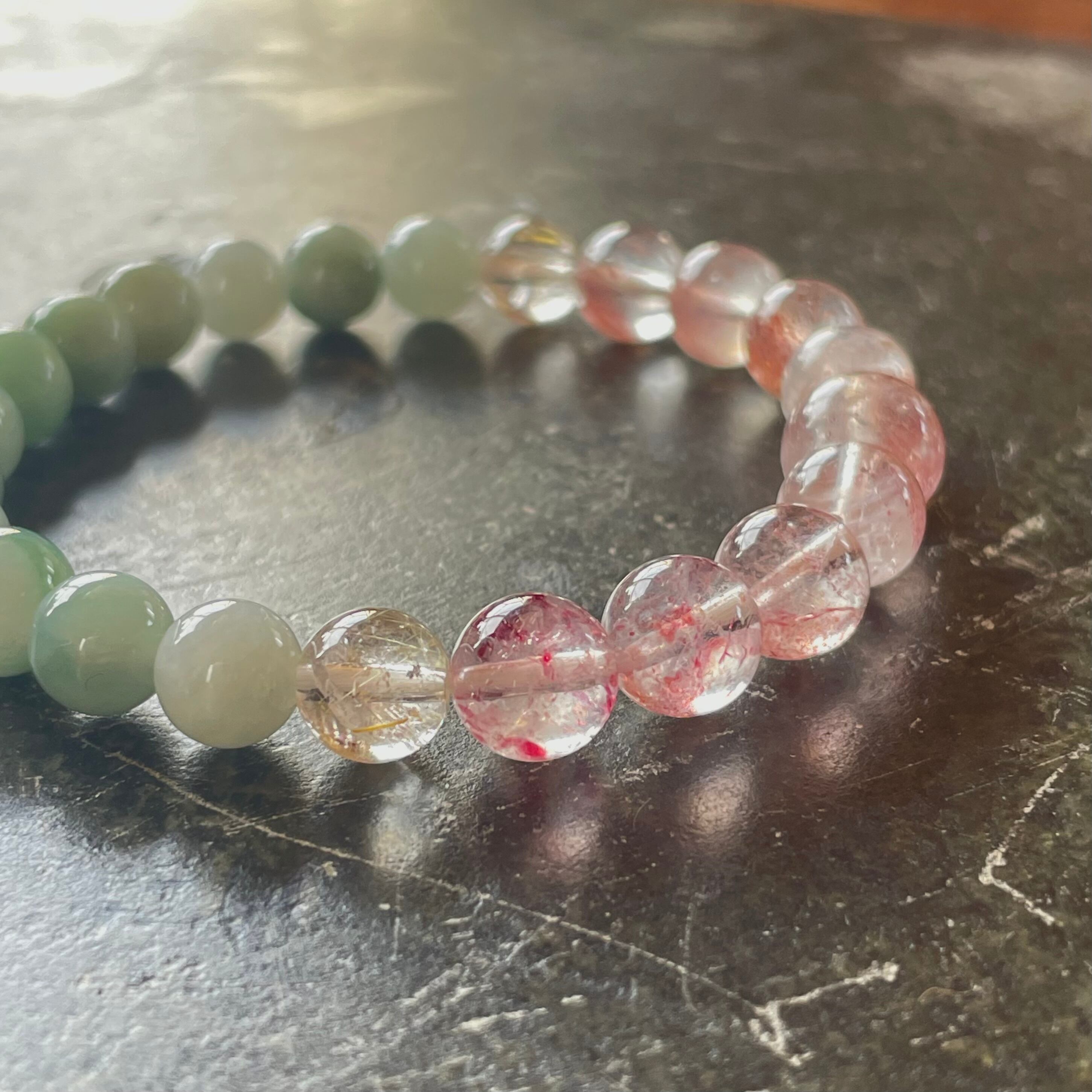 春らしい色合いの可愛いピンクのストロベリークォーツに、新芽を思わせる翡翠を合わせたブレスレットです。ゴールドルチルクォーツを入れて煌めきもプラス。