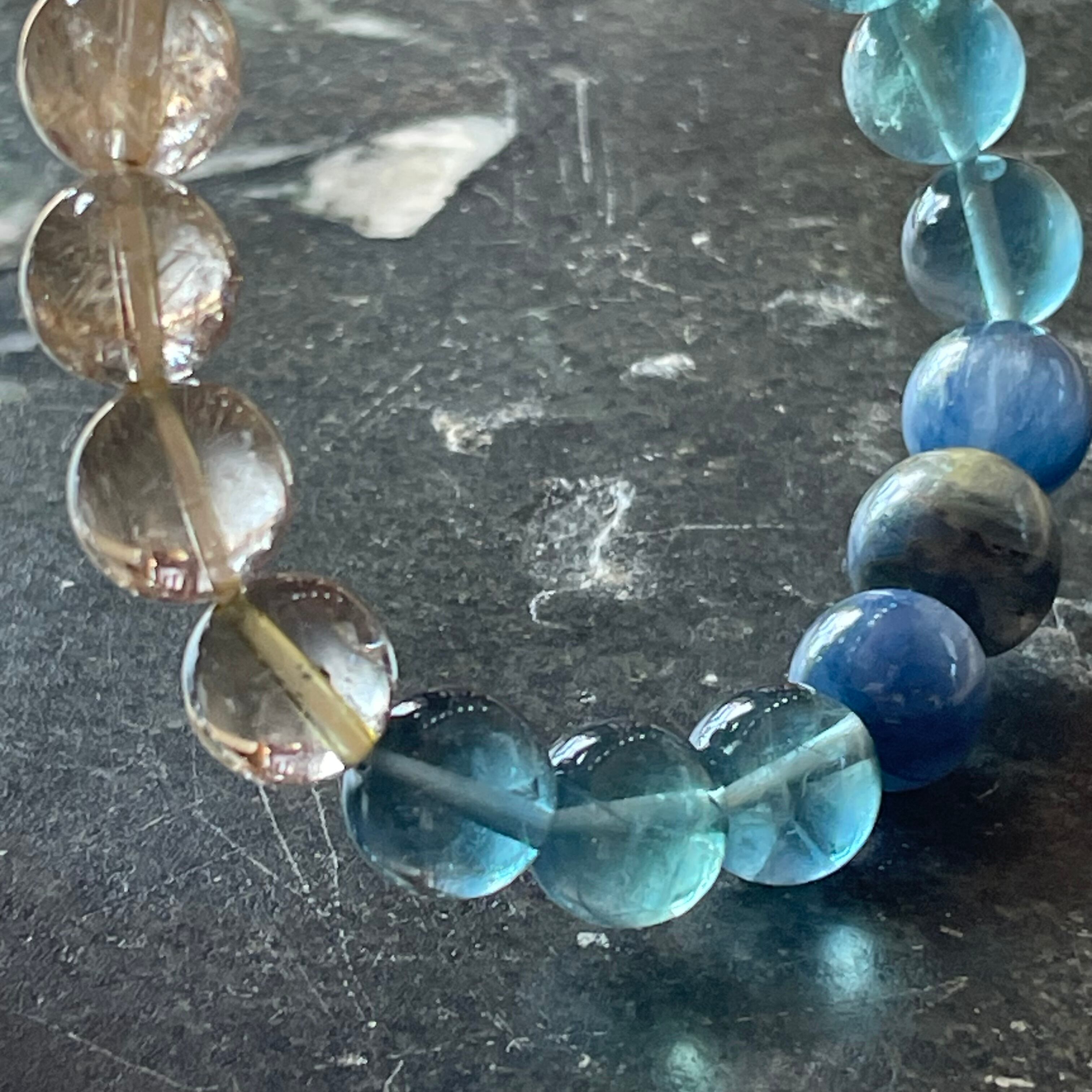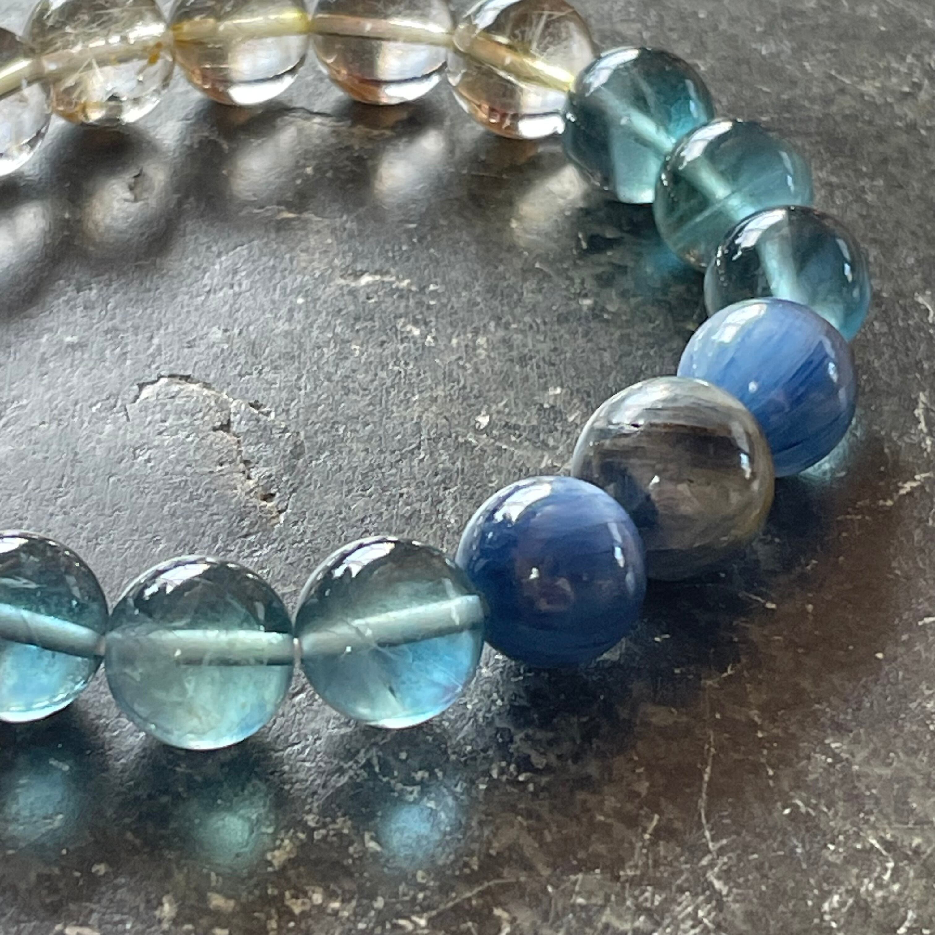 マルチカラーカイヤナイト、カイヤナイトキャッツアイ、ブルーフローライト、ゴールチルクォーツを組み合わせて