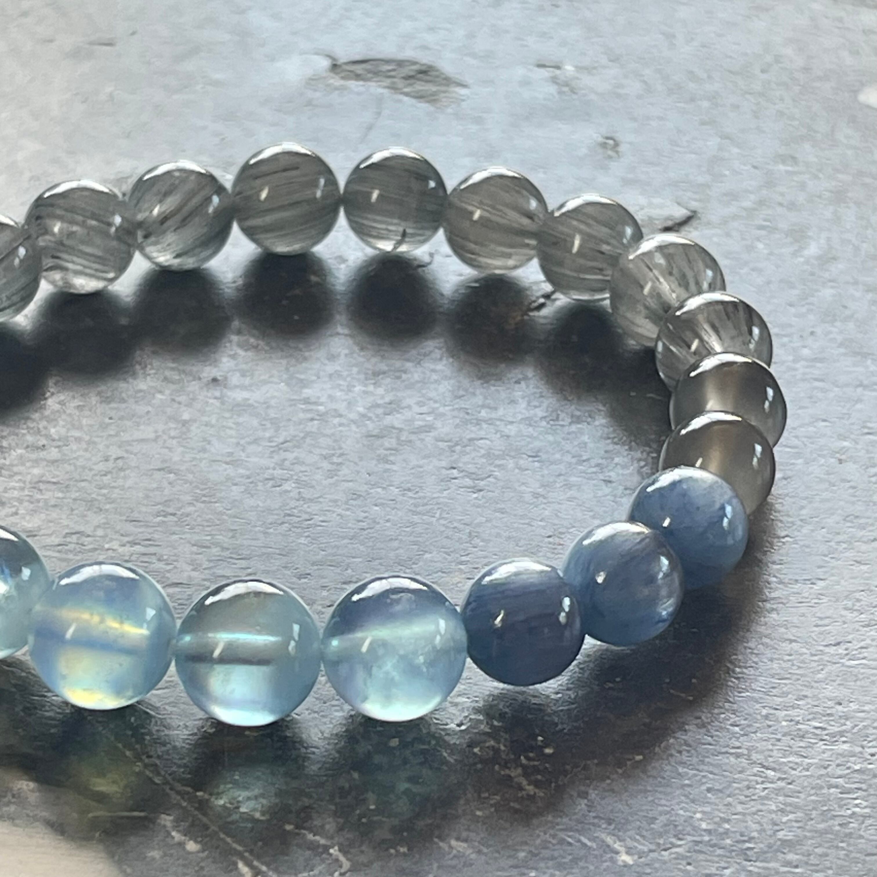ブルールチルクォーツ、カイヤナイトキャッツアイを合わせて少し落ち着いた優しい雰囲気になりました。
