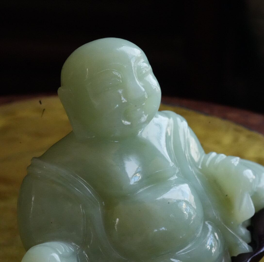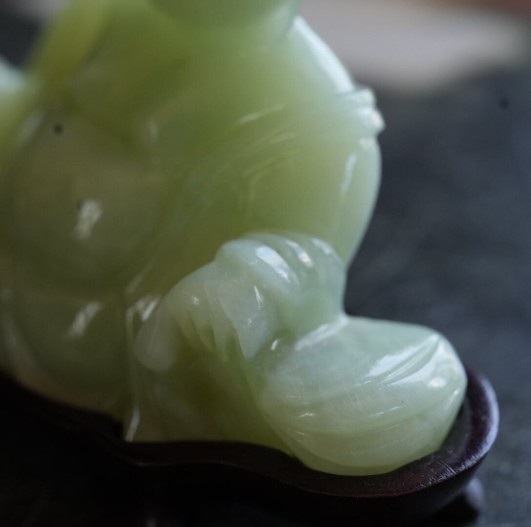 玉石の優しい翠色と艶が布袋さまの福々しい様子を見事に表しています。でっぷりとしたお腹に