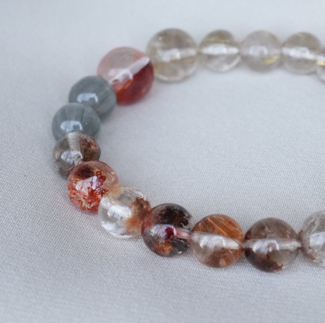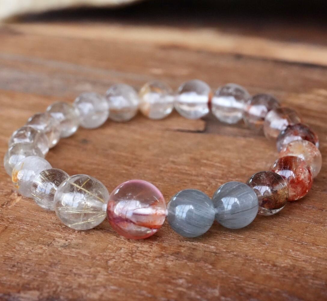 マルチカラーガーデンクォーツ、レッドヘマタイトクォーツ、ブルールチルクォーツ、ゴールドルチルクォーツの4種類のルチルを集めてブレスレットにしてみました。ガーデンクォーツの力強いエネルギーは、他の天然石には感じられない魅力があります。