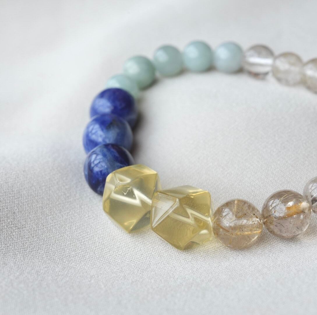 立体感のある大きめのレモンクォーツに、濃い青にほんのりマーブル模様の入った大粒のソーダライトを合わせて少し個性的ブレスレットにしてみました。