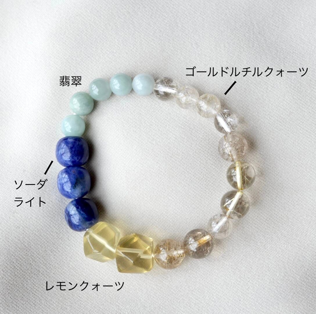 優しい翠色の翡翠、透明感のあるゴールドルチルクォーツで爽やかにまとめています。