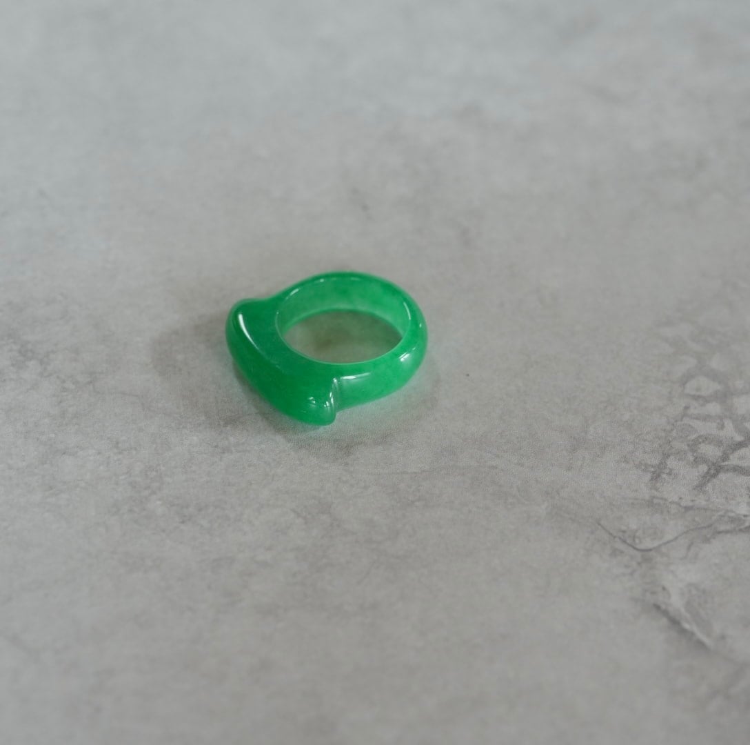 鮮やかな翠色が目を惹く翡翠のリングです。こちらは翡翠に染色加工をして鮮やかにしています。緑色の持つ心落ち着けるパワーを感じられるリングです。