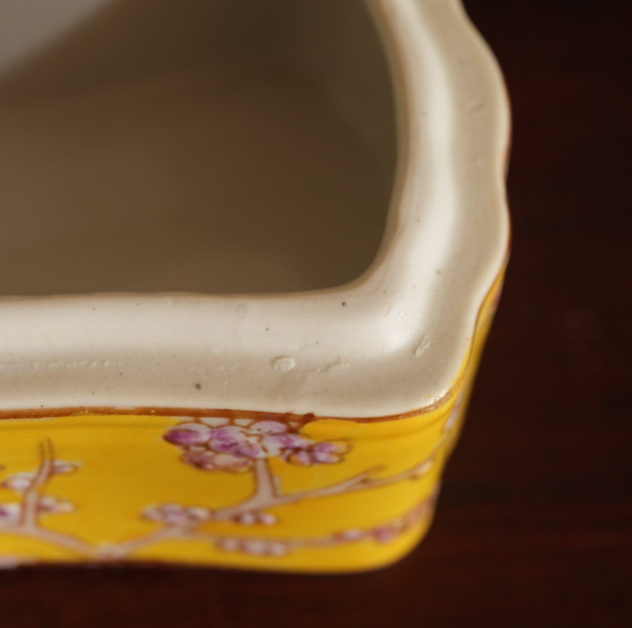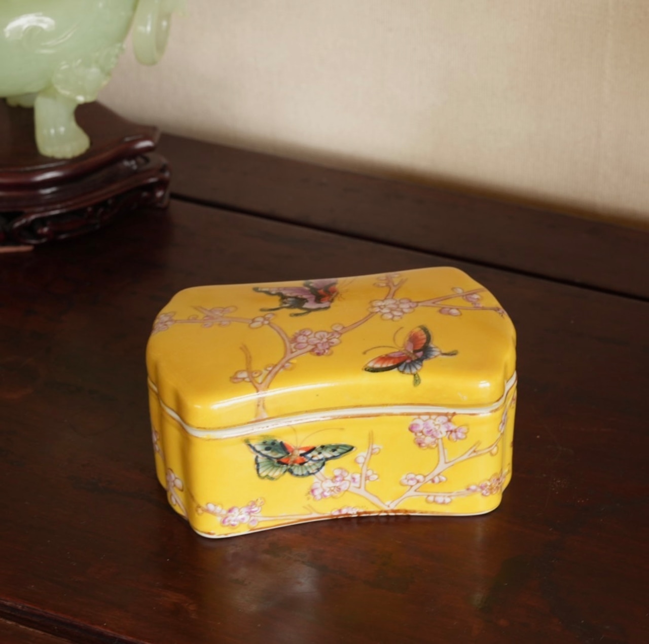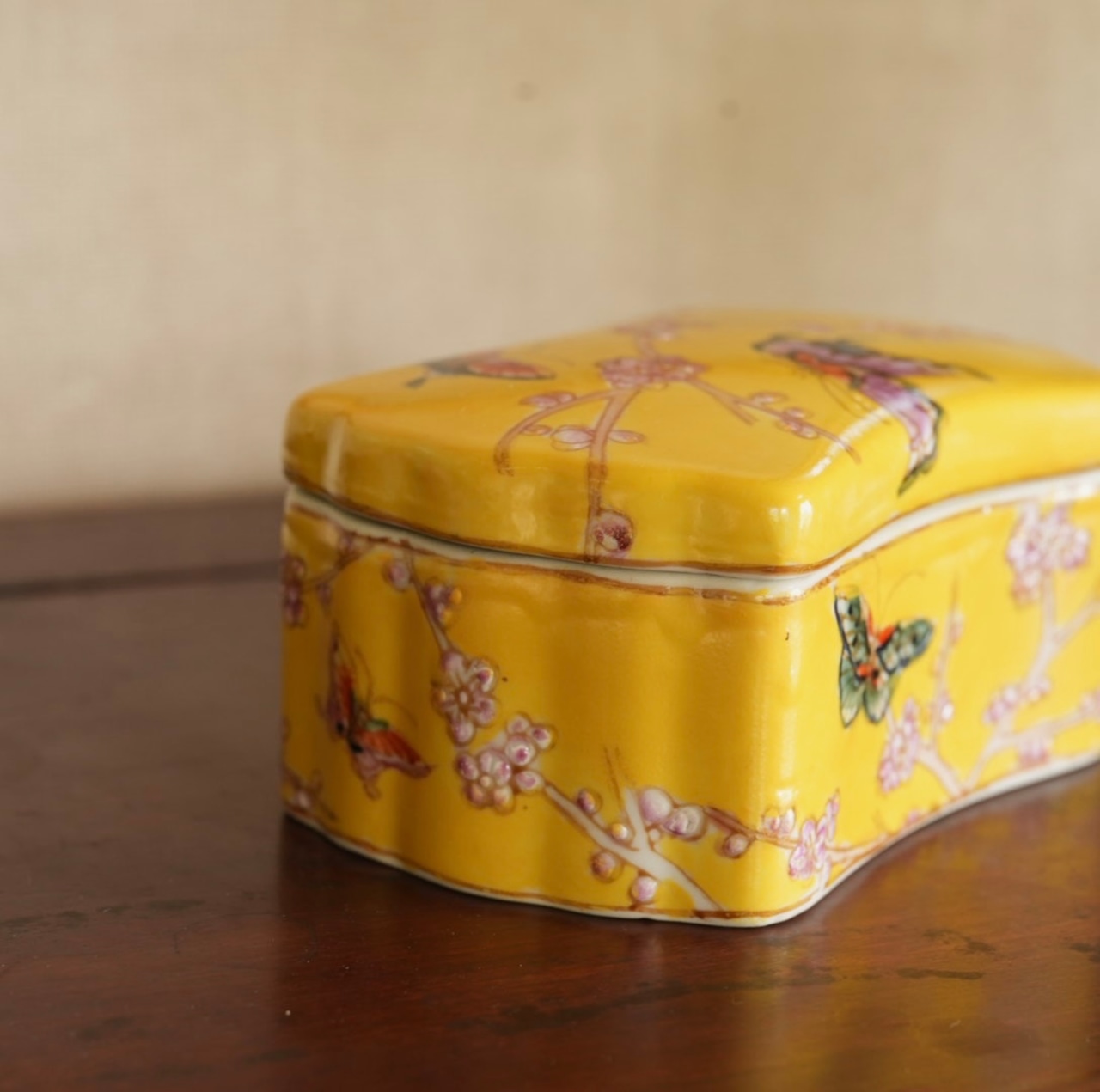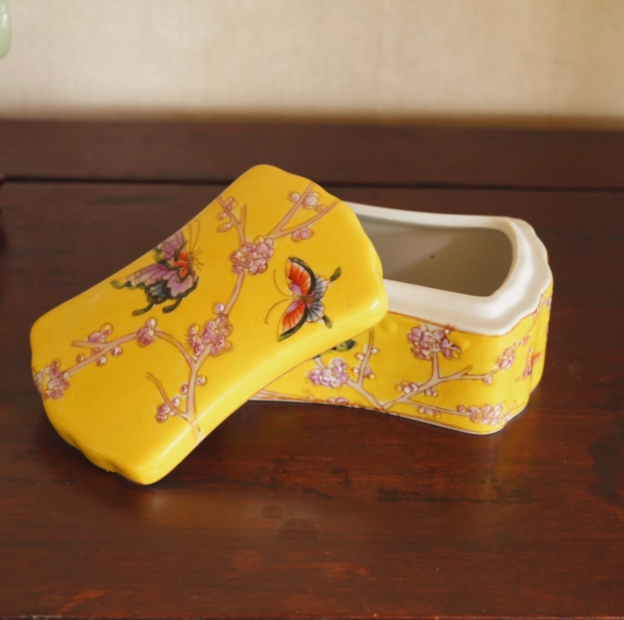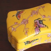 シノワズリーインテリアを象徴する枕形、手描きの蝶々と梅の絵、はっきりとした黄色にも心惹かれます。
