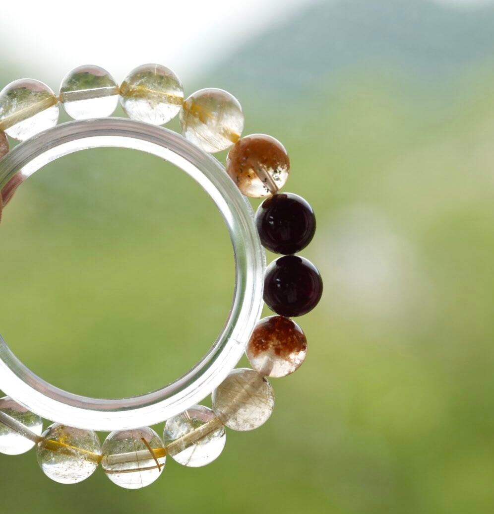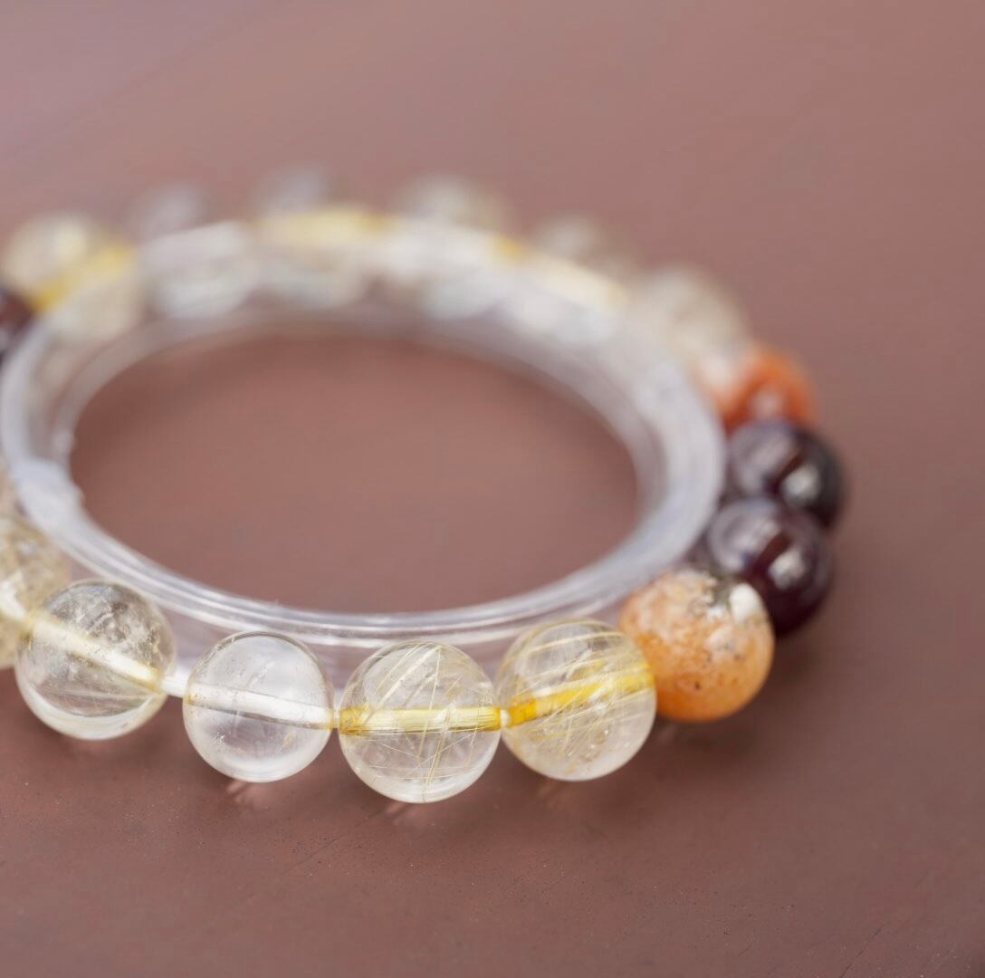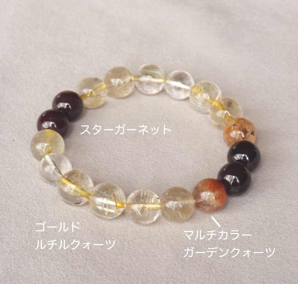 透明感のあるゴールドルチルクォーツを主役にしたブレスレット。ルチルもたくさん入っていて、金運アップが期待できそうです。深いざくろ色のスターガーネットで全体を引き締めています。二粒入っている透明度の高いマルチカラーガーデンクォーツで個性的なブレスレットに仕上がりました。