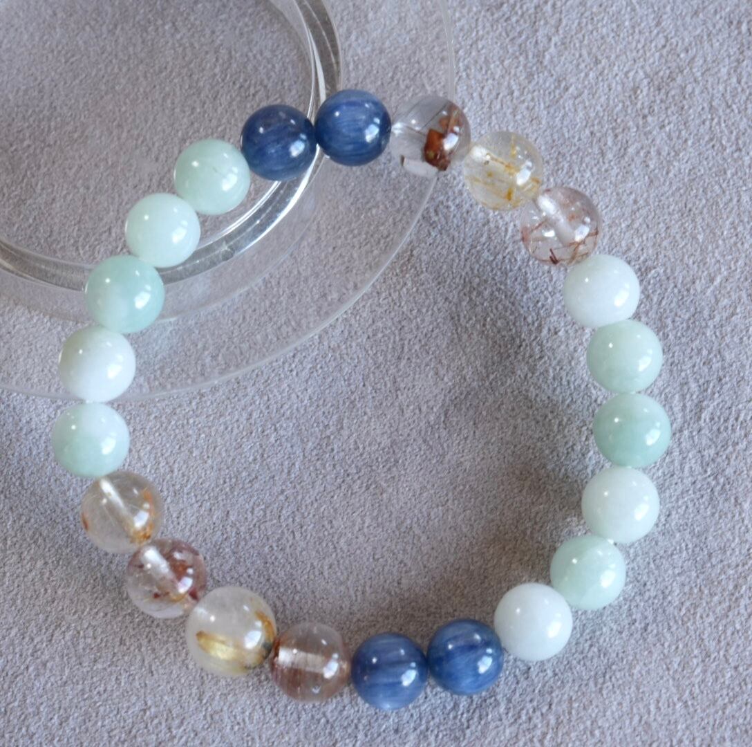 なんとも言えないやわらかな翠色の翡翠を主役に、凛とした藍色が美しいカイヤナイキャッツアイを組み合わせています。マルチカラーガーデンクォーツを加えて神秘的なブレスレットに、タイチンルチルで金運を願います。肌馴染みも良く合わせやすいので、毎日つけたくなるブレスレットです。