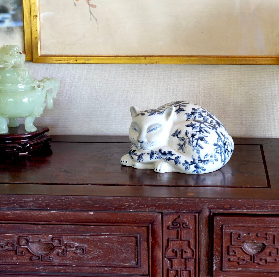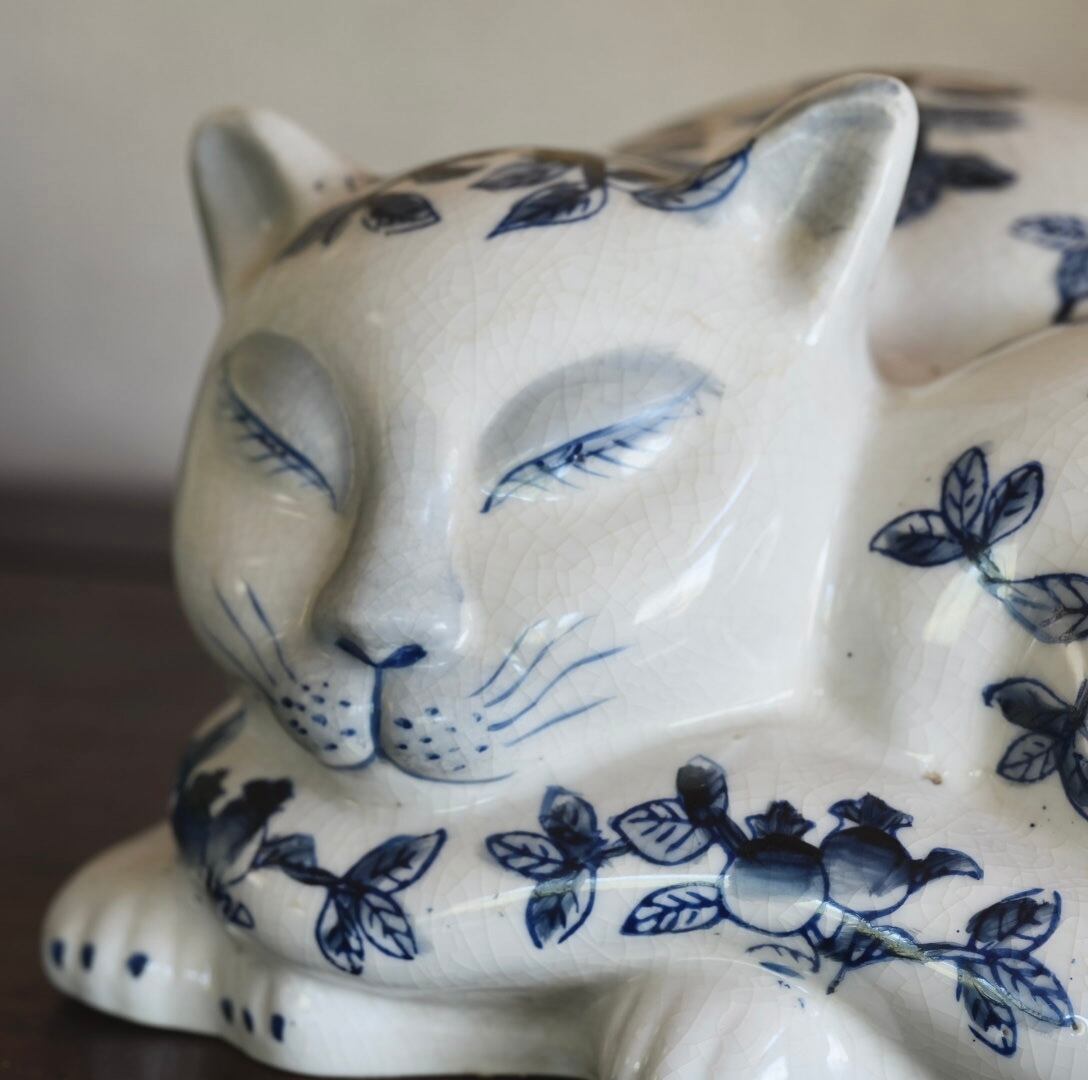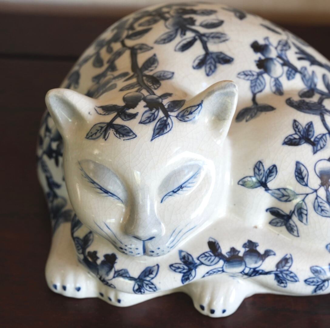 【再入荷】シノワズリー柄 大きな猫オブジェ 染付け 手描き