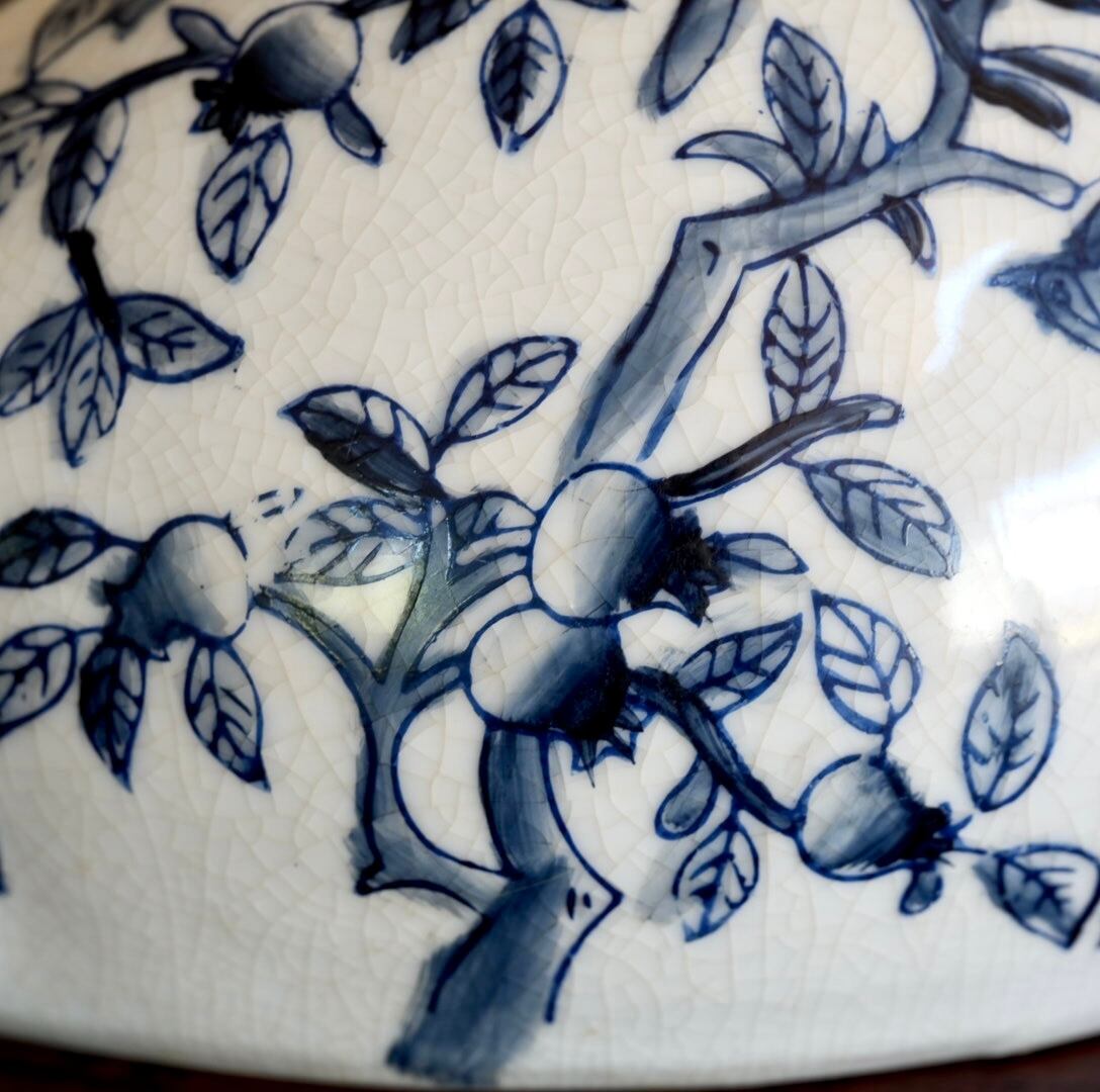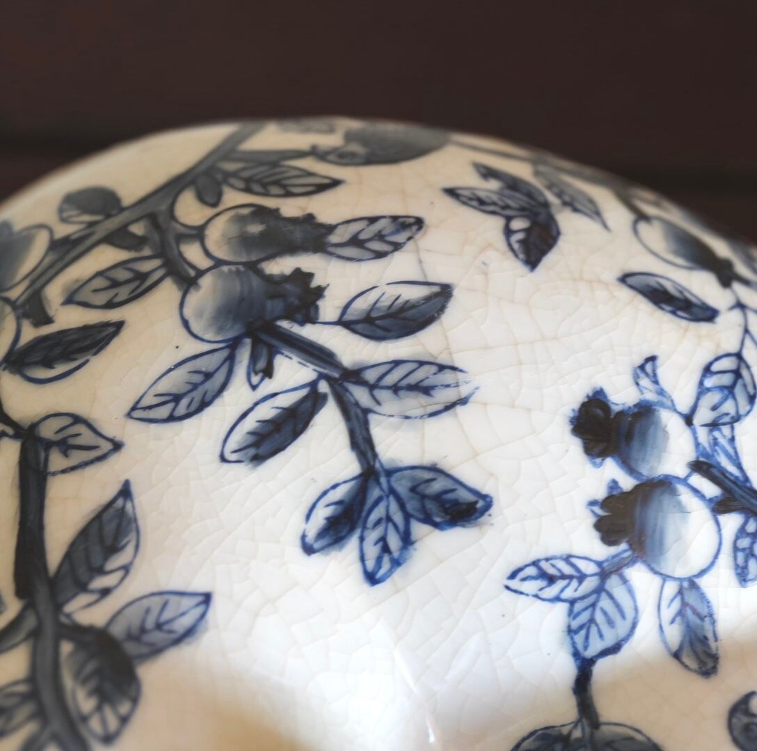 優雅にくつろぐ猫の陶器オブジェ。シックな藍色で縁起の良い桃と鳥が手描きされています。