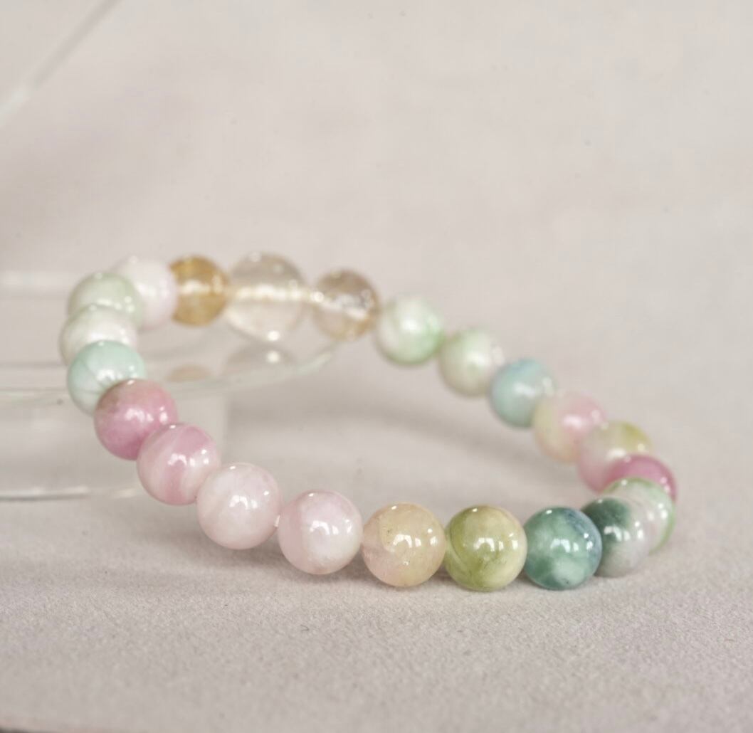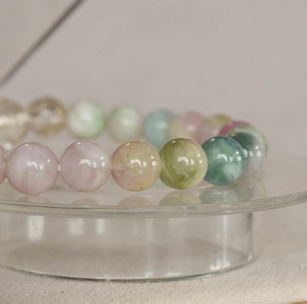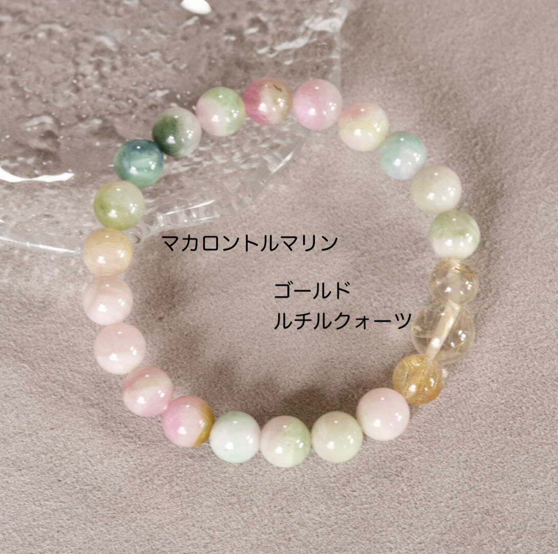 マカロンカラーのトルマリン、その名の通りスイートでキュートな色合いのトルマリンです。秋桜のようなピンクに白を混ぜた色、草原のような緑色、トルマリンにしかない独特の色目にたちまち引き込まれていきます。ゴールドルチルクォーツで金運アップと少し抜け感を。