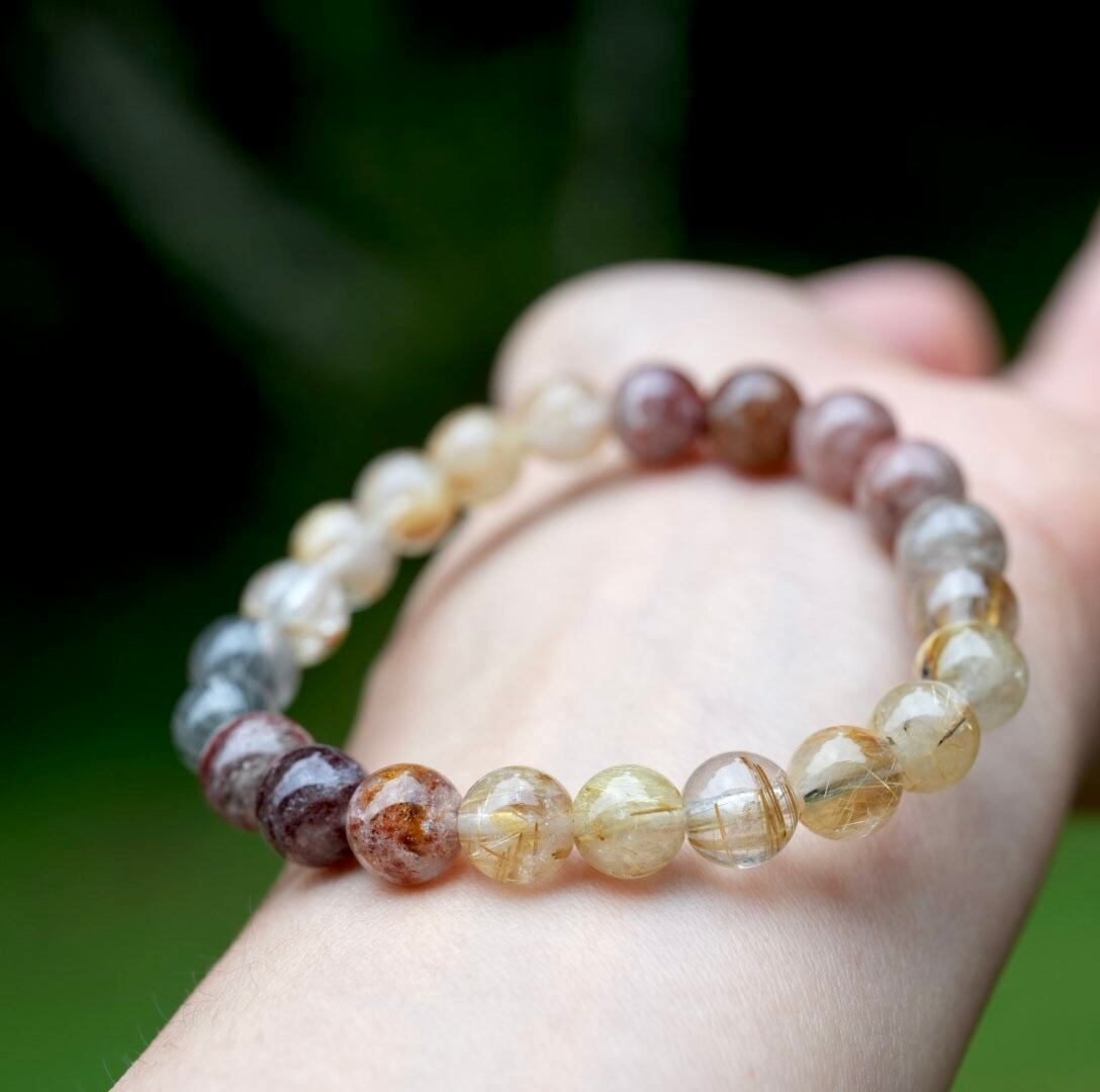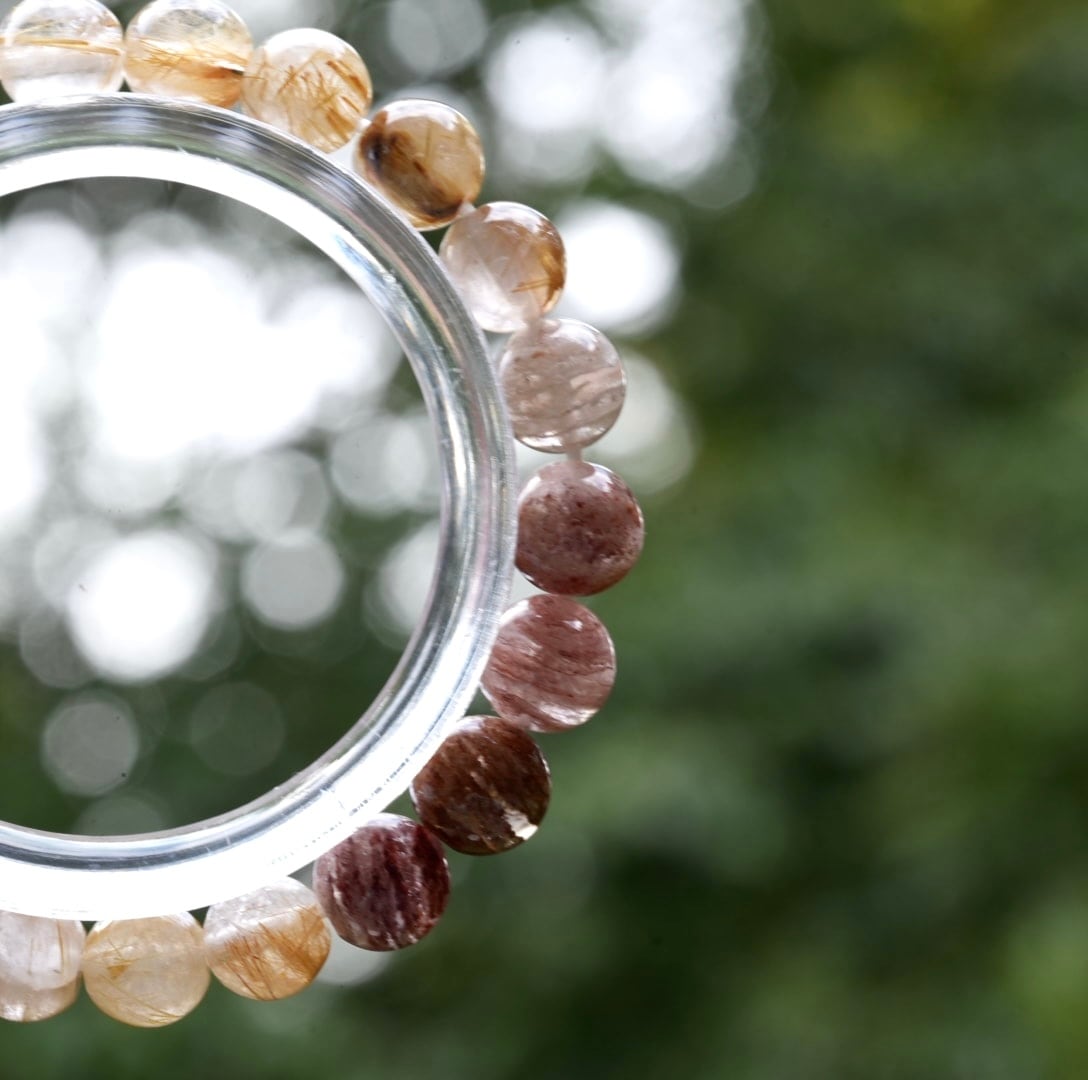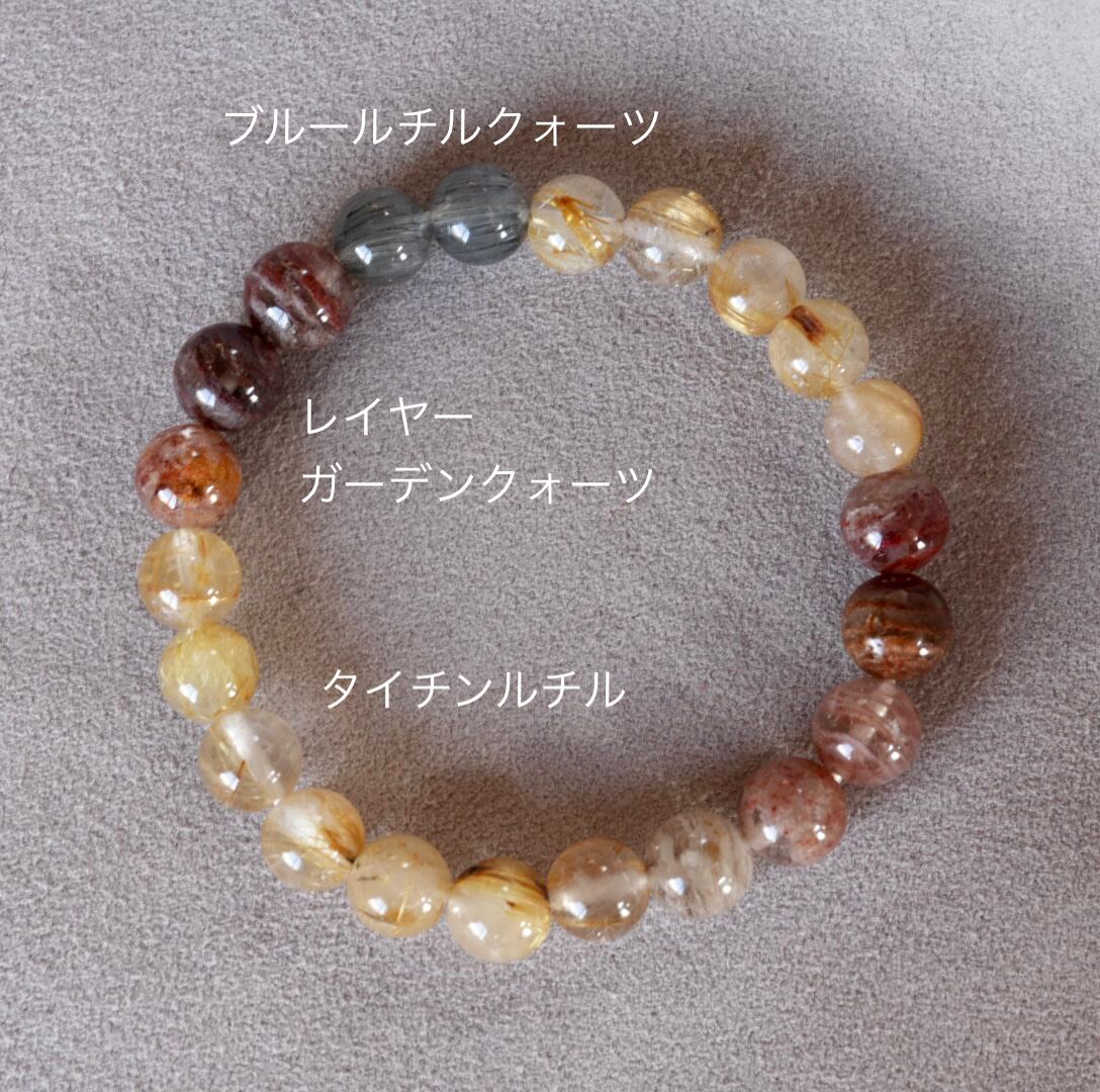 一粒の中にぎゅっと煌めきが詰まった美しいタイチンルチル。落ち着いた色合いのレイヤーガーデンクォーツ、ブルールチルクォーツを合わせて秋らしい色合いのブレスレットになりました。