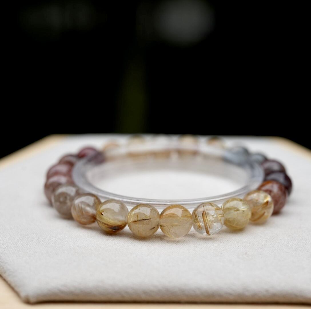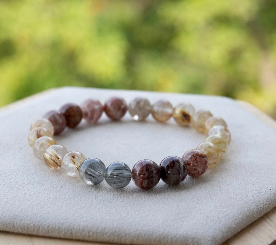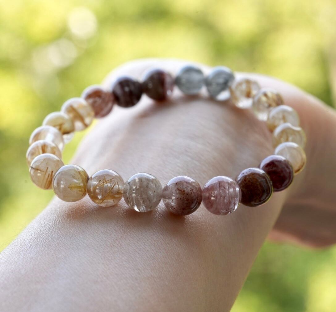 一粒の中にぎゅっと煌めきが詰まった美しいタイチンルチル。落ち着いた色合いのレイヤーガーデンクォーツ、ブルールチルクォーツを合わせて秋らしい色合いのブレスレットになりました。