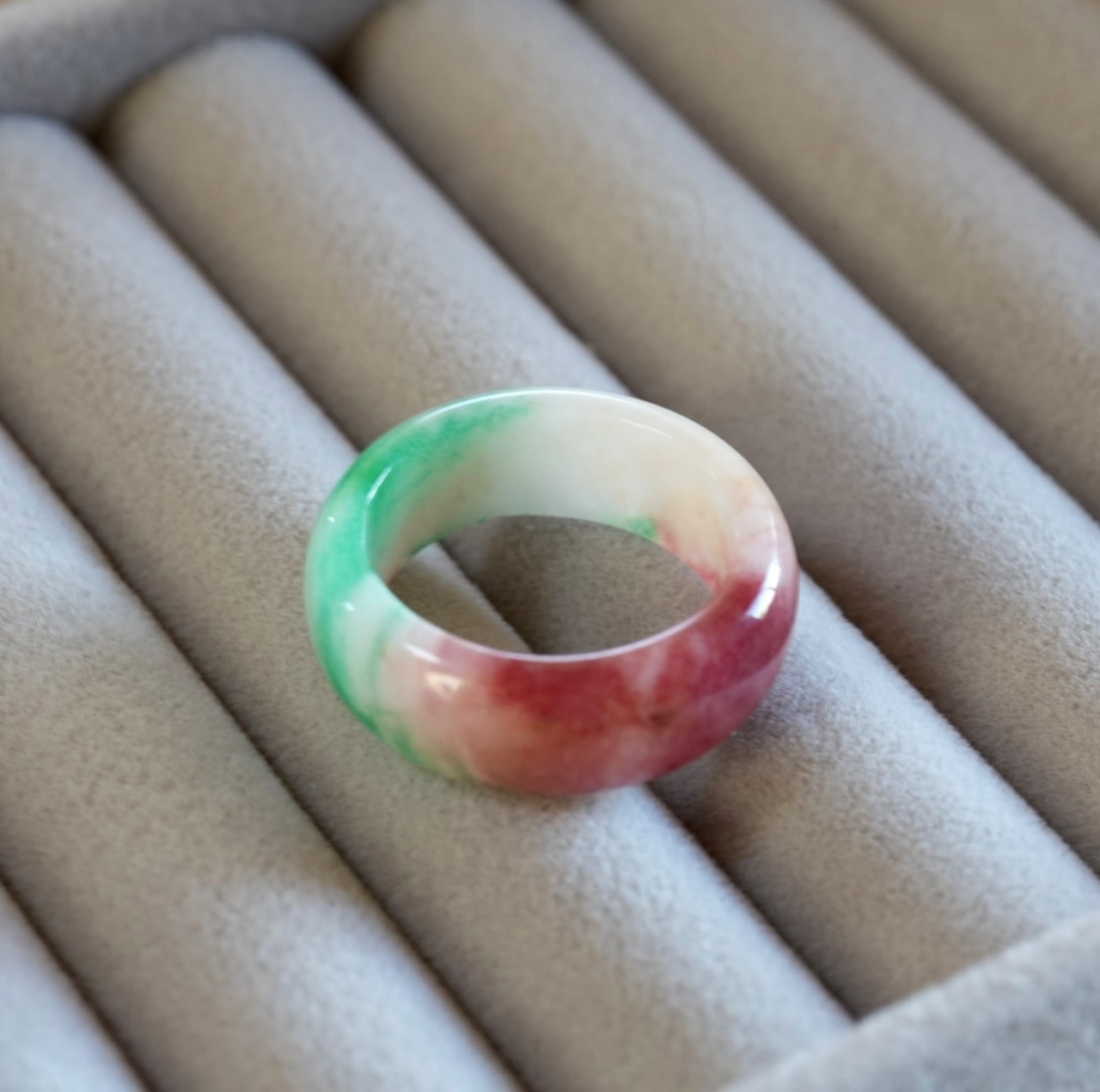 鮮やかな緑色に落ち着いた辰砂のような赤がミックスされた珍しい翡翠のリングです。お色目違いで再入荷しました。
