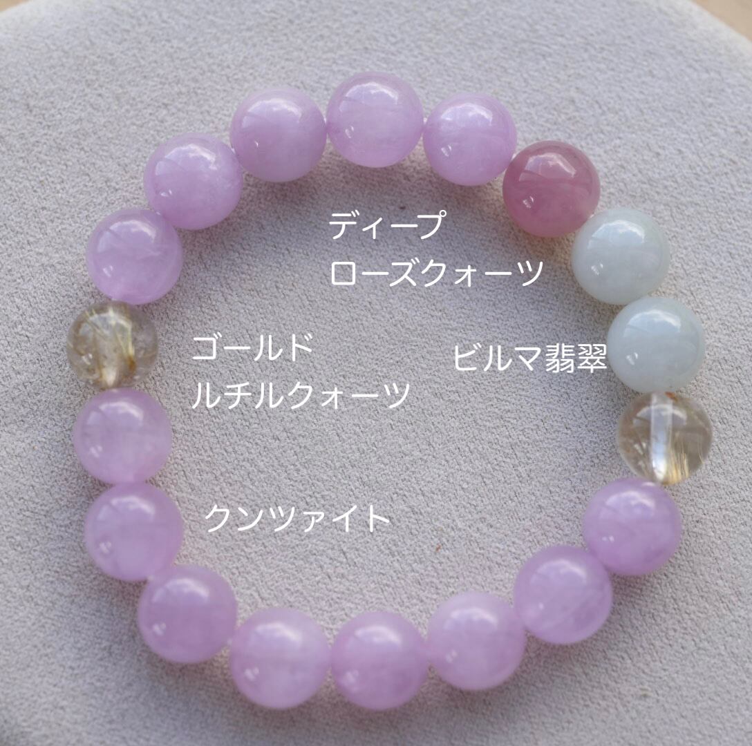 クンツァイトのうるうるとした艶感をしっかりと味わっていただけます。ディープローズクォーツを加えて可愛らしさも忘れずに。