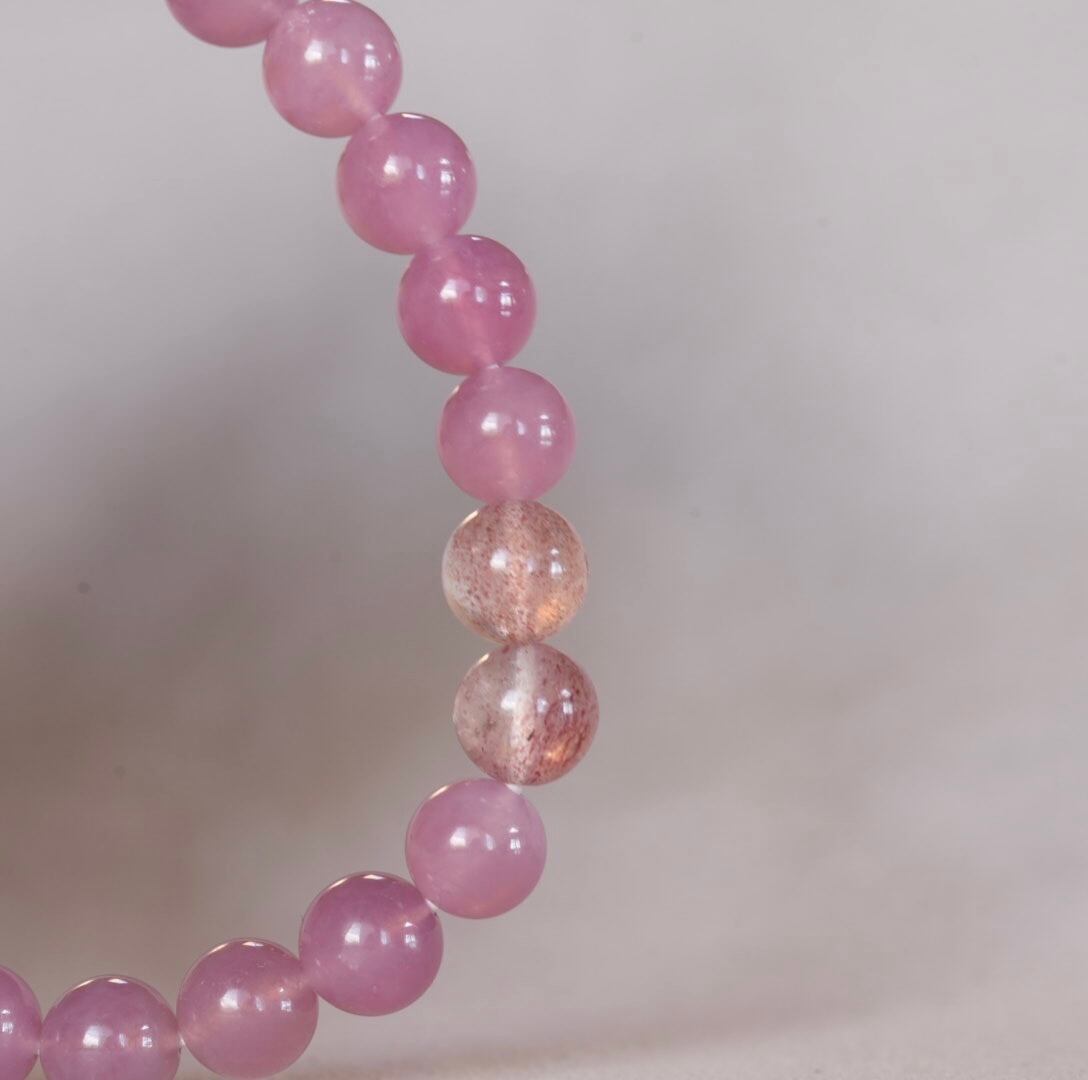 眺めているだけで気持ちが華やぐディープローズクォーツのブレスレット。ストロベリークォーツとゴールドルチルクォーツでさりげなく動きをつけてみました。
