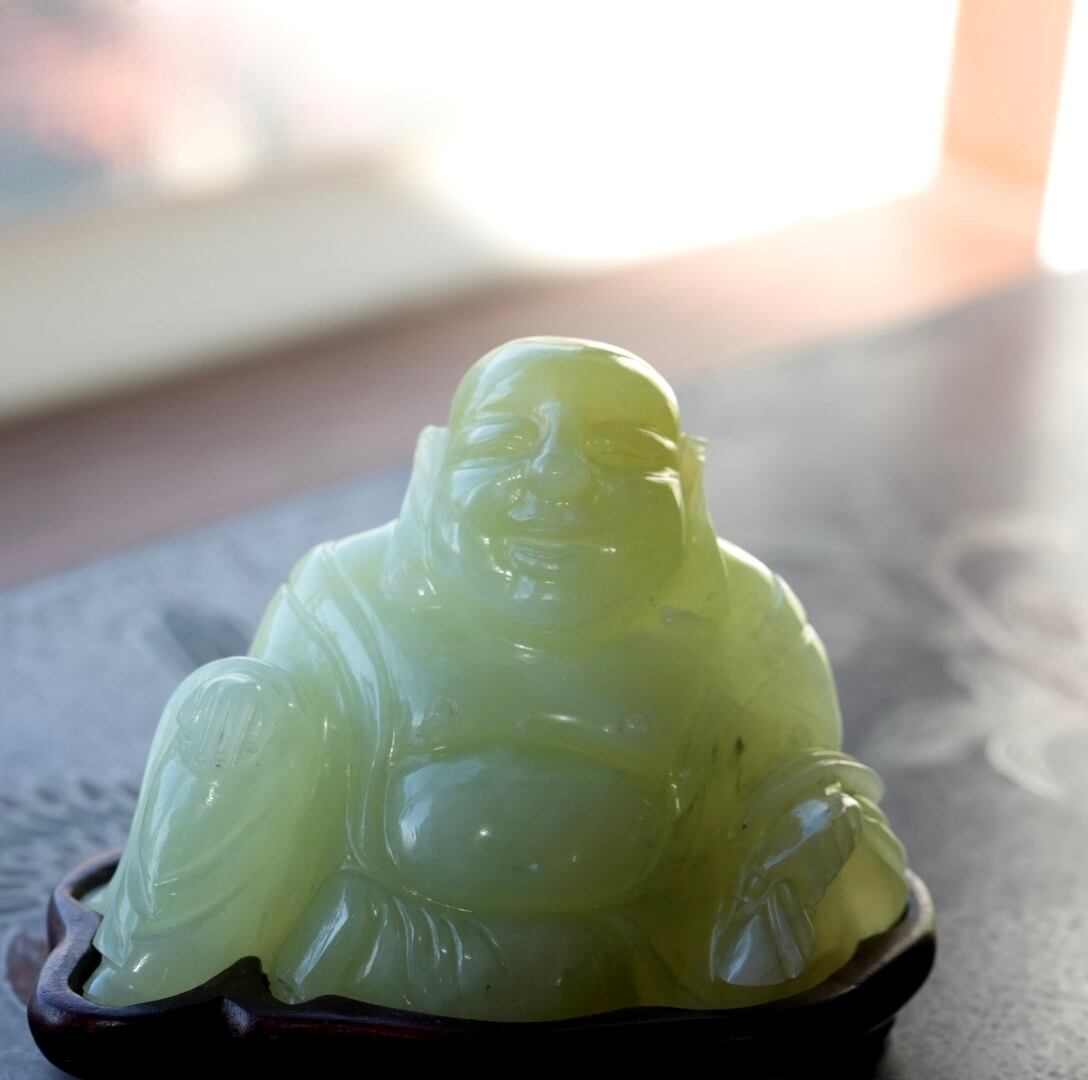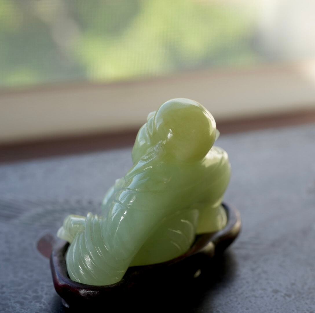 玉石の優しい翠色と艶が布袋さまの福々しい様子を見事に表しています。でっぷりとしたお腹にツヤツヤの頭、いっぱい撫でるとさらに玉石が輝いて来ますよ。