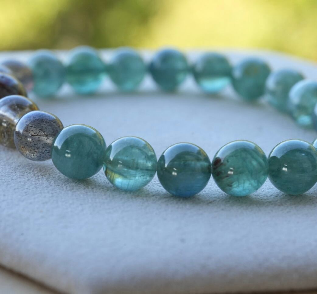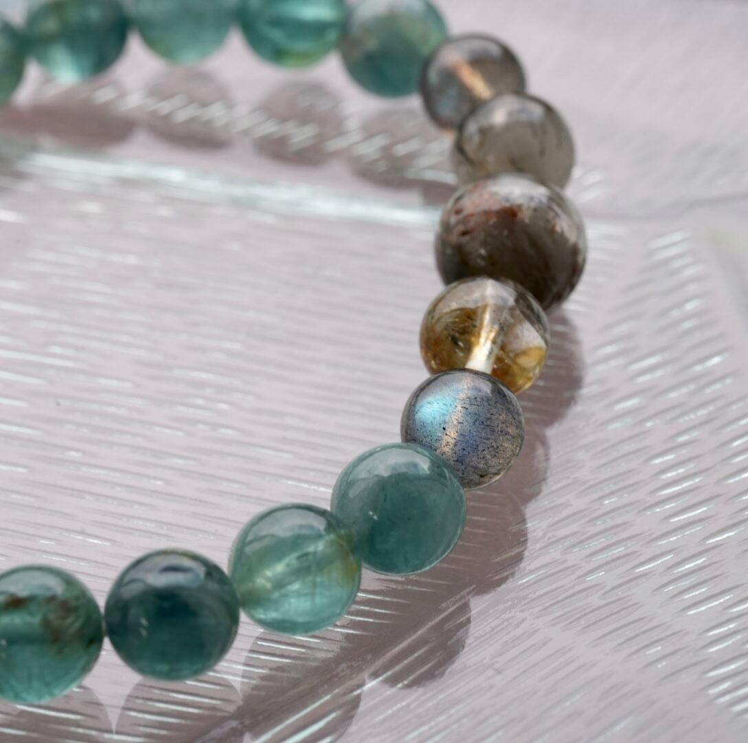 ブルーグリーンの色目です、とひとことでは言い表せない「グリーンカイヤナイトシリカ」グリーンの落ち着いた色合いに、透明感と艶が含まれることで、おとなしくなりすぎることが無い素敵な石です。光の加減で深い緑や明るくかわいらしい緑に見えるので、眺めていて飽きることがないですね。神秘的なガーデン水晶、ラブラドライトを加えて森林浴をしているイメージに仕上げました。